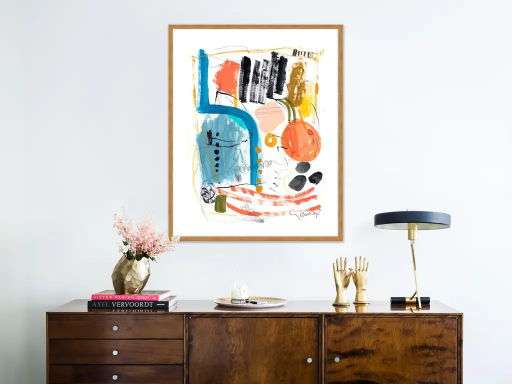 DESCRIPTION: Gathering by Lesley Grainger in Gold Frame, Medium Art Print SPECIFICATIONS: Type: Framed Paper. Framed Size (in): 29x36. Orientation: Vertical. Flush/Float/Matted: matted. Frame Color: Gold. Hanging Hardware: Picture Perfect. FRAMING: Each art work arrives framed and ready to hang. We use handmade frames with a plexiglass glazing front, because it offers less glare than standard glass. At this time, we only offer framed prints. ARTIST BIO: Lesley Grainger was born in Yorkshire, England, where she grew up in a small Northern fishing town and currently resides in Orange County, California. She received a B.A. in Illustration and Design from the University of Lincoln. Early in her career, she worked as graphic designer and later began to produce children’s books and licensed artwork. For the last several years her main focus and passion has been abstract painting. She works intuitively and thoughtfully while discovering new and interesting colors and compositions. Painting is a reflection of experience and what Lesley has found is that each painting is translated to the next, like an ongoing story. Discovery is key in Lesley's expression, as she works with the canvas, adding and removing elements. This pushes her to new levels and brings a sense of how art can change the way we think, feel, and connect with the world.