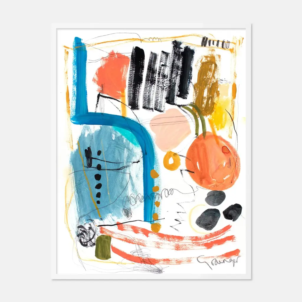 DESCRIPTION: Gathering by Lesley Grainger in White Frame, Small Art Print SPECIFICATIONS: Type: Framed Paper. Framed Size (in): 19x24. Orientation: Vertical. Flush/Float/Matted: Flush. Frame Color: White. Hanging Hardware: Picture Perfect. FRAMING: Each art work arrives framed and ready to hang. We use handmade frames with a plexiglass glazing front, because it offers less glare than standard glass. At this time, we only offer framed prints. ARTIST BIO: Lesley Grainger was born in Yorkshire, England, where she grew up in a small Northern fishing town and currently resides in Orange County, California. She received a B.A. in Illustration and Design from the University of Lincoln. Early in her career, she worked as graphic designer and later began to produce children’s books and licensed artwork. For the last several years her main focus and passion has been abstract painting. She works intuitively and thoughtfully while discovering new and interesting colors and compositions. Painting is a reflection of experience and what Lesley has found is that each painting is translated to the next, like an ongoing story. Discovery is key in Lesley's expression, as she works with the canvas, adding and removing elements. This pushes her to new levels and brings a sense of how art can change the way we think, feel, and connect with the world.