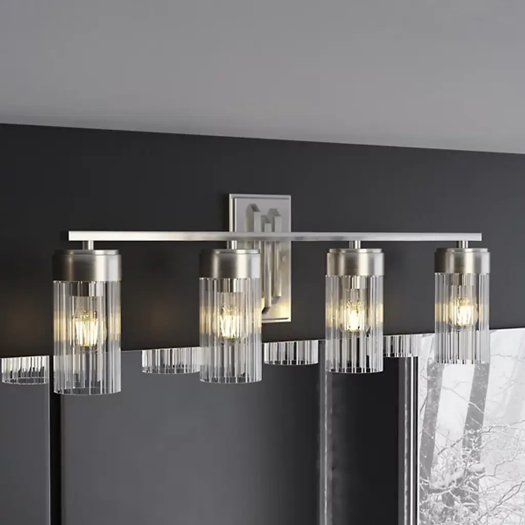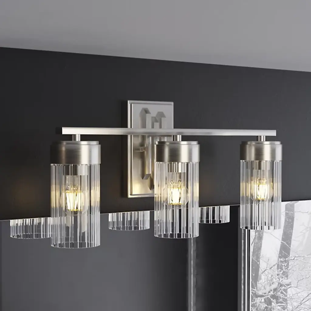 The Gatz Vanity Light from Hunter Fans is a fusion of mid-century modern elegance and contemporary design. The fixture features a refined arrangement of ribbed glass shades, each delicately held in place by the fixture’s streamlined metal framework. Suited to your vanity area, this piece is designed to provide optimal illumination for your daily routines. Gatz is a practical addition to your bathroom or dressing area. You can adjust the brightness level of the LEDs using a separately sold ELV dimmer.