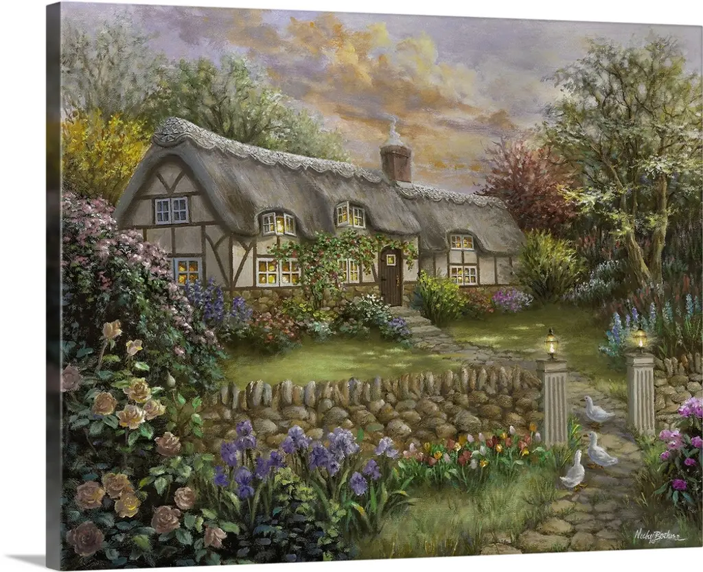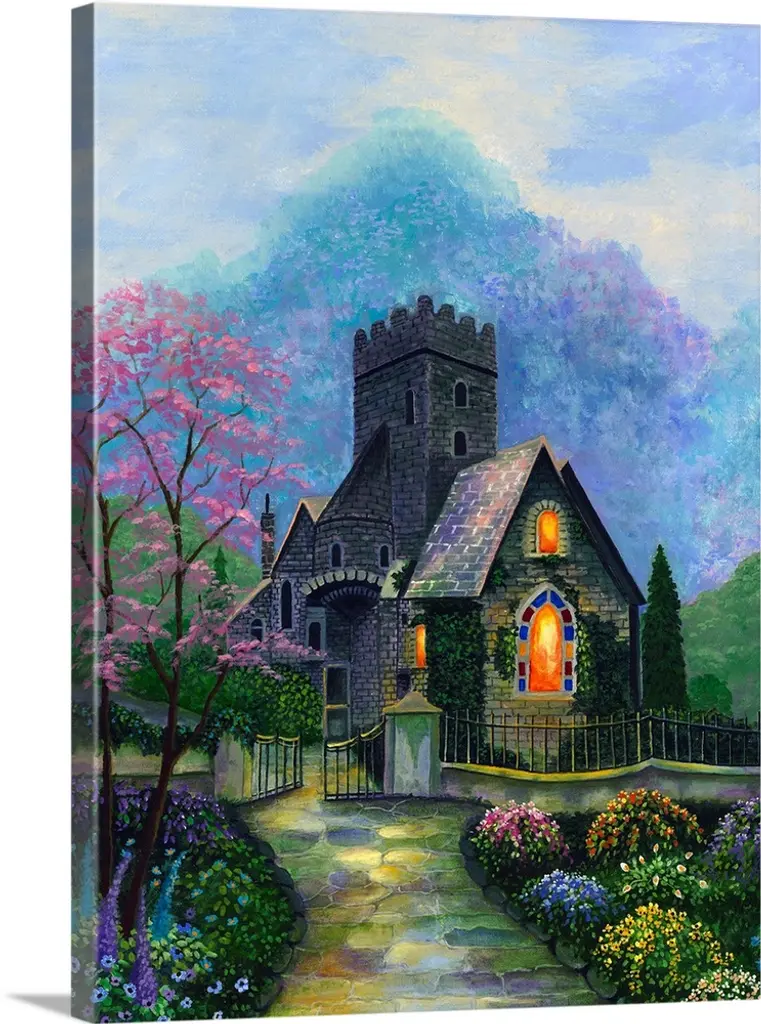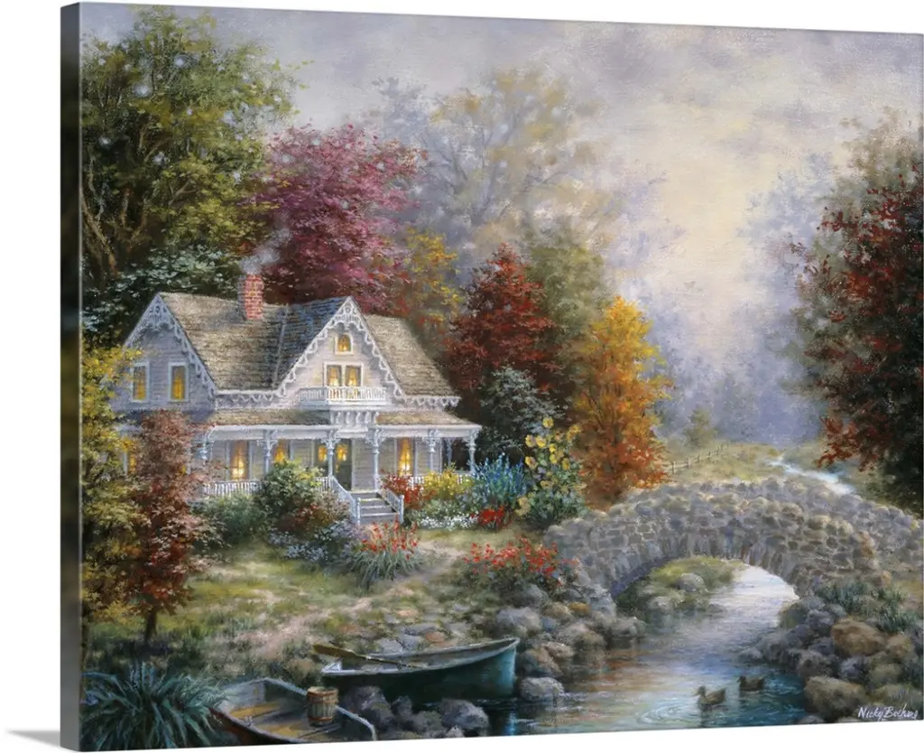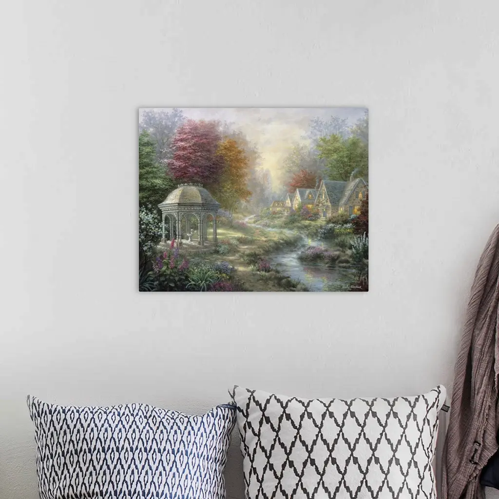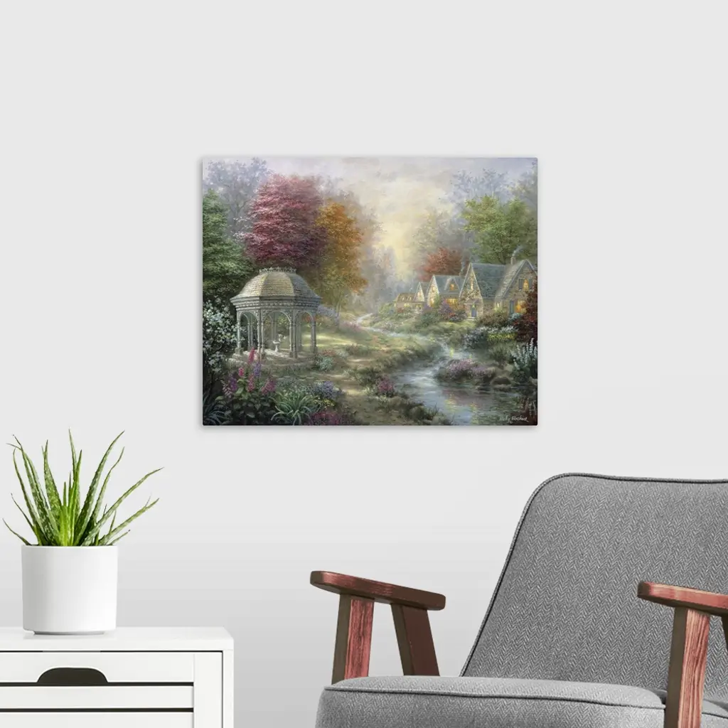 Painting of village scene featuring a large gazebo and houses with glowing windows. Product is a painting reproduction only, and does not contain actual lights.