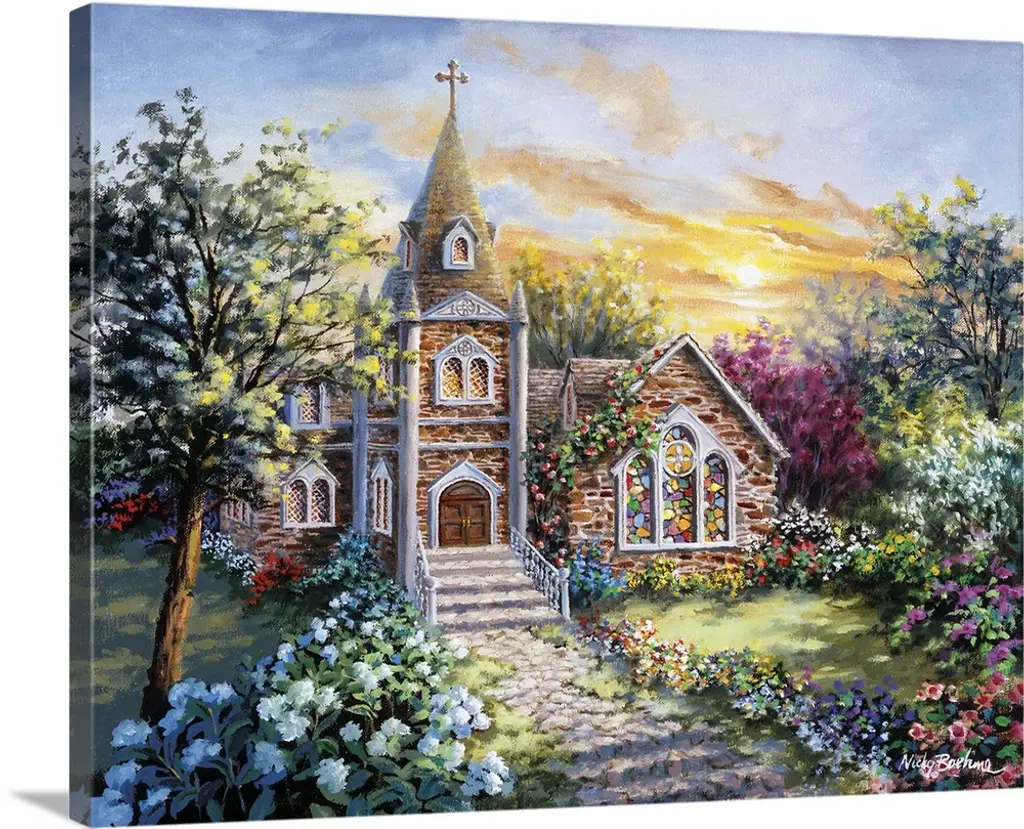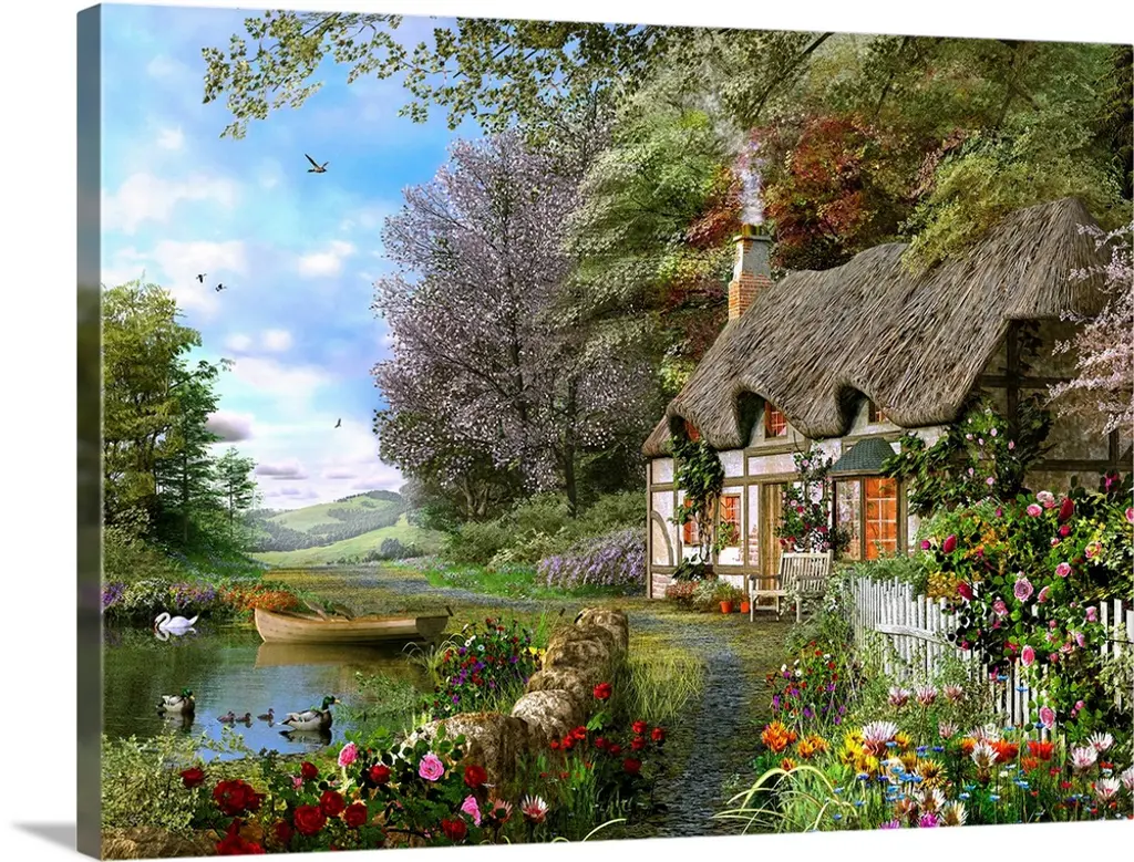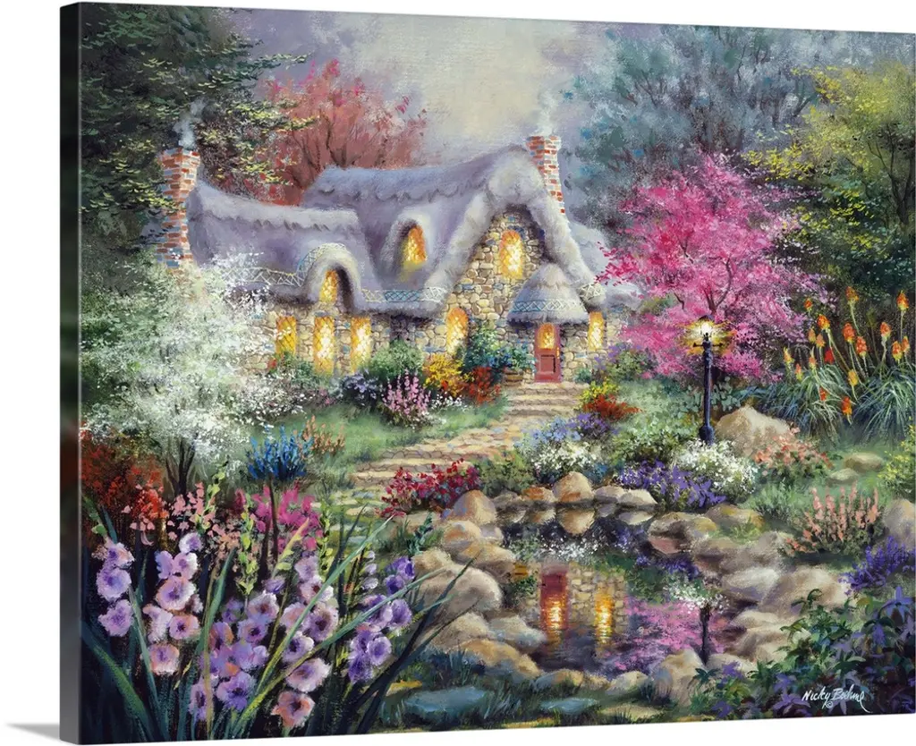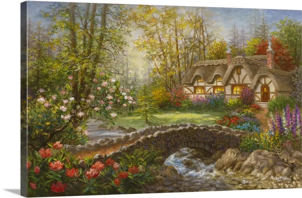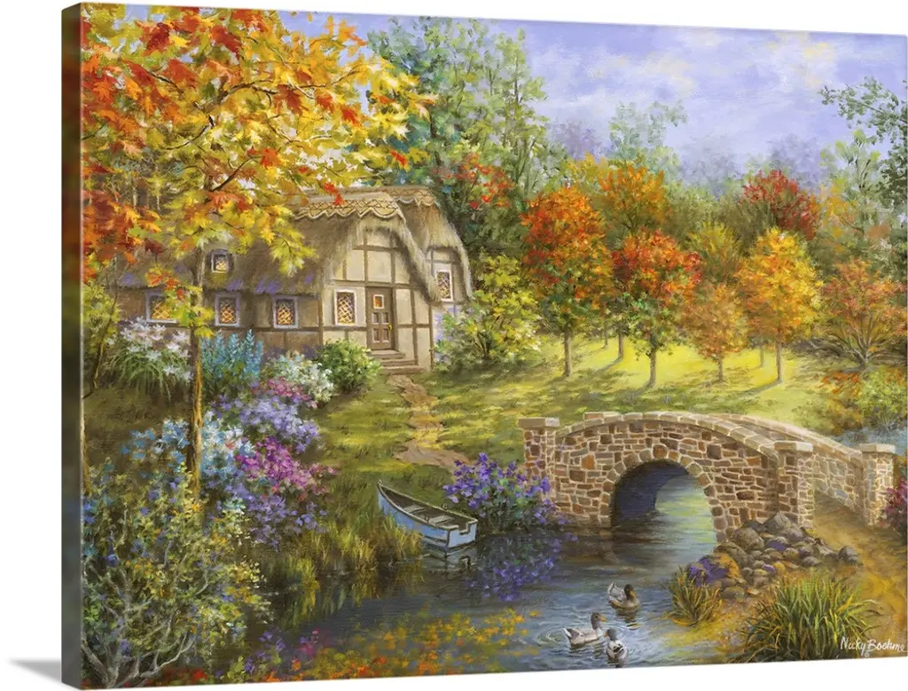 Painting of village scene featuring a large gazebo and houses with glowing windows. Product is a painting reproduction only, and does not contain actual lights.