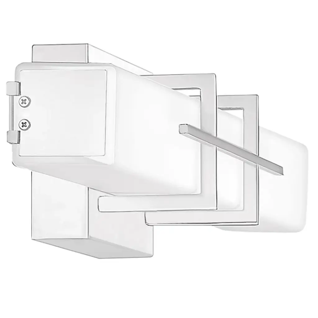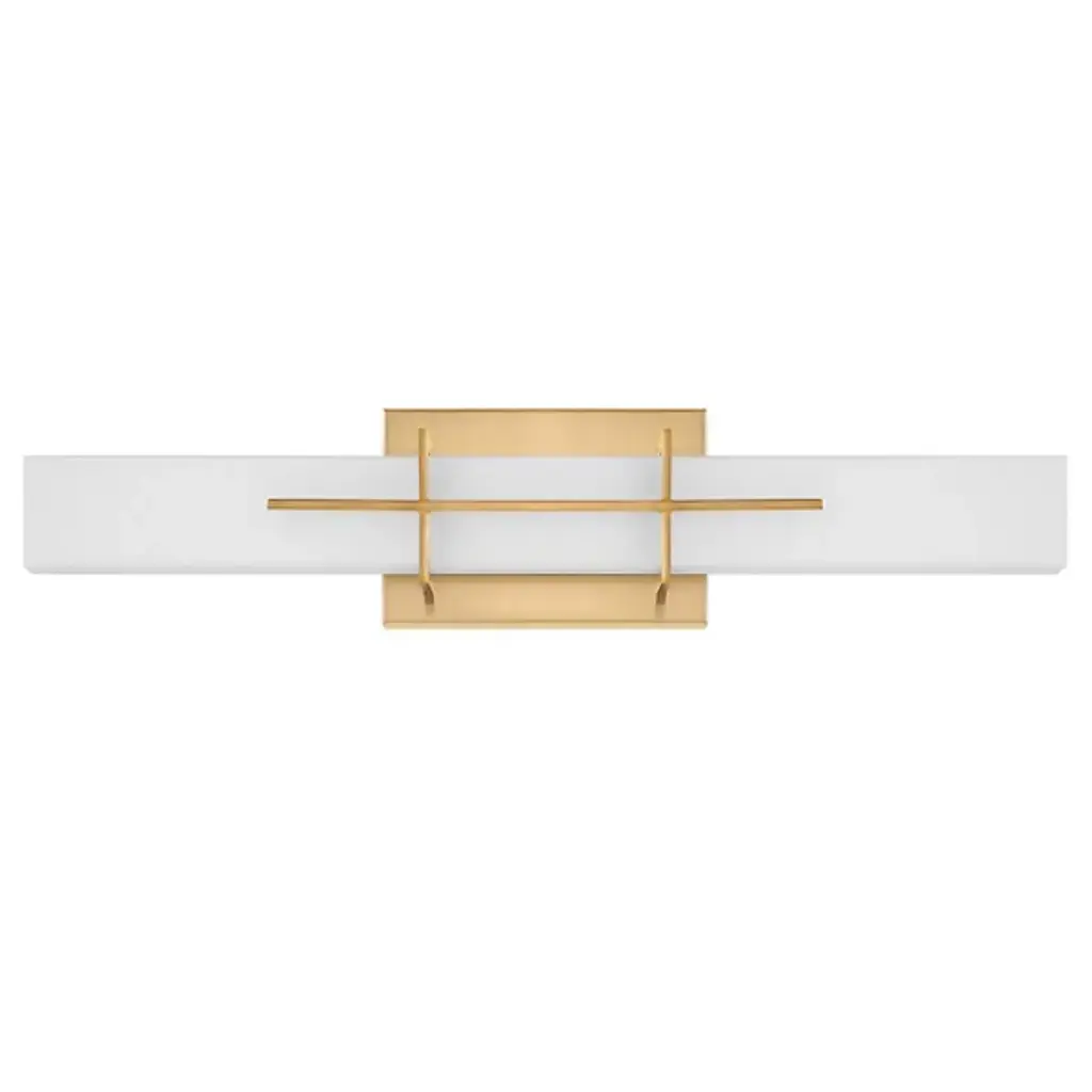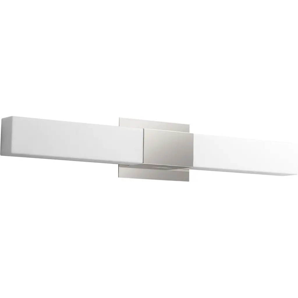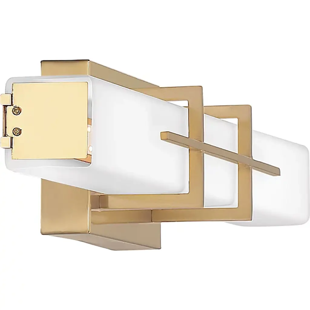 Brighten up your bathroom space with the Gemini LED Vanity Light from Quoizel. A wide and smooth, rectangular opal etched glass shade is gently held in place on the backplate by a pair of thin, angled arms that wrap around. Two colors contrast beautifully, sending radiant elegance into the room. An integrated, energy-efficient LED sits within the glass shade, diffusing evenly for a warm, enhancing touch that softly blankets the room.