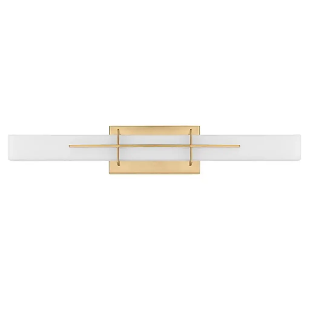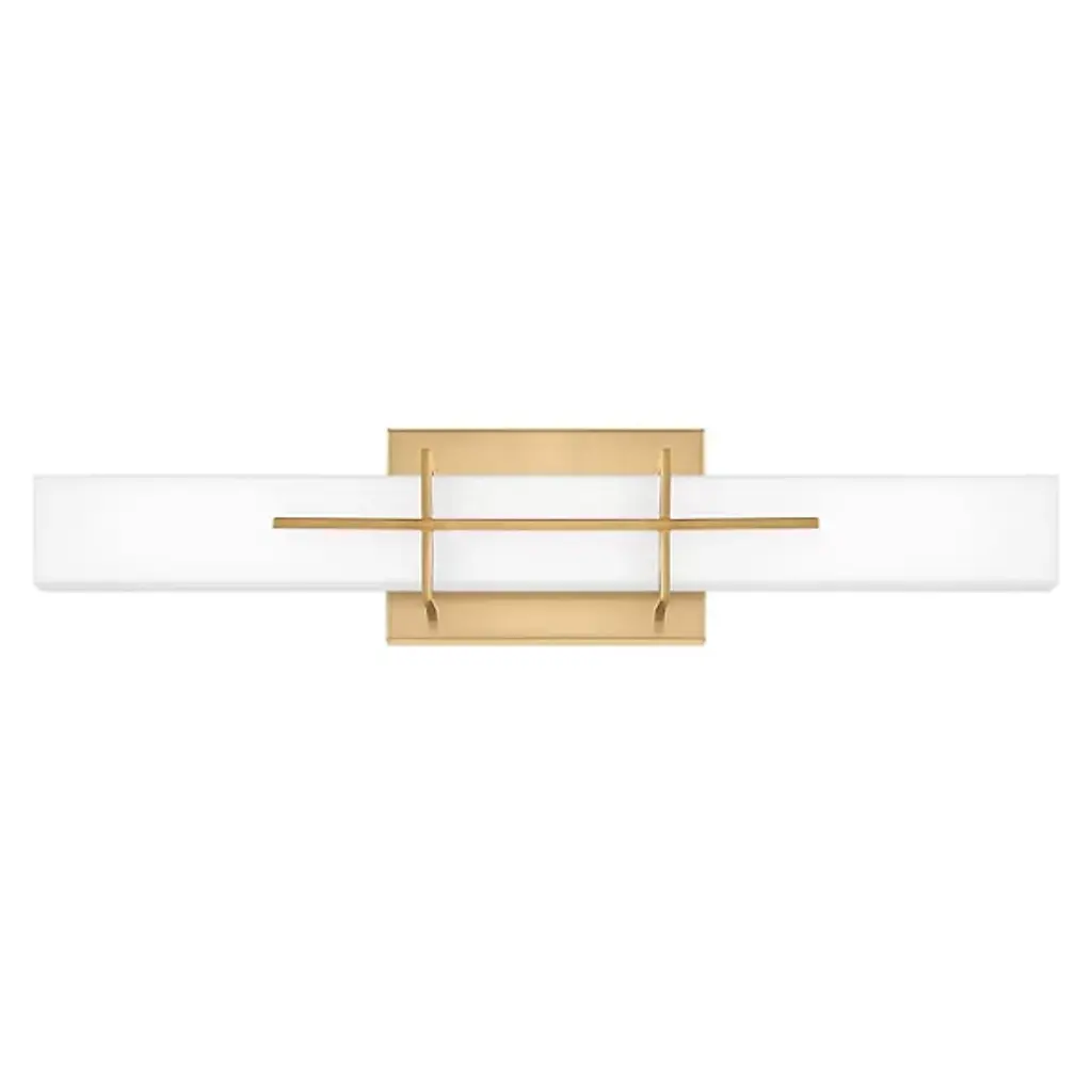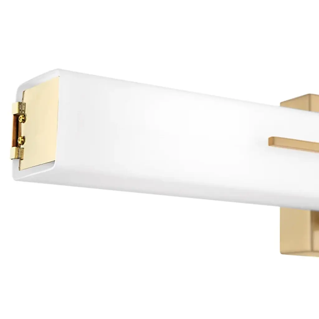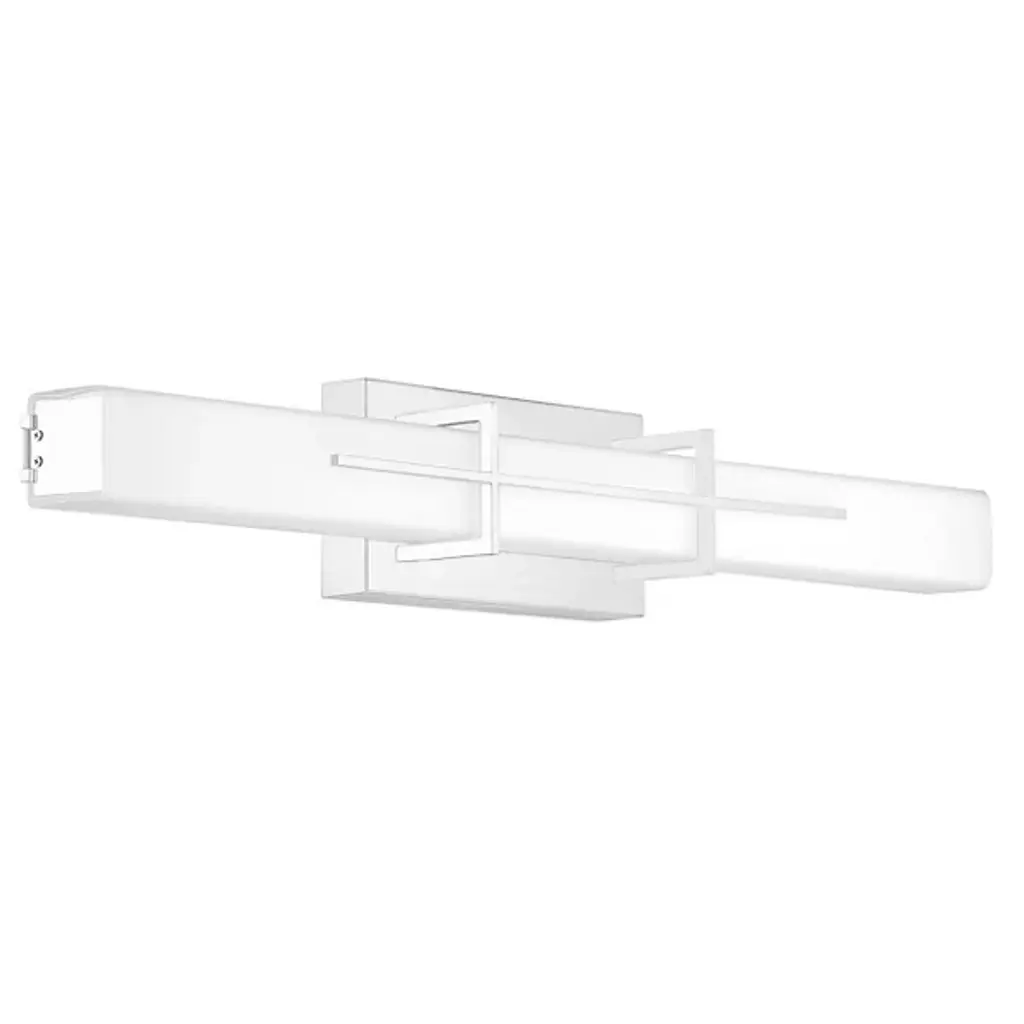 Brighten up your bathroom space with the Gemini LED Vanity Light from Quoizel. A wide and smooth, rectangular opal etched glass shade is gently held in place on the backplate by a pair of thin, angled arms that wrap around. Two colors contrast beautifully, sending radiant elegance into the room. An integrated, energy-efficient LED sits within the glass shade, diffusing evenly for a warm, enhancing touch that softly blankets the room.