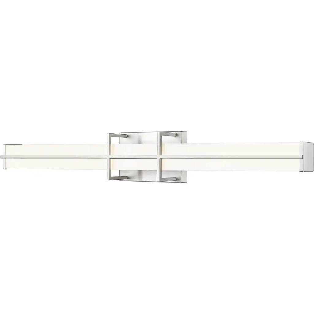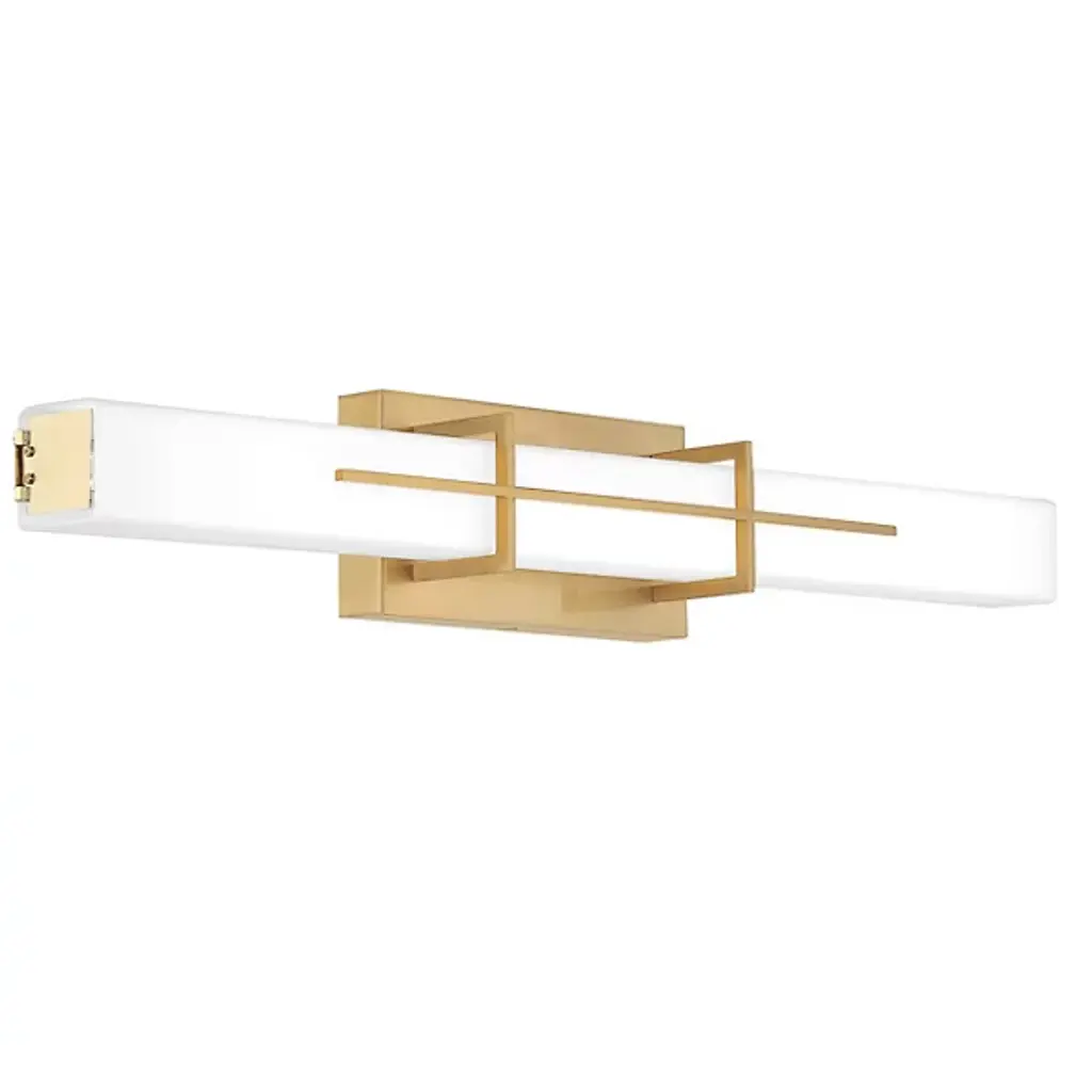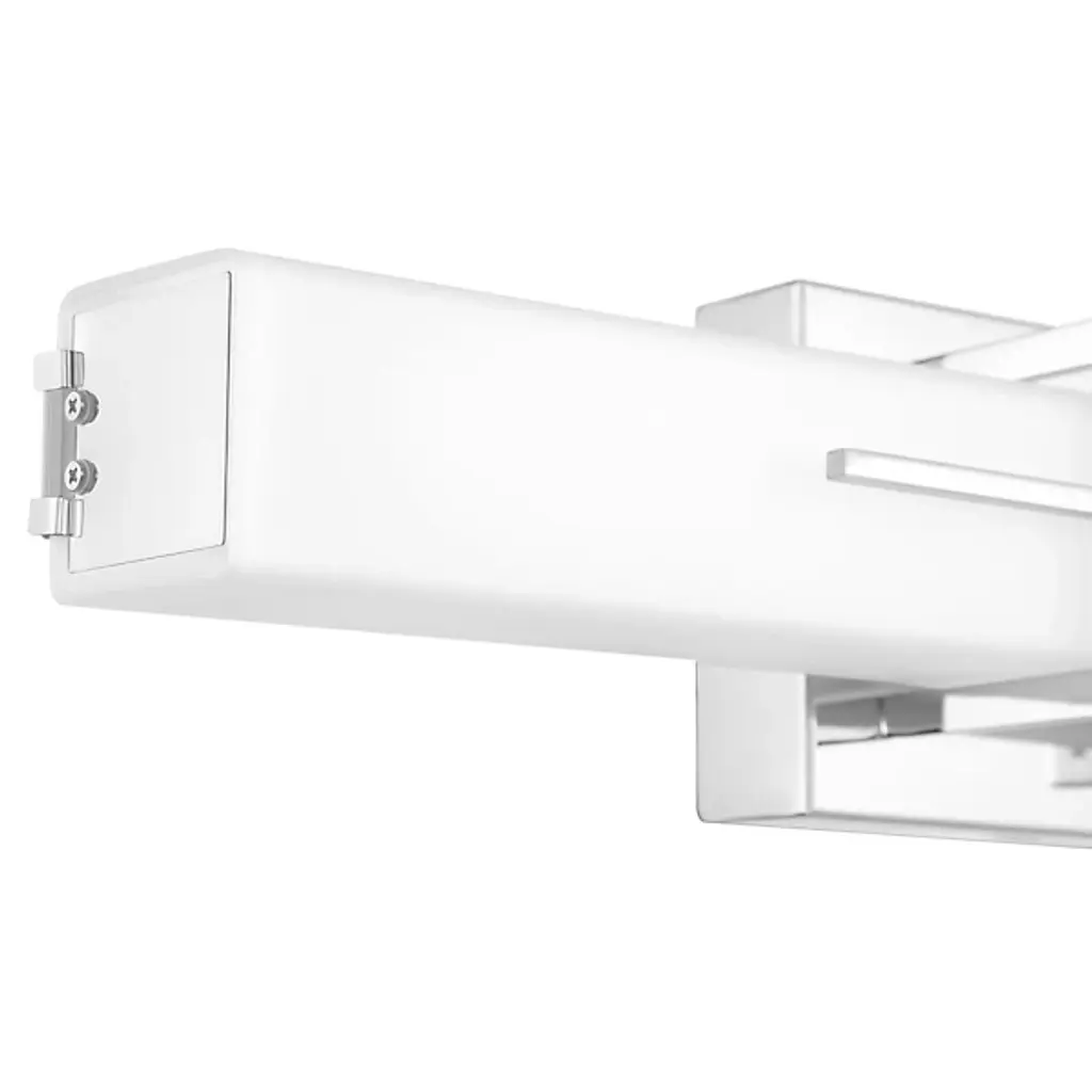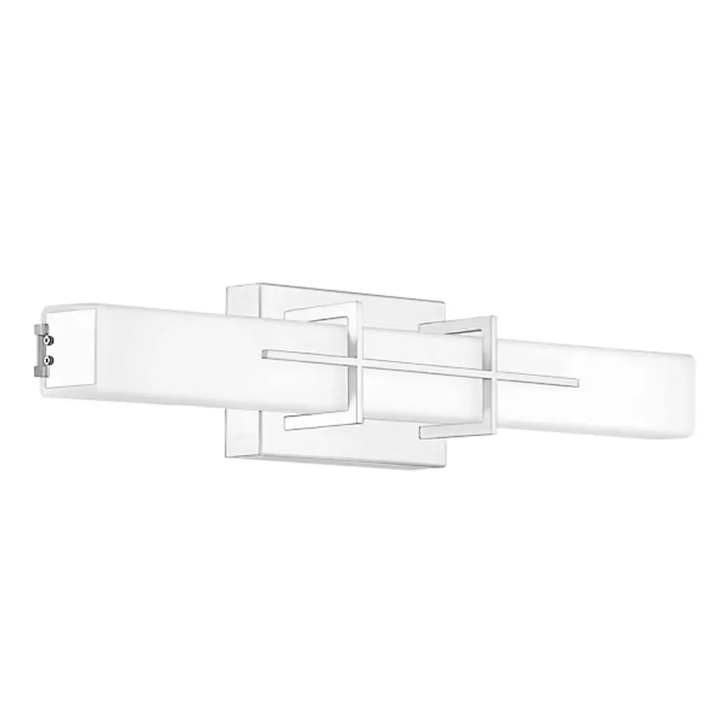 Brighten up your bathroom space with the Gemini LED Vanity Light from Quoizel. A wide and smooth, rectangular opal etched glass shade is gently held in place on the backplate by a pair of thin, angled arms that wrap around. Two colors contrast beautifully, sending radiant elegance into the room. An integrated, energy-efficient LED sits within the glass shade, diffusing evenly for a warm, enhancing touch that softly blankets the room.