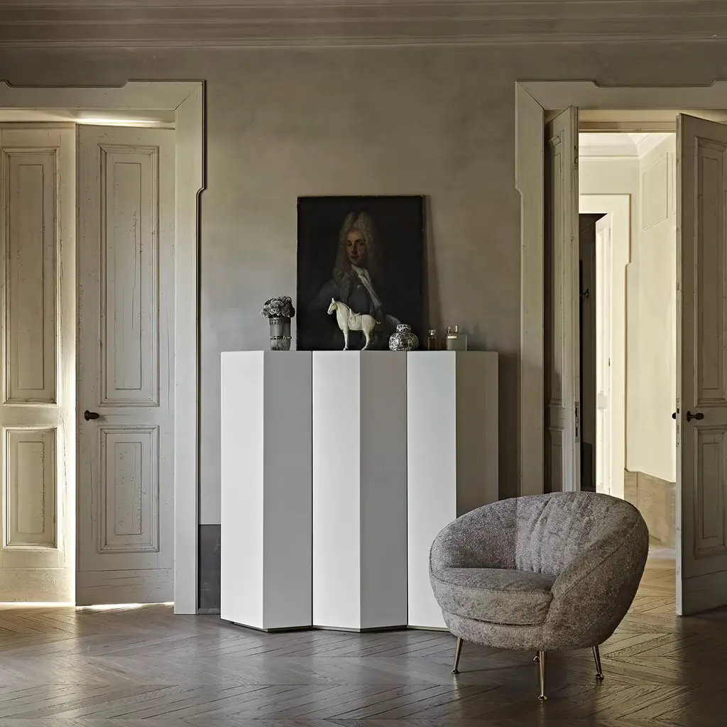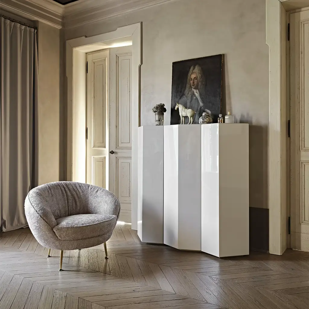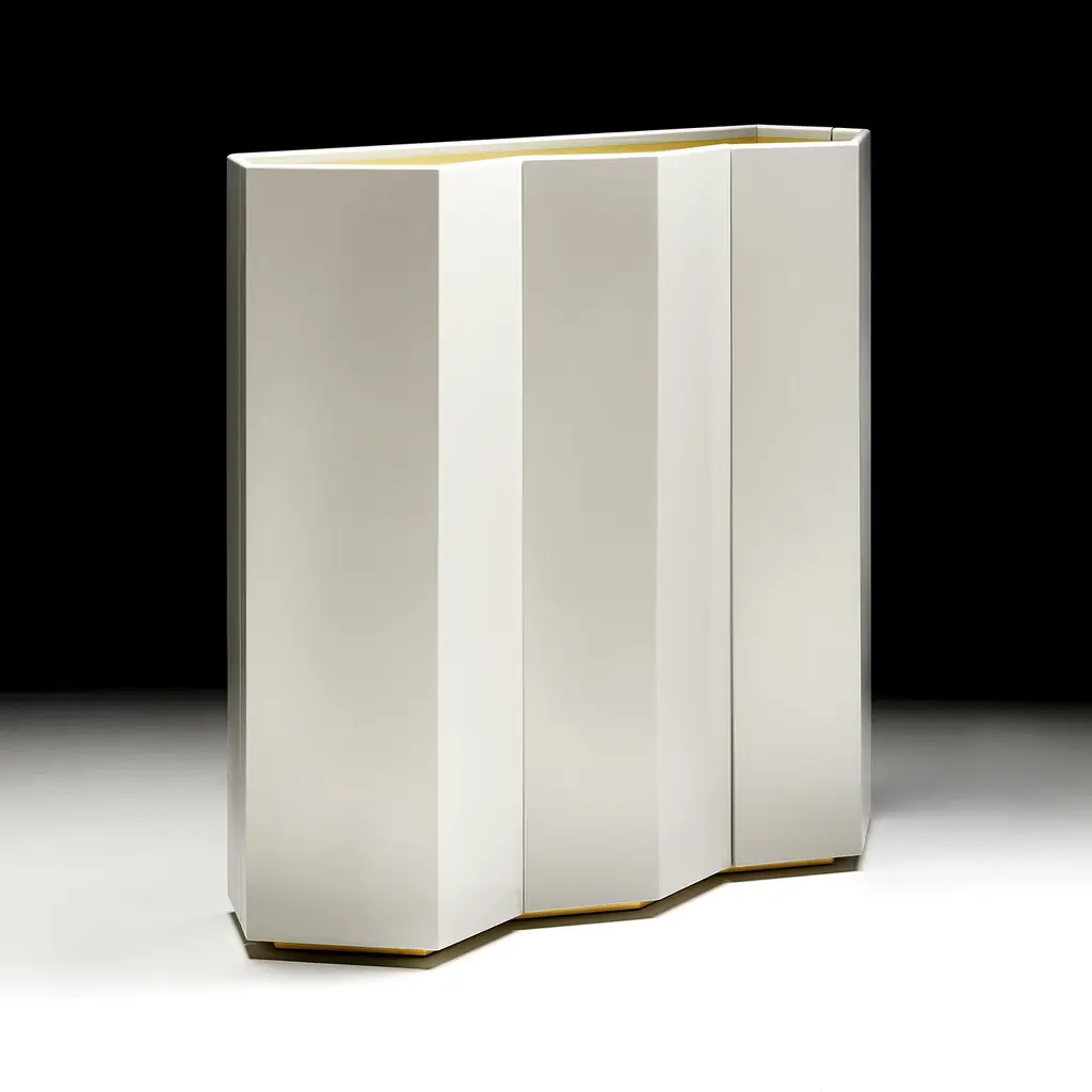 A refined synthesis between lightweight origami artworks and pure Euclidean geometry, this cupboard distills a personality that is at once rigorous and daring. Crafted of MDF, the matte-finished golden foot and ultra-light structure are complemented by eye-catching zig-zagged doors lacquered in a sophisticated matte white-gray finish. A back-varnished glass top seals the cupboard's exclusivity. Please contact the Concierge for available variants.