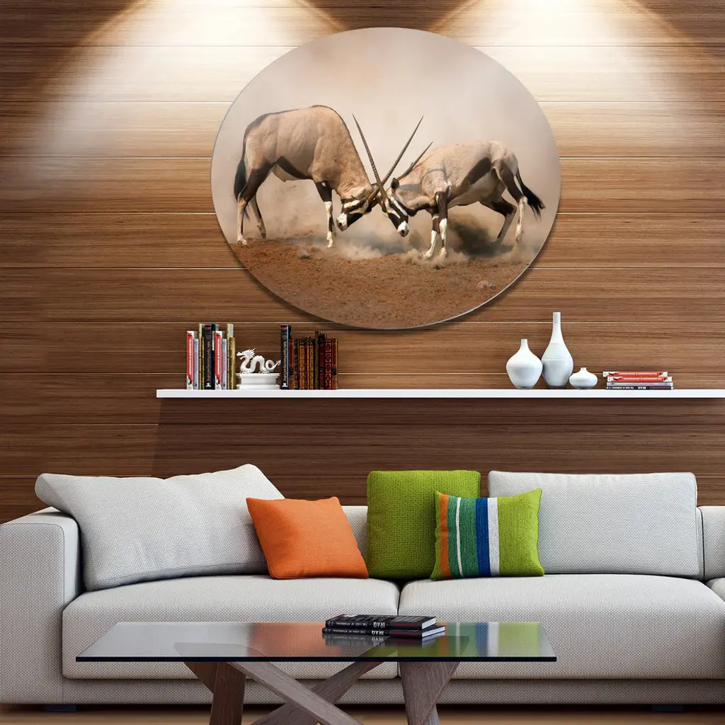 Bring Contemporary Abstraction to your home with this large Circle Metal wall art. This Gemsbok Antelopes Fighting Metal Artwork makes it the focal point of any room or office. - White Gloss Coating ensures colors are extra vibrant with light reflection.- Aluminum grade Sheet Metal with 1 inch mounting frame on the back giving the illusion that the artwork is floating on the wall..- Mounting Brackets are included along with instructions.- High Quality Digital images are created directly into a glossy aluminum panel producing a stunning and captivating print into the glossy finish of the metal.- Water, Fire and Scratch resistant HD Aluminum panels.- Looks better than any photo paper and guaranteed to last at least 20 years- Easy to clean with a microfiber cloth. Colors are far superior to regular Canvas Art. - Easy to Hang