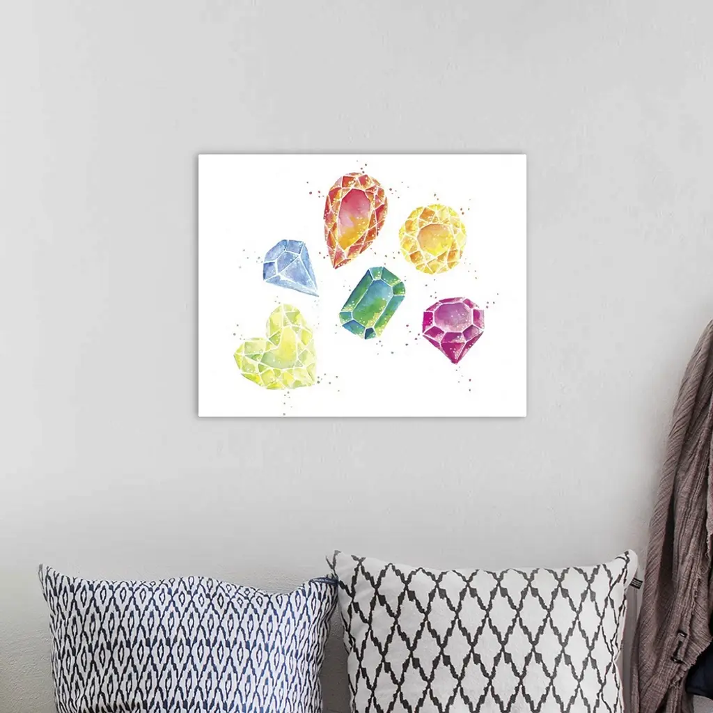 Contemporary painting of a collection of dazzling rare jewels of varying cuts and colors.