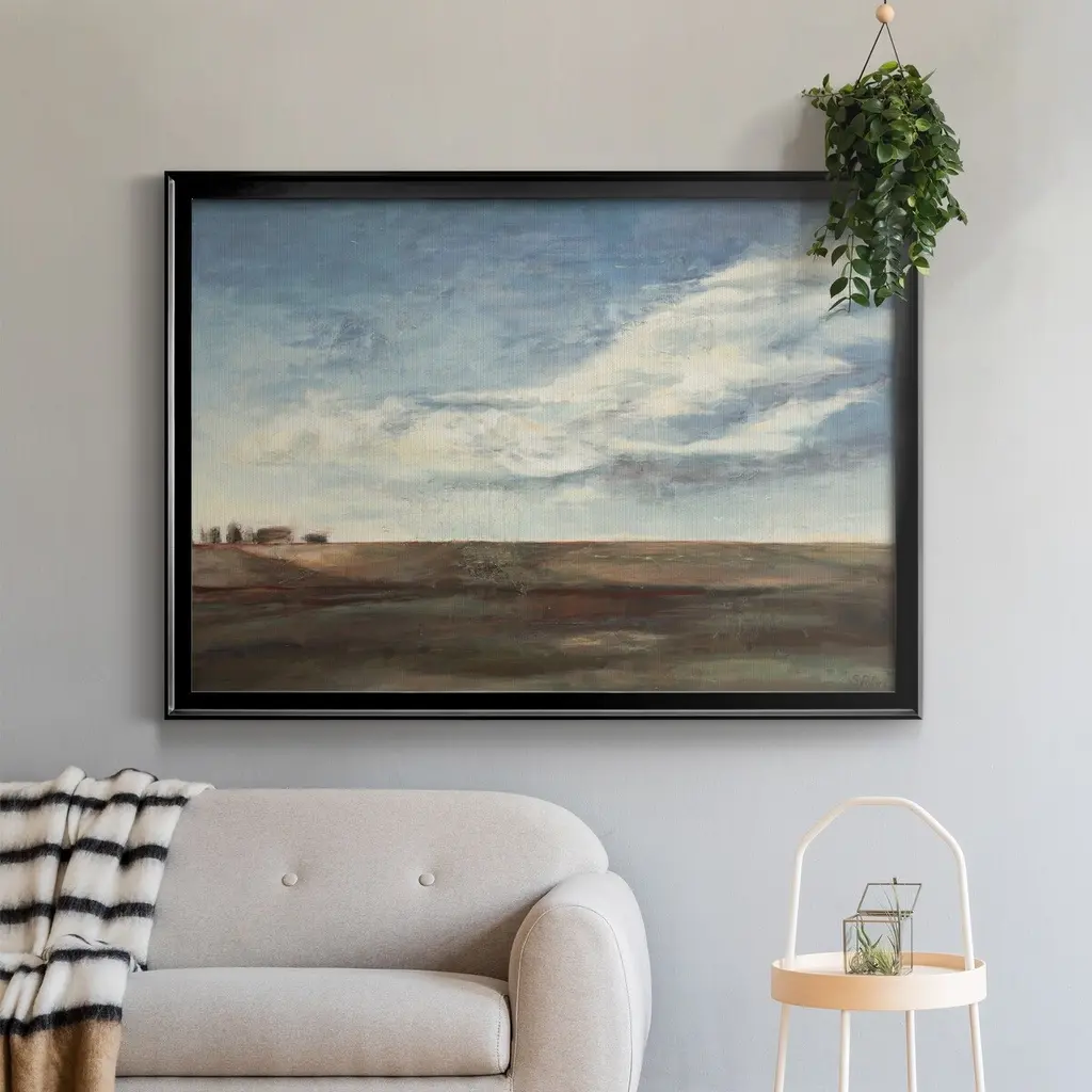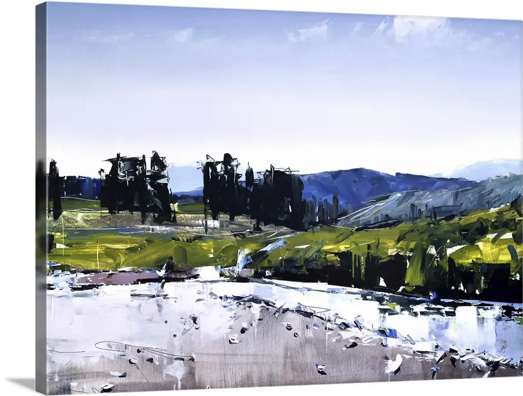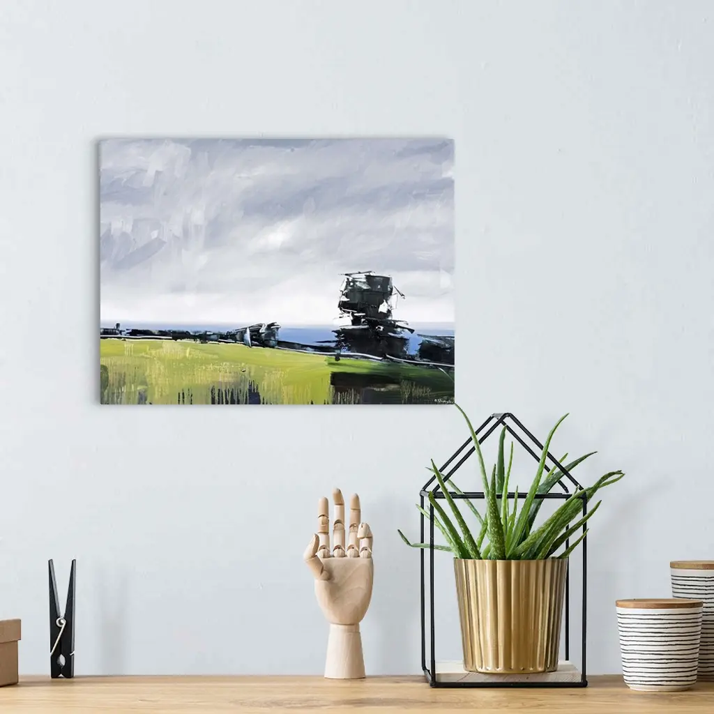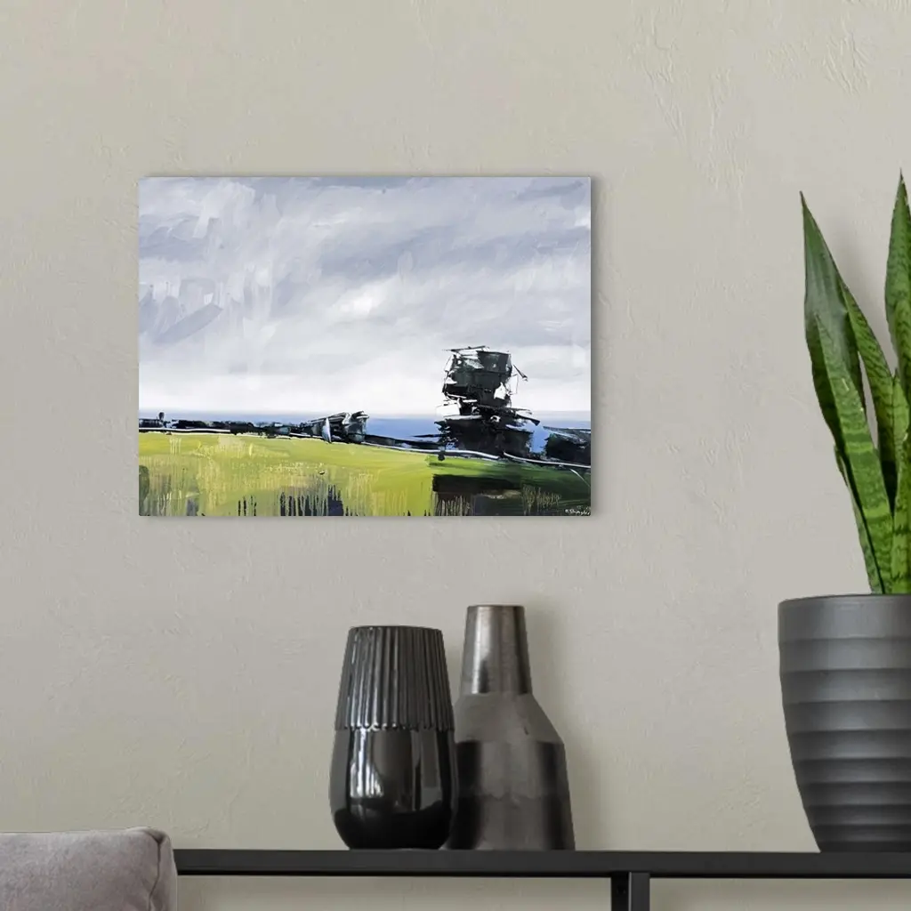 A contemporary painting of a green field under a sky filled with gray clouds.