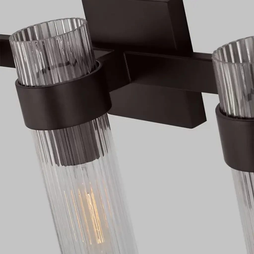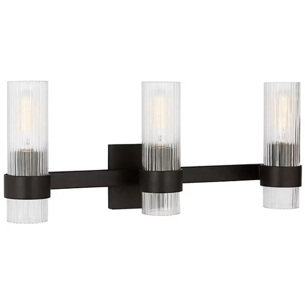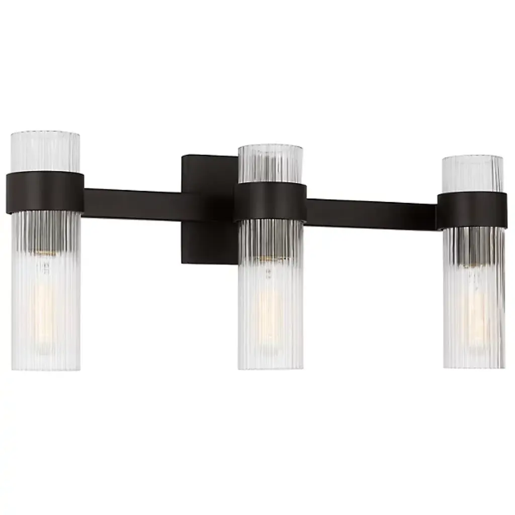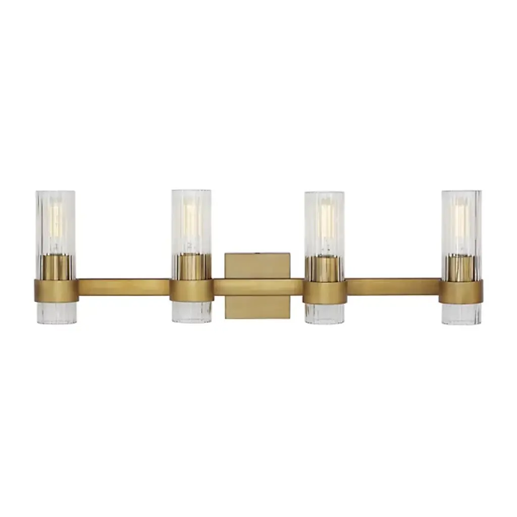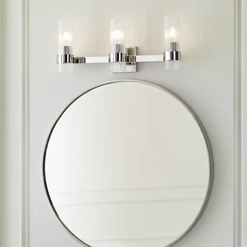 The Geneva Vanity Light by Visual Comfort Studio, formerly known as Chapman & Myers, is a stunning addition to master and guest bathrooms alike. With a simply structured silhouette, a square wall plate anchors a horizontal bar that supports an even arrangement of rippled glass shades that are held up by sleek metal bands. Filtering a warm and welcoming layer of light through their surface, these textured, cylindrical shades look elegant as they are paired with the beautiful finish that dresses up the rest of this piece, bringing a sophisticated touch to spaces.