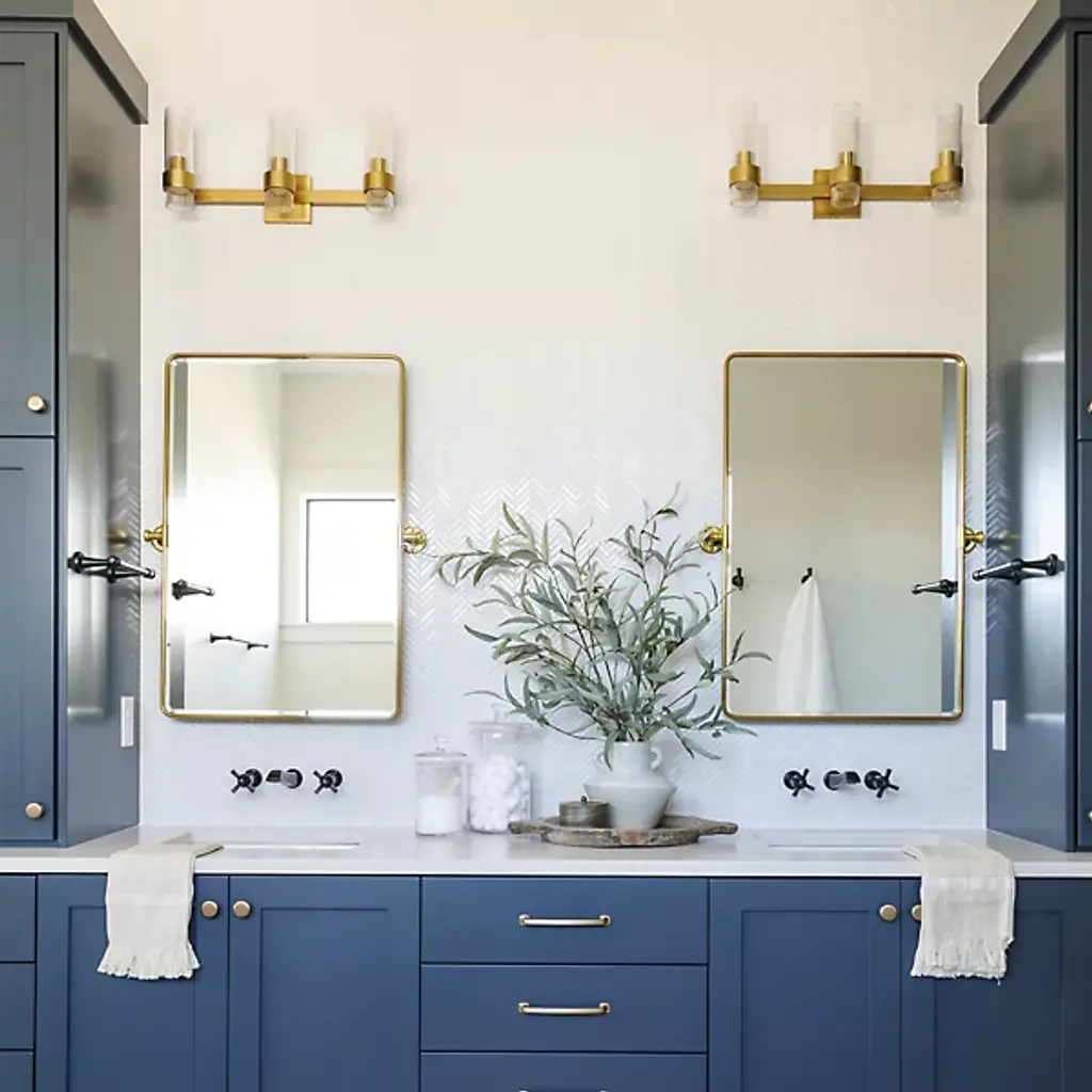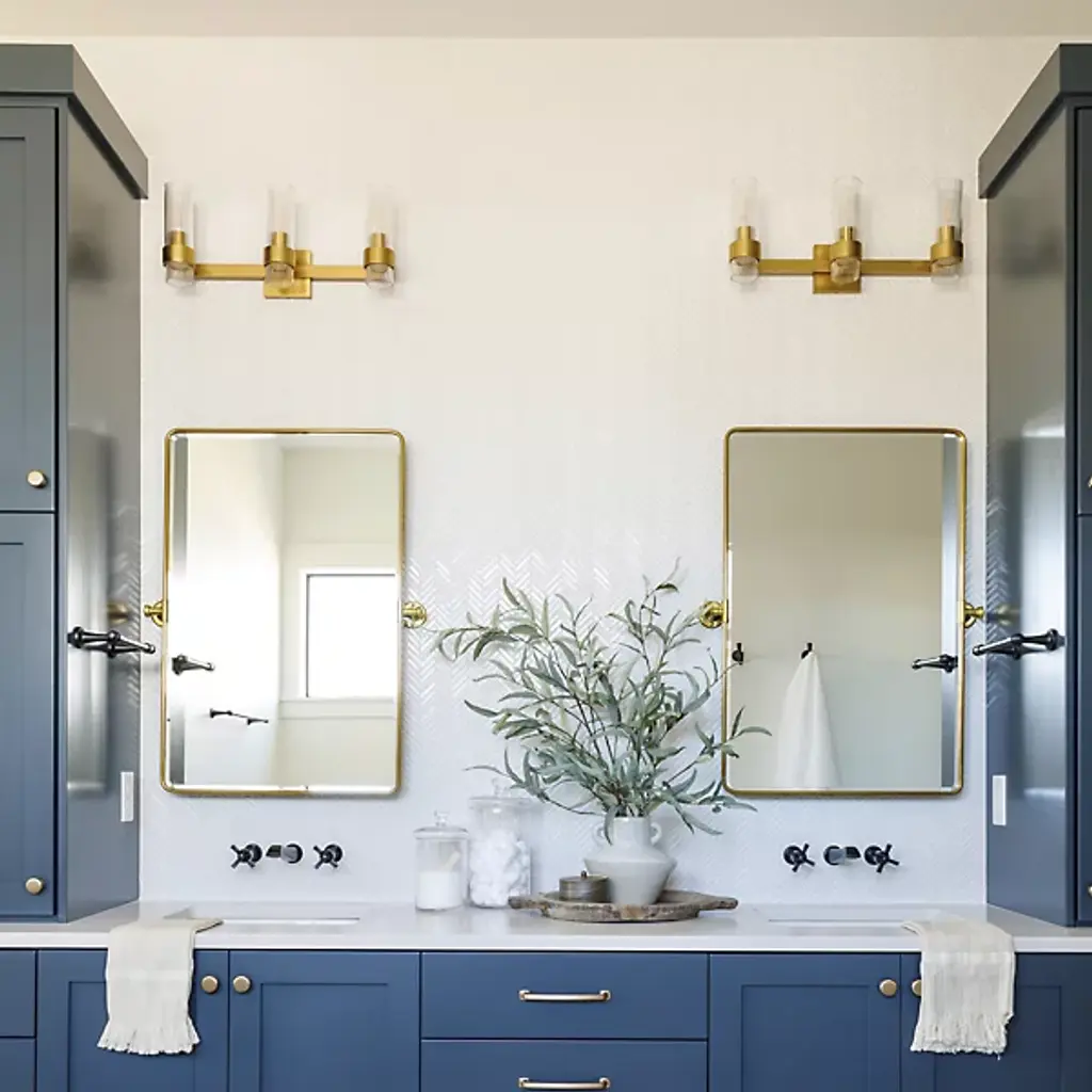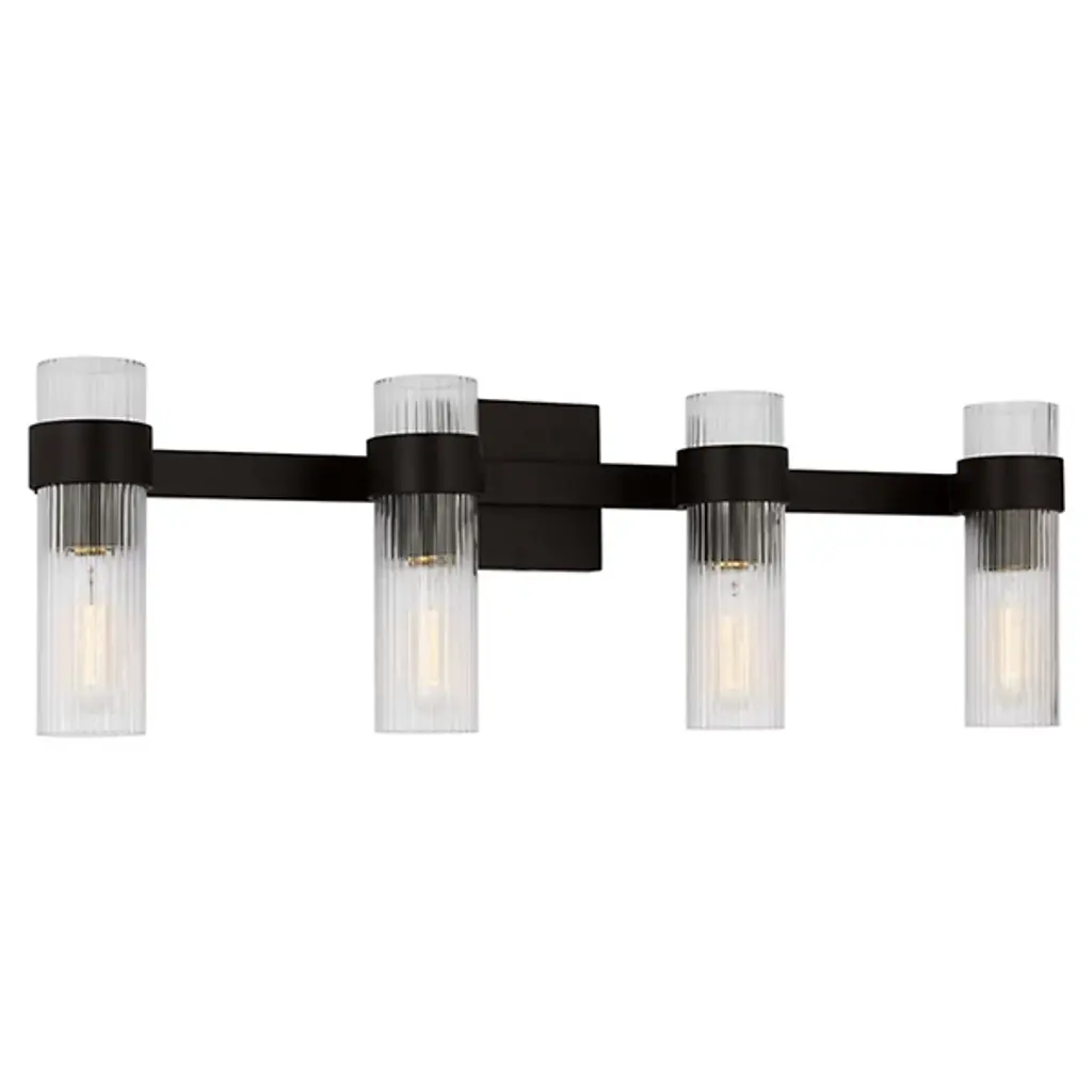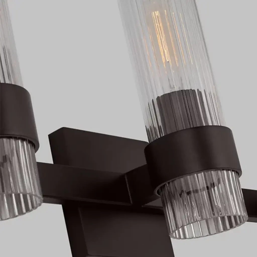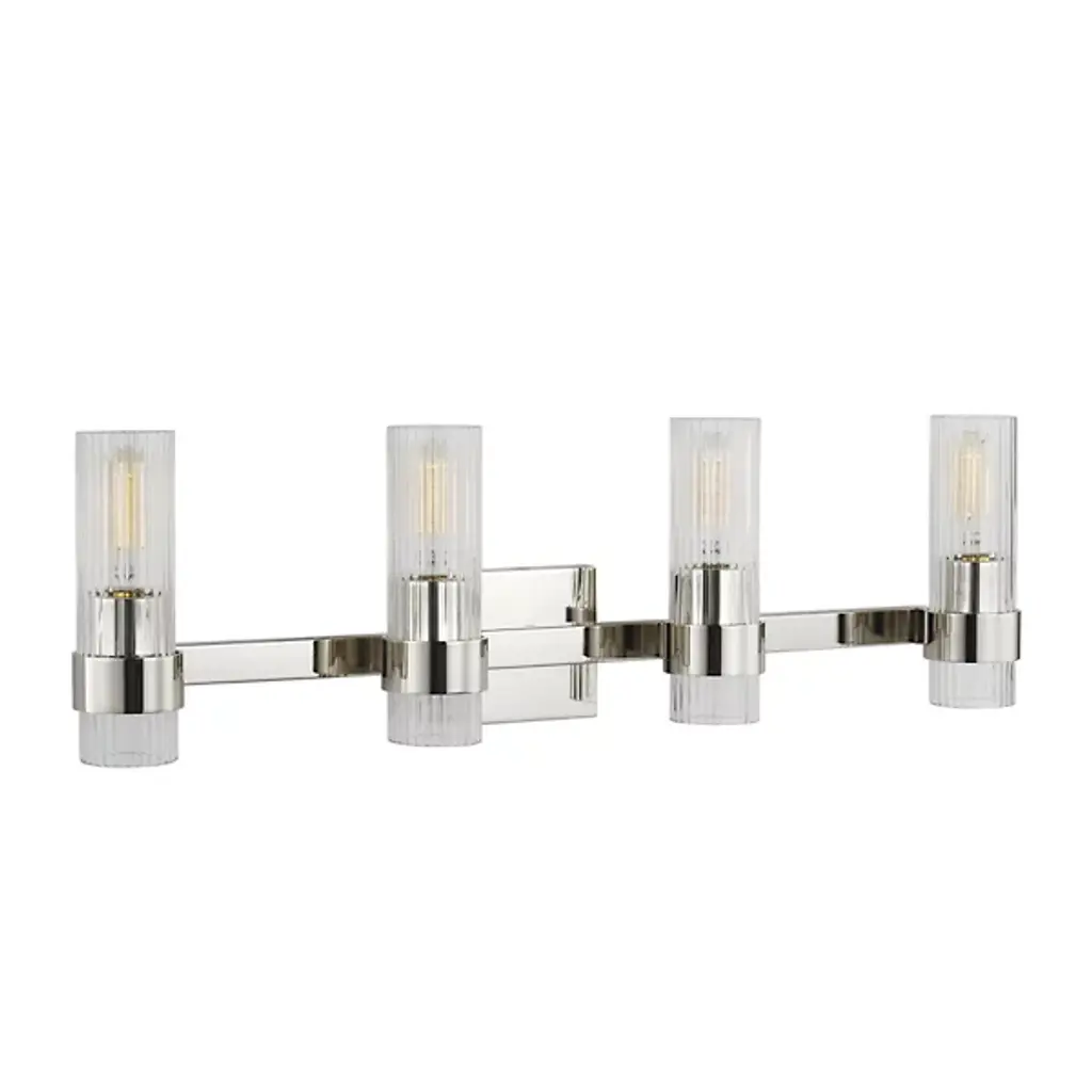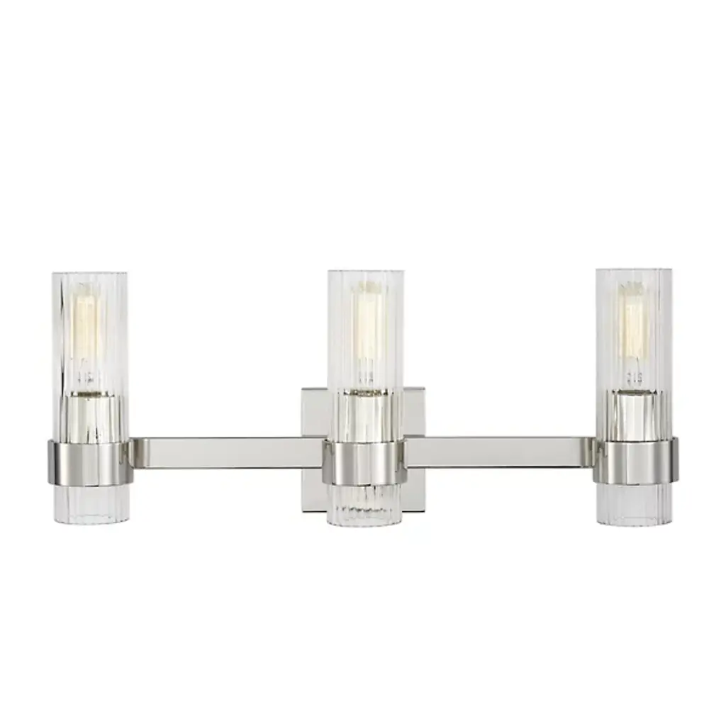 The Geneva Vanity Light by Visual Comfort Studio, formerly known as Chapman & Myers, is a stunning addition to master and guest bathrooms alike. With a simply structured silhouette, a square wall plate anchors a horizontal bar that supports an even arrangement of rippled glass shades that are held up by sleek metal bands. Filtering a warm and welcoming layer of light through their surface, these textured, cylindrical shades look elegant as they are paired with the beautiful finish that dresses up the rest of this piece, bringing a sophisticated touch to spaces.