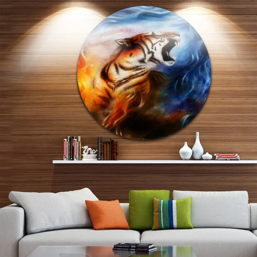 Bring Contemporary Abstraction to your home with this large Circle Metal wall art. This Gentle Tiger Portrait Collage Metal Artwork makes it the focal point of any room or office. - White Gloss Coating ensures colors are extra vibrant with light reflection.- Aluminum grade Sheet Metal with 1 inch mounting frame on the back giving the illusion that the artwork is floating on the wall..- Mounting Brackets are included along with instructions.- High Quality Digital images are created directly into a glossy aluminum panel producing a stunning and captivating print into the glossy finish of the metal.- Water, Fire and Scratch resistant HD Aluminum panels.- Looks better than any photo paper and guaranteed to last at least 20 years- Easy to clean with a microfiber cloth. Colors are far superior to regular Canvas Art. - Easy to Hang