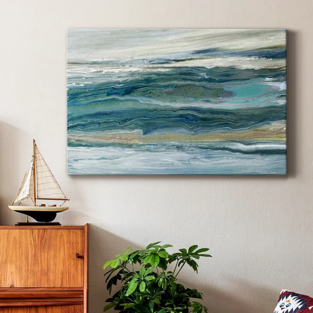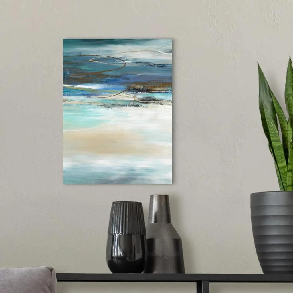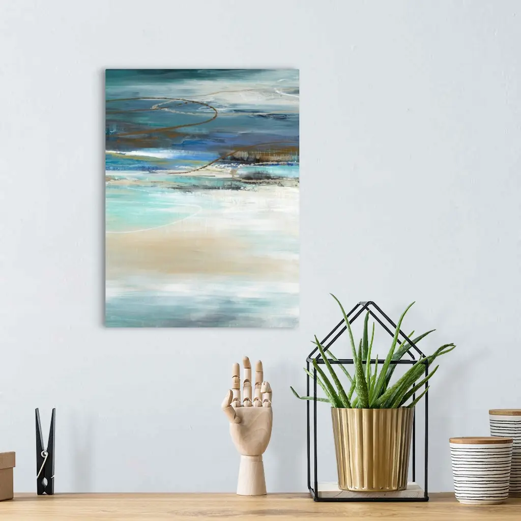 Contemporary abstract painting in shades of blue and brown with layered horizontal brushstrokes on the background and thin loopy lines on top.