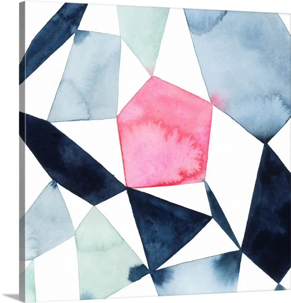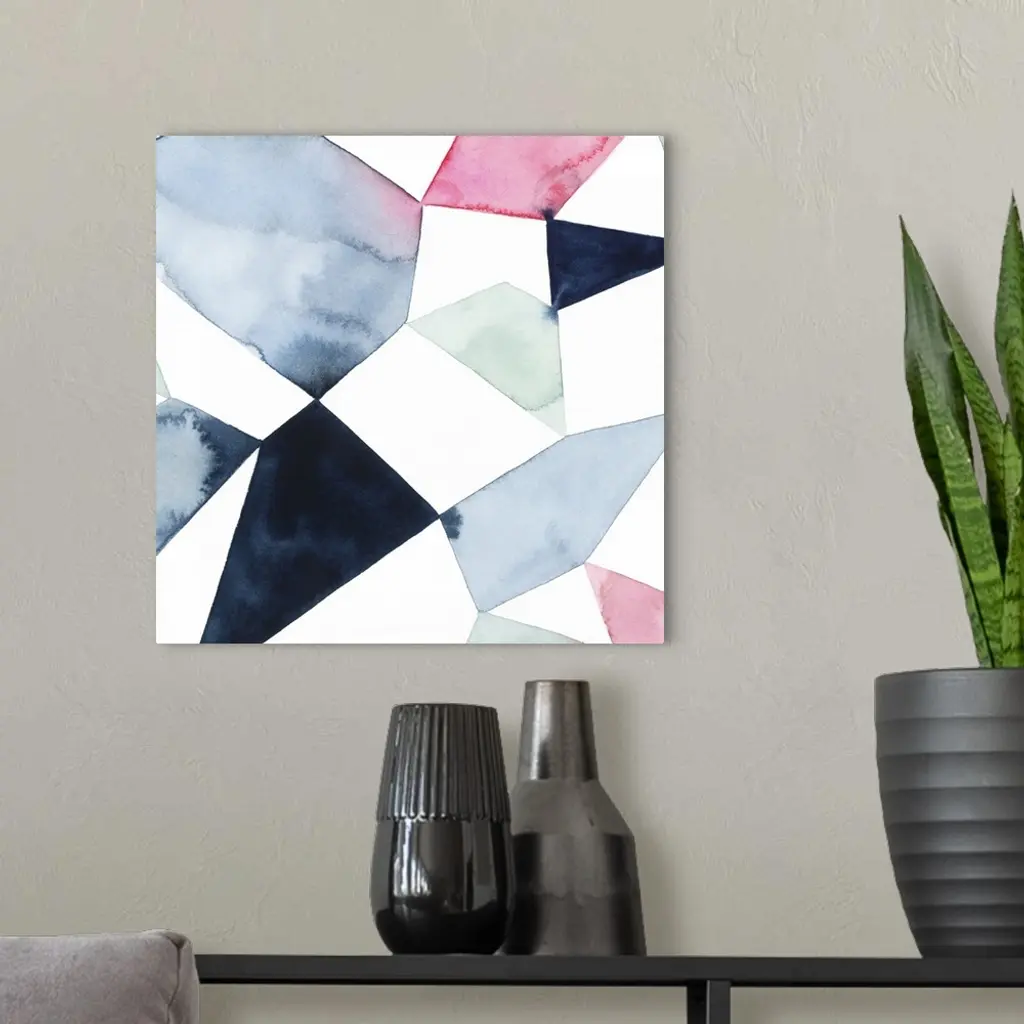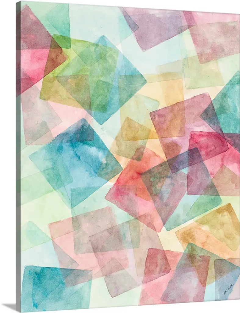 Modern watercolor painting of blended colors in geometric shapes connecting on a white background.
