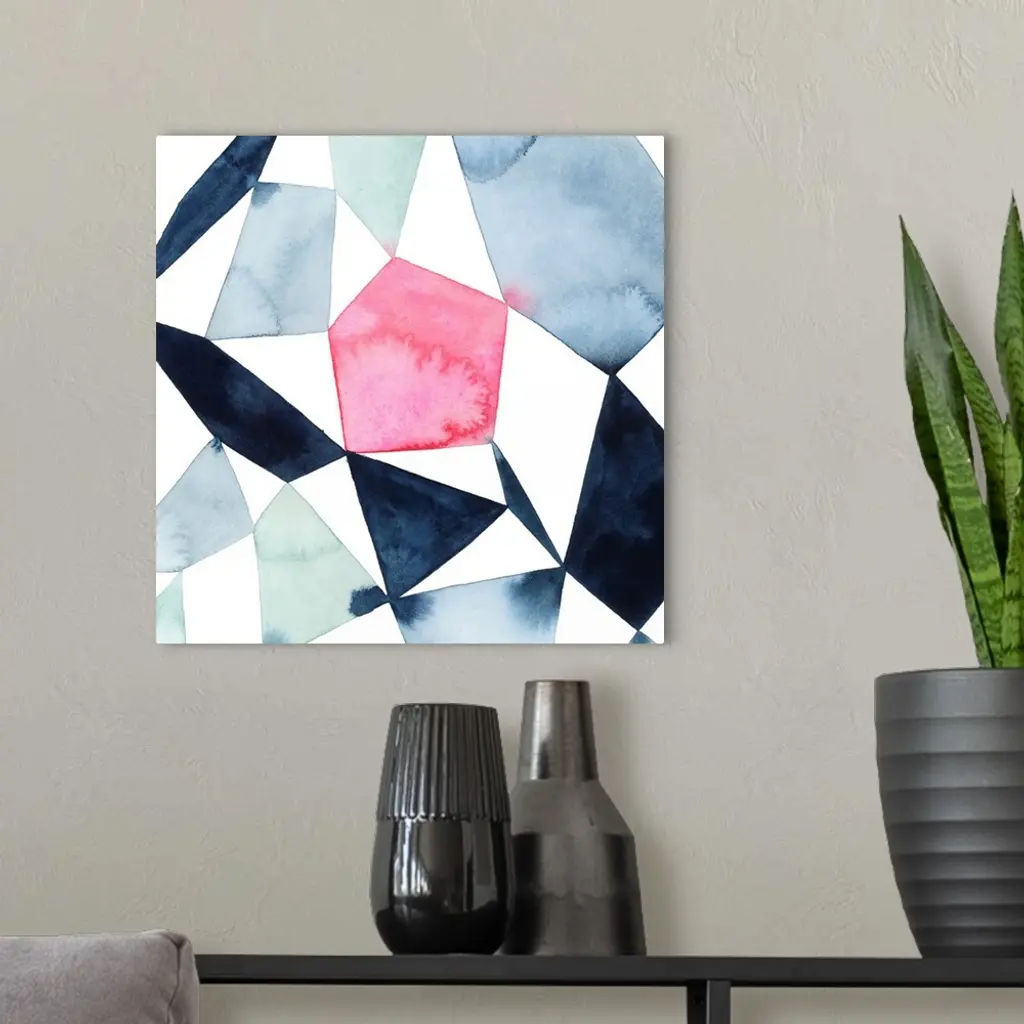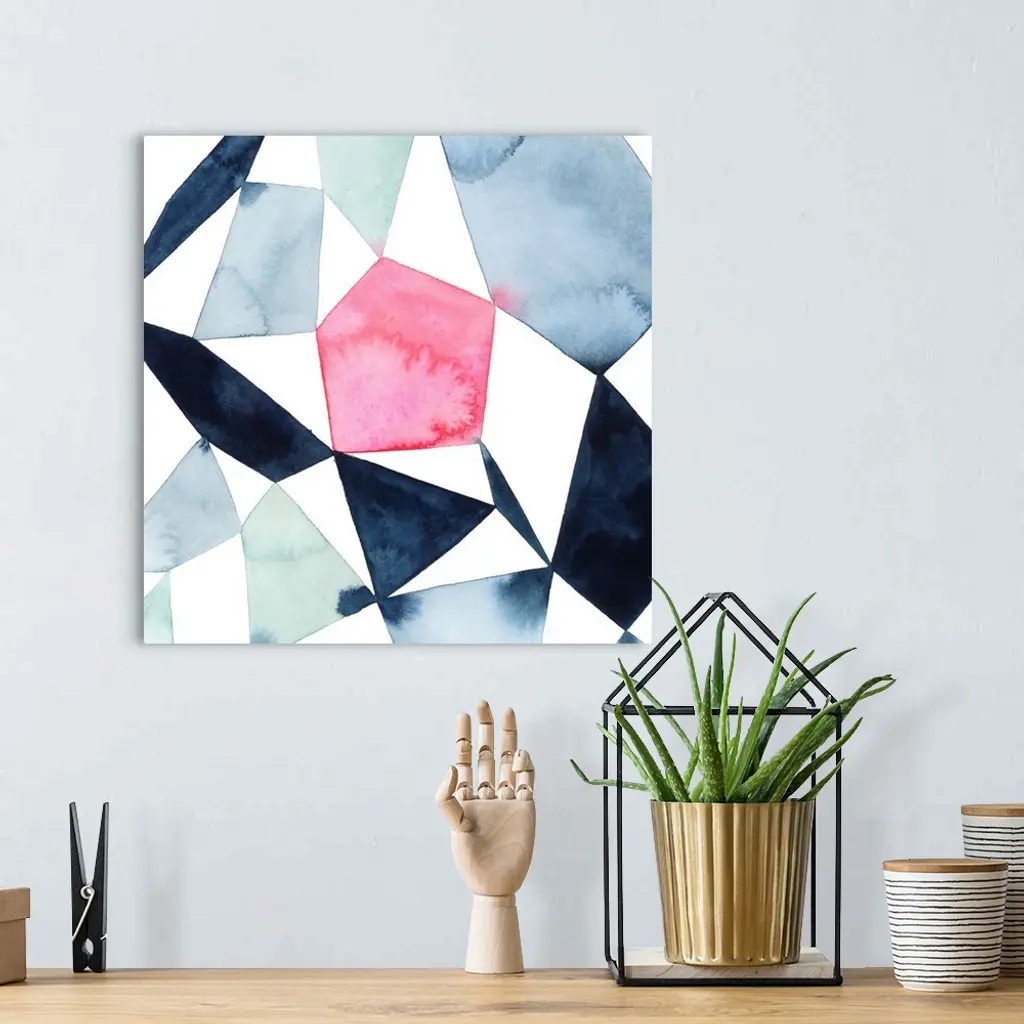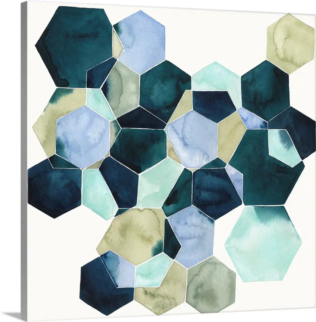 Modern watercolor painting of blended colors in geometric shapes connecting on a white background.
