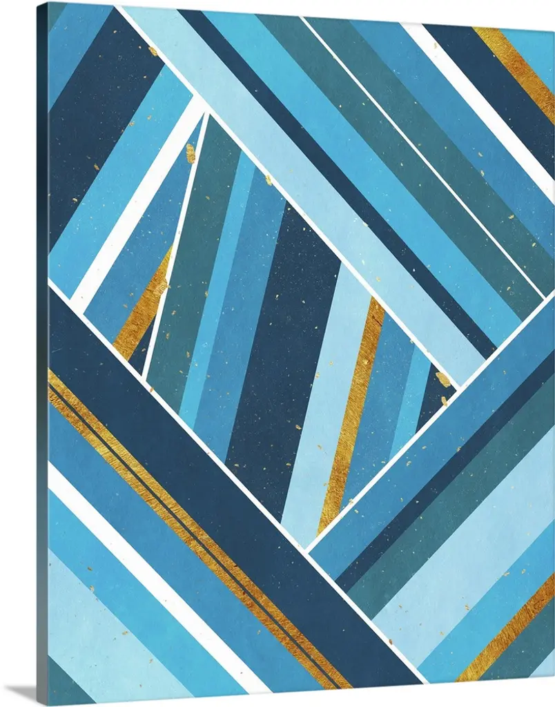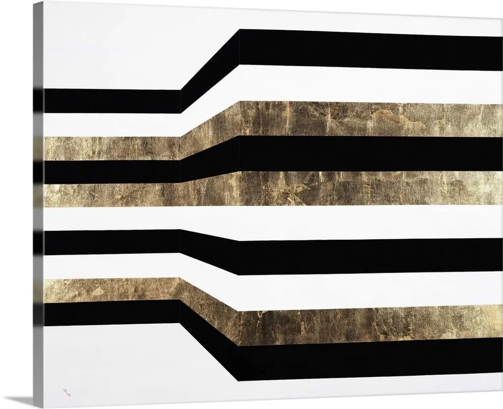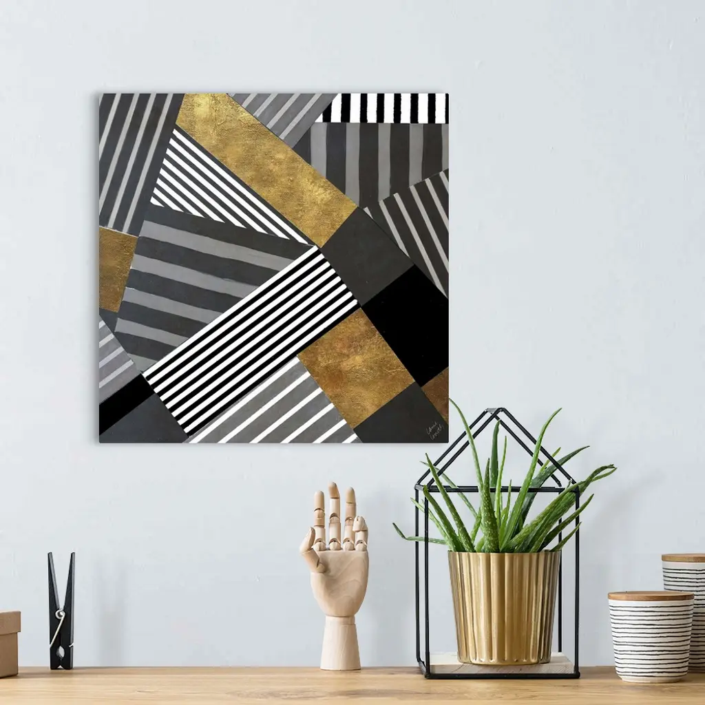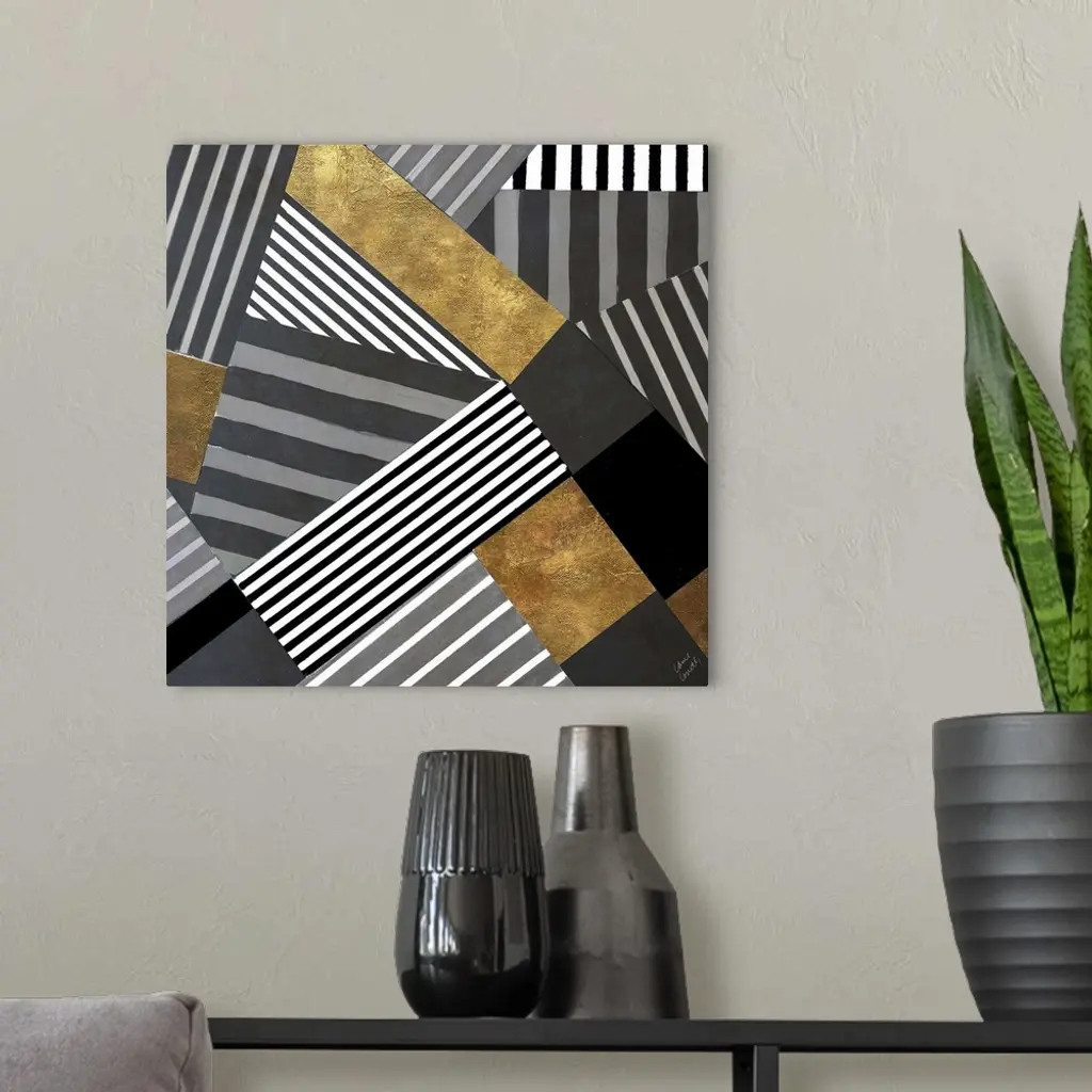 Square abstract painting that has black, white, and gray striped in sections moving in all different directions with rectangles of solid gray, black, and metallic gold incorporated.