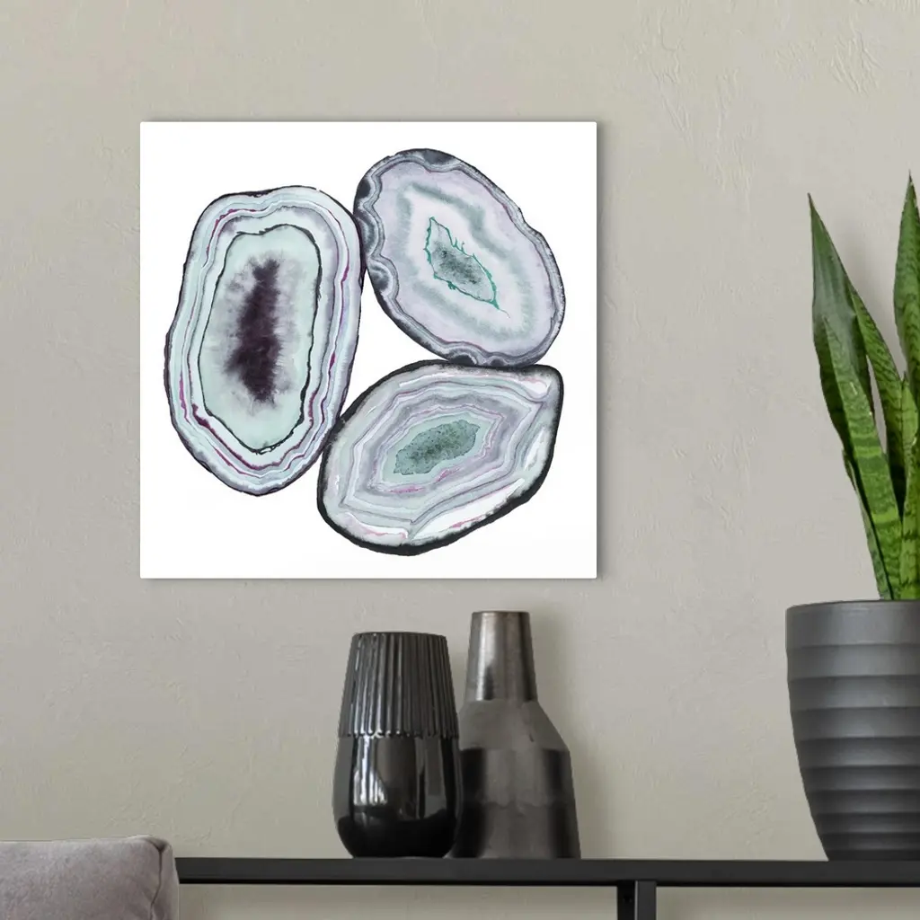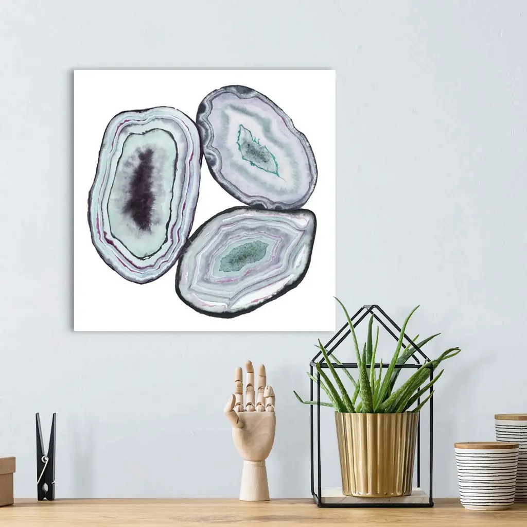 Square watercolor artwork of geode rocks in green, purple and blue on a white background.