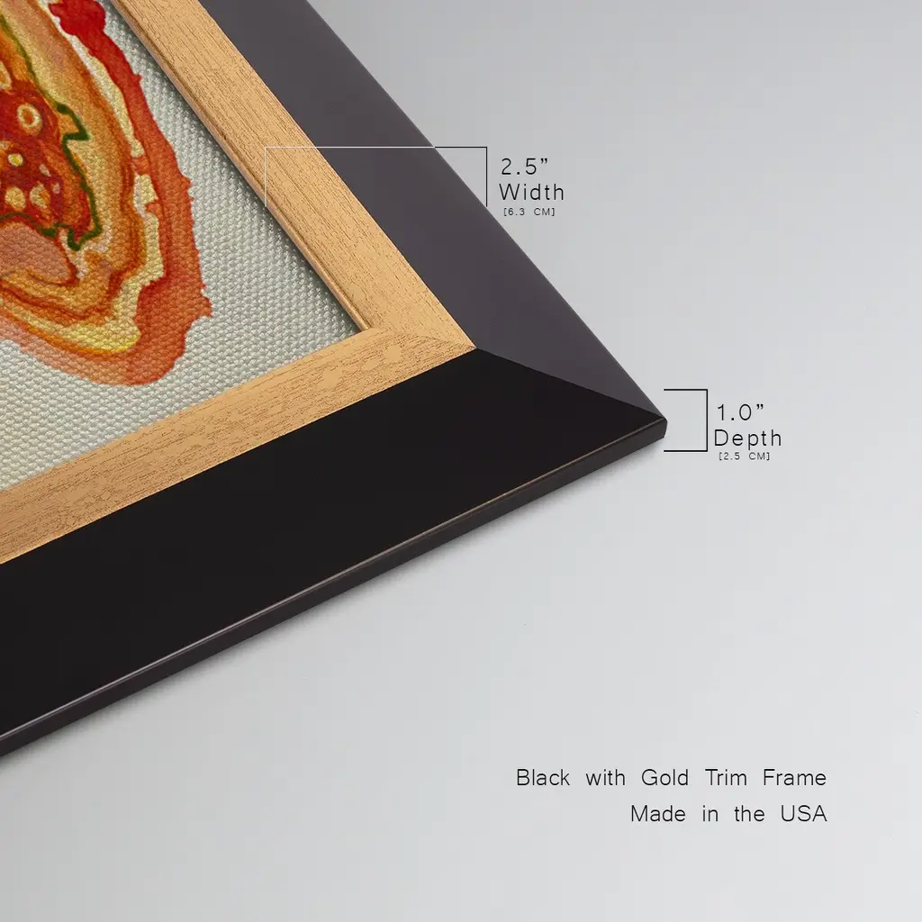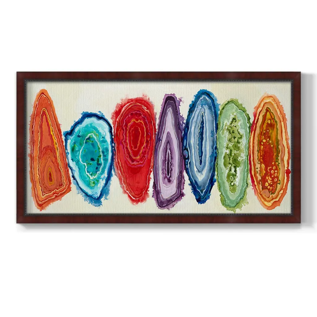 Geode Slice Premium Framed Canvas- Ready to Hang A Premium Framed Canvas created to last. Framed in distressed wood and available in an array of sizes and colors Featuring a beveled a solid wood stretcher bar, each piece comes ready to hand 3 SIZES AVAILABLE 21''X37'' - Overall Size 25''X45'' - Overall Size 29''x53'' - Overall Size Each piece is made to order. Each piece comes with hanging hardware. Made in the USA Ready to Hang Giclee Paper Print Acrylic Glass Beveled Matt Board