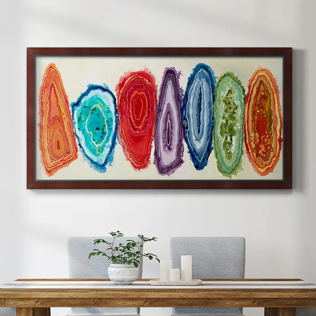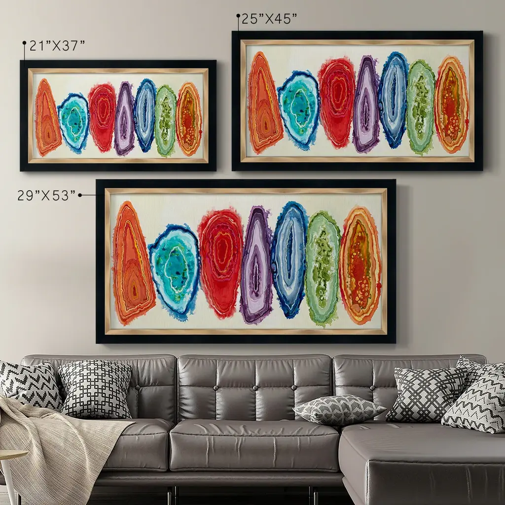 Geode Slice Premium Framed Canvas- Ready to Hang A Premium Framed Canvas created to last. Framed in distressed wood and available in an array of sizes and colors Featuring a beveled a solid wood stretcher bar, each piece comes ready to hand 3 SIZES AVAILABLE 21''X37'' - Overall Size 25''X45'' - Overall Size 29''x53'' - Overall Size Each piece is made to order. Each piece comes with hanging hardware. Made in the USA Ready to Hang Giclee Paper Print Acrylic Glass Beveled Matt Board