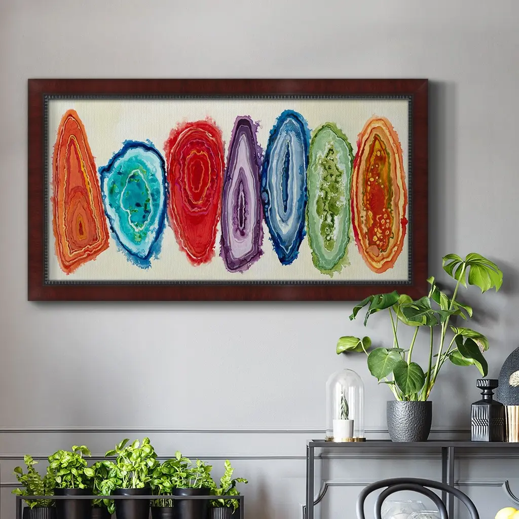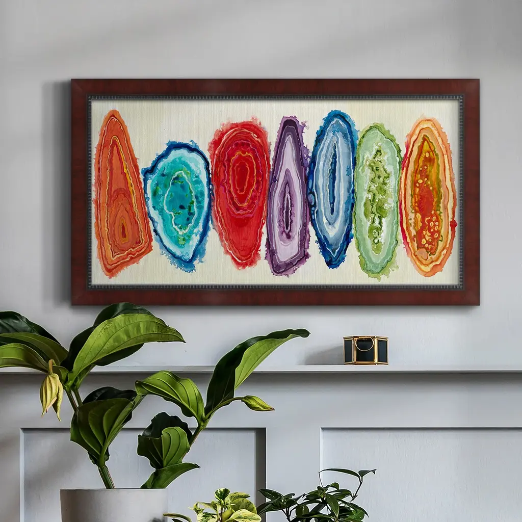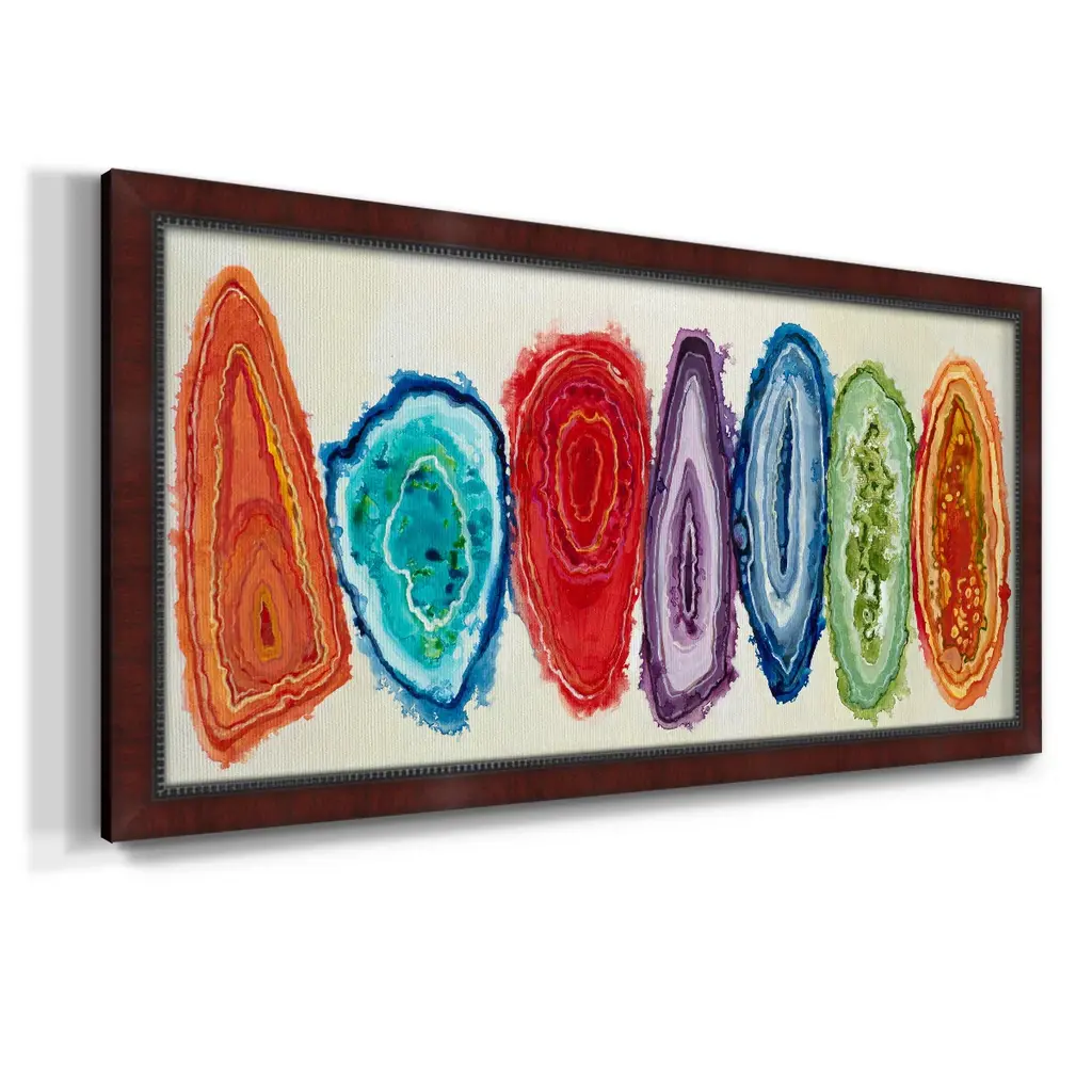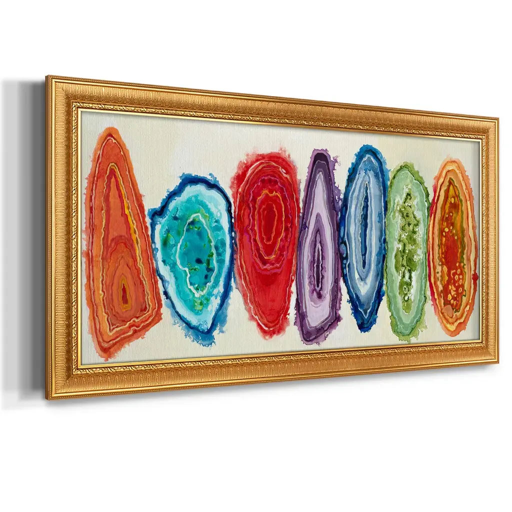 Geode Slice Premium Framed Canvas- Ready to Hang A Premium Framed Canvas created to last. Framed in distressed wood and available in an array of sizes and colors Featuring a beveled a solid wood stretcher bar, each piece comes ready to hand 3 SIZES AVAILABLE 21''X37'' - Overall Size 25''X45'' - Overall Size 29''x53'' - Overall Size Each piece is made to order. Each piece comes with hanging hardware. Made in the USA Ready to Hang Giclee Paper Print Acrylic Glass Beveled Matt Board
