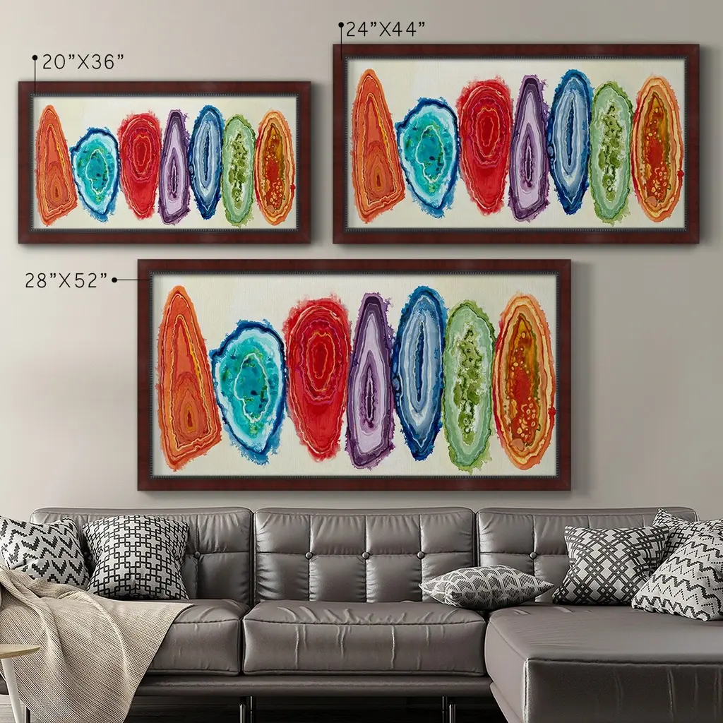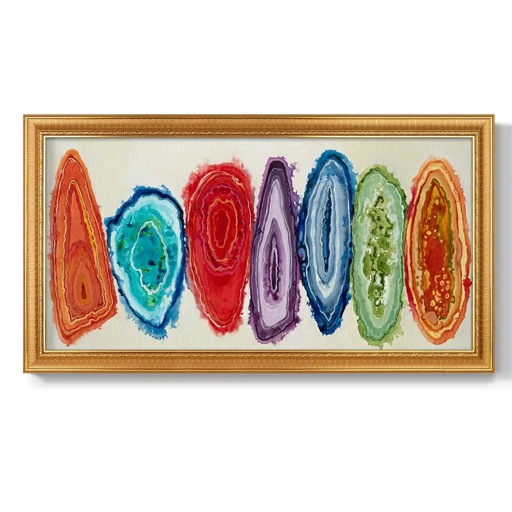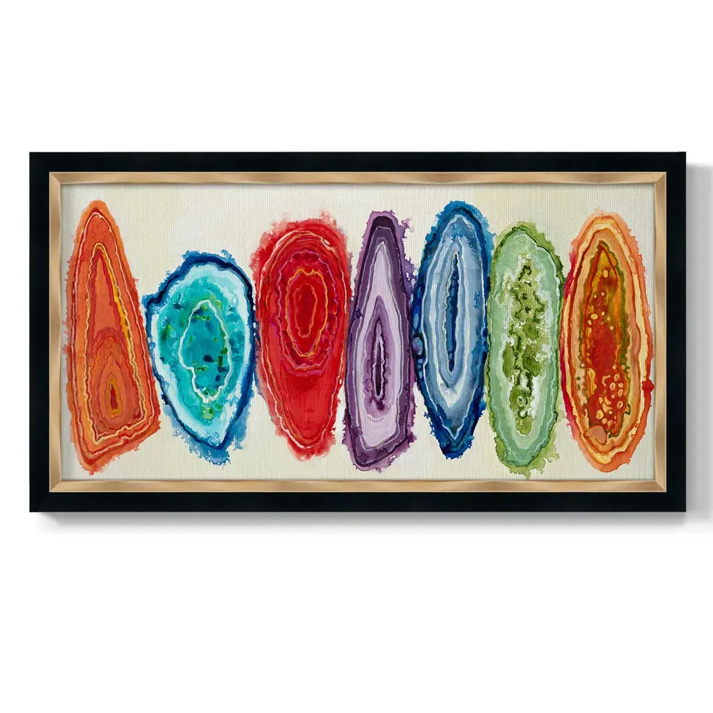 Geode Slice Premium Framed Canvas- Ready to Hang A Premium Framed Canvas created to last. Framed in distressed wood and available in an array of sizes and colors Featuring a beveled a solid wood stretcher bar, each piece comes ready to hand 3 SIZES AVAILABLE 21''X37'' - Overall Size 25''X45'' - Overall Size 29''x53'' - Overall Size Each piece is made to order. Each piece comes with hanging hardware. Made in the USA Ready to Hang Giclee Paper Print Acrylic Glass Beveled Matt Board