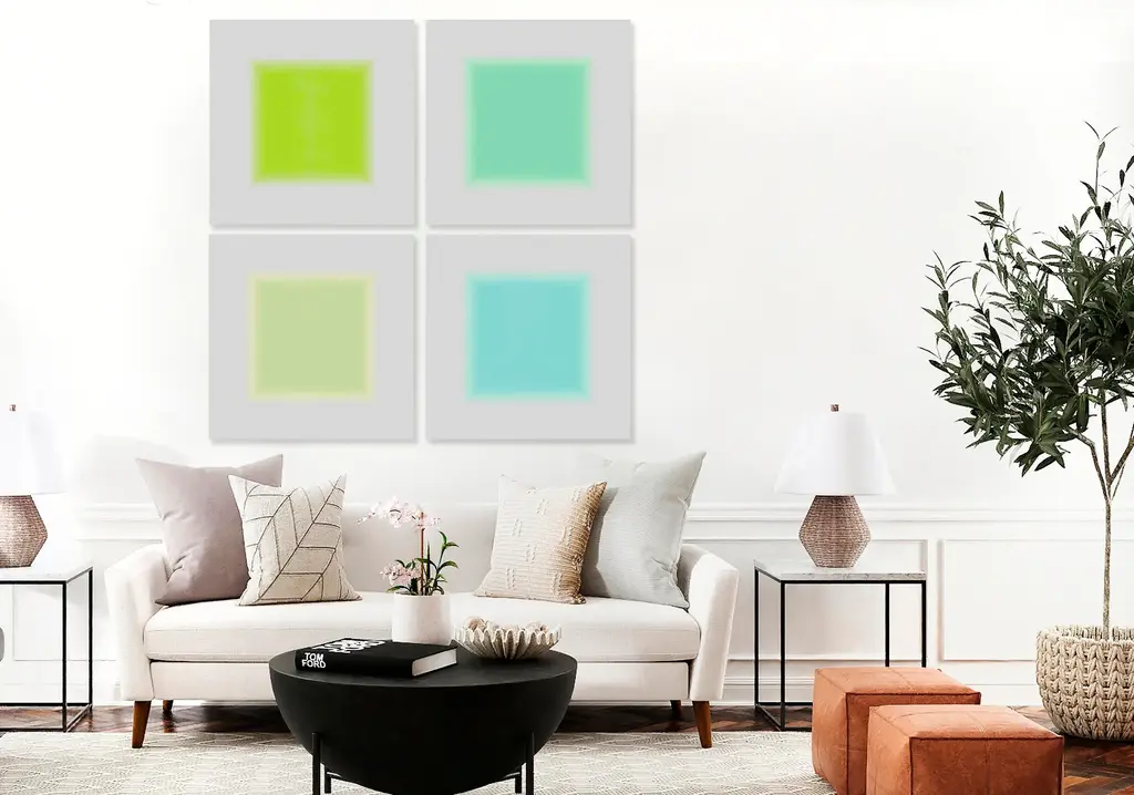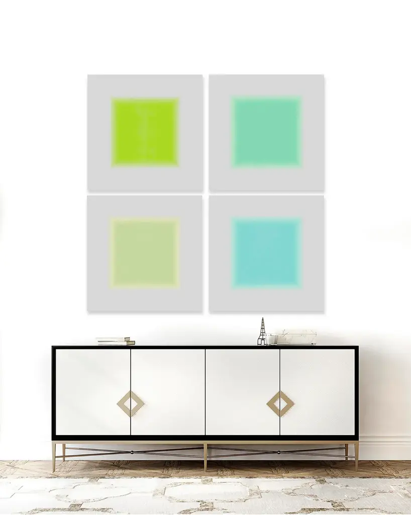 Minimalist contemporary art with square colour inside a grey background. This 4 piece artwork set has beautiful tones of green and teal that coordinate perfectly together, in geometric style. Art prints are made with exceptional quality inks on premium archival matte paper. Each fine art print is signed and approved for the highest colour and quality. Each of 4 art prints are 24x24 inches. About Angela Cameron Angela's art and photography career spans over several decades and achieving numerous awards along the way. Cameron's mission is to continually explore what she sees all around us and interpret with creative abstraction. Her dedication to the craft of creating artwork continues to this day with new works being introduced frequently, Cameron's work can be found in numerous hotels worldwide as well as many private collections, healthcare spaces and corporate collections.