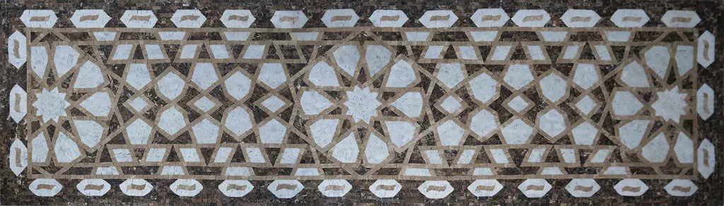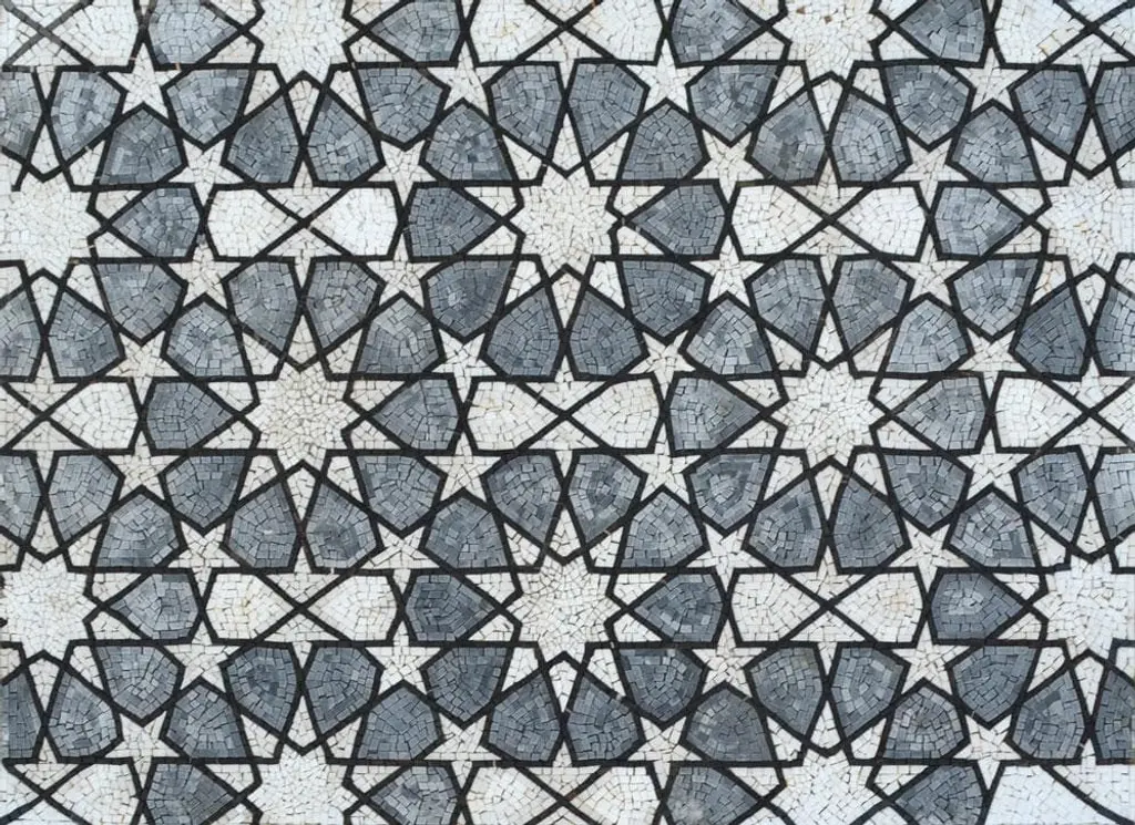 A mesmerizing mosaic artwork that showcases a captivating pattern of interlocking stars, a testament to the beauty of geometric design. The contrasting tones of grey and white create a visually dynamic composition, drawing the viewer's eye across the intricate network of shapes. This mosaic is a celebration of symmetry and precision, its timeless design adding a touch of elegance and sophistication to any space.