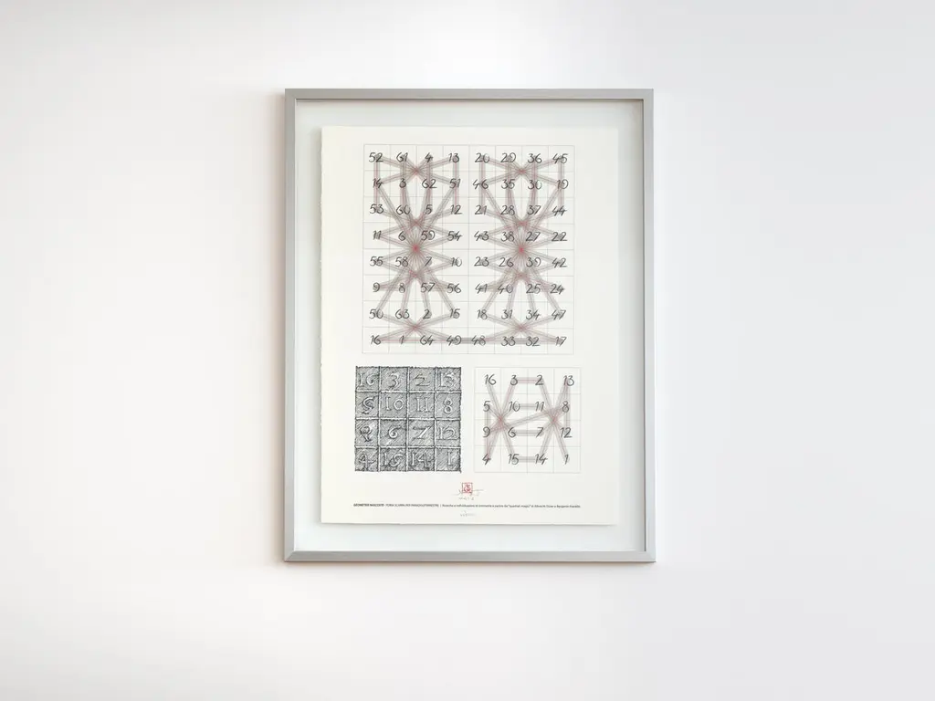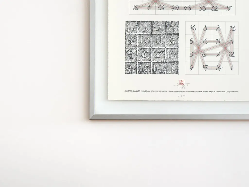 An artistic project by the Venetian architect who, on the occasion of the exhibition Tobia Scarpa _ Dall’arte della misura silenziosamente (Paradisoterrestre Gallery – Bologna, 2020), creates three limited edition artworks for Paradisoterrestre, starting from an interpretation of Melencolia I, enigmatic masterpiece realized by Albrecht Dürer in 1514.Tobia Scarpa breaks down the representation, extrapolating two of the key elements present in Dürer’s engraving related to the geometric-mathematical field: the polyhedron and the magic square.In Geometrie Nascoste – a limited edition of 100 prints, signed and numbered – the architect focuses on the magic square, researching and identifying symmetries in the numerical configurations of Dürer and Benjamin Franklin.