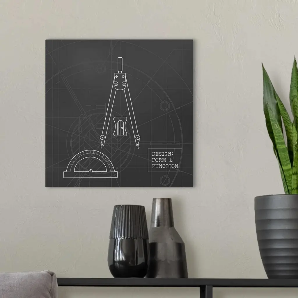 Illustration of a compass, pencil sharpener, and a protractor in a black and white blueprint style with "Design: Form and Function" written in the bottom corner.