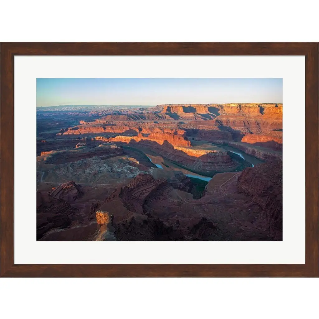 Canyonlands at Sunrise by George Cannon is a high quality piece of framed artwork. The finished size of this piece is 30.75" X 22.75". It has a Slim Solid Pecan Brown Flat with Satin Finish frame, is single matted and finished with high quality Acrylic Plexiglass. 100% Satisfaction Guaranteed.