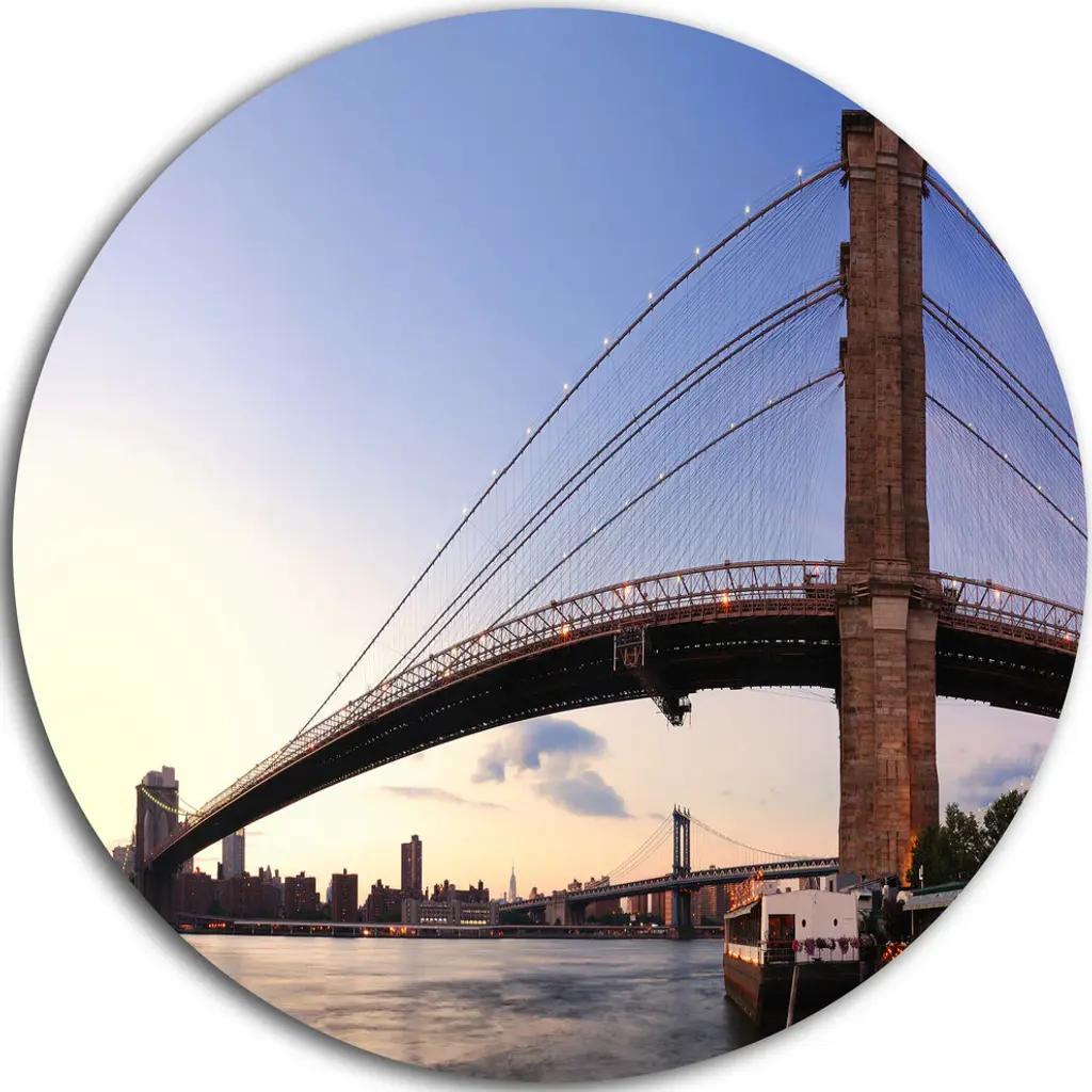 Bring Contemporary Abstraction to your home with this large Circle Metal wall art. This George Washington Bridge Metal Artwork makes it the focal point of any room or office. - White Gloss Coating ensures colors are extra vibrant with light reflection.- Aluminum grade Sheet Metal with 1 inch mounting frame on the back giving the illusion that the artwork is floating on the wall..- Mounting Brackets are included along with instructions.- High Quality Digital images are created directly into a glossy aluminum panel producing a stunning and captivating print into the glossy finish of the metal.- Water, Fire and Scratch resistant HD Aluminum panels.- Looks better than any photo paper and guaranteed to last at least 20 years- Easy to clean with a microfiber cloth. Colors are far superior to regular Canvas Art. - Easy to Hang