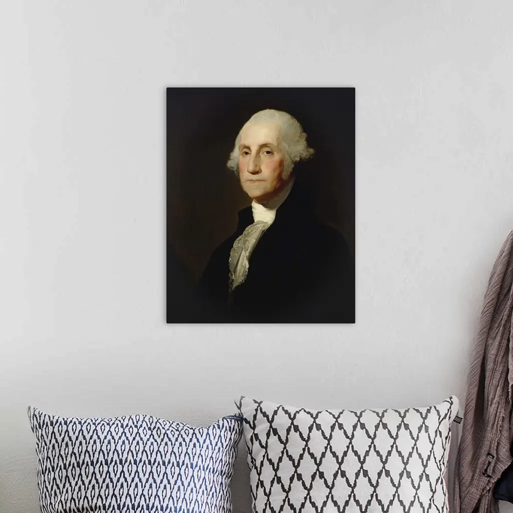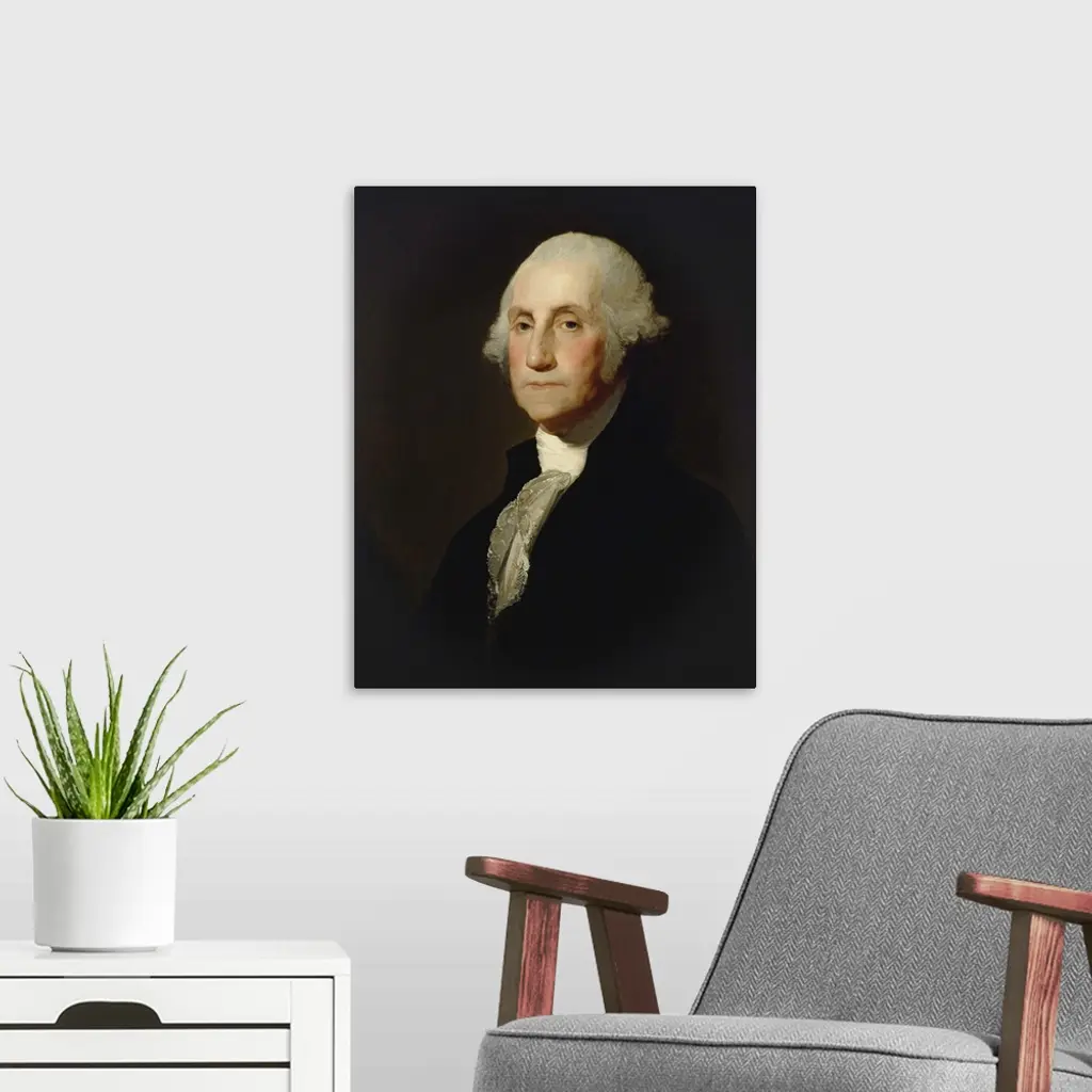 George Washington, by Gilbert Stuart, c. 1803-05, American painting, oil on canvas. In 1796 Washington sat for Stuart who created the famous, but never finished 'Athenaeum' portrait. From that work, he sold up to 70 of his reproductions, such as this one,