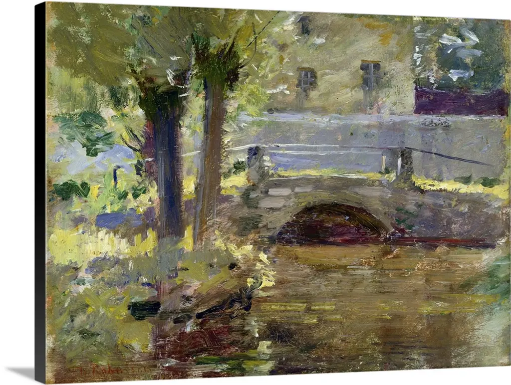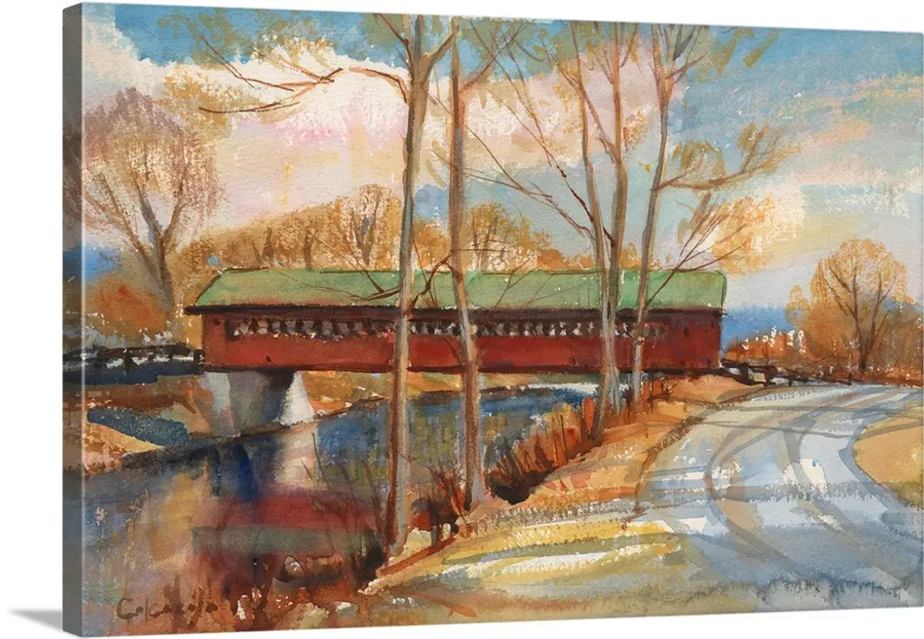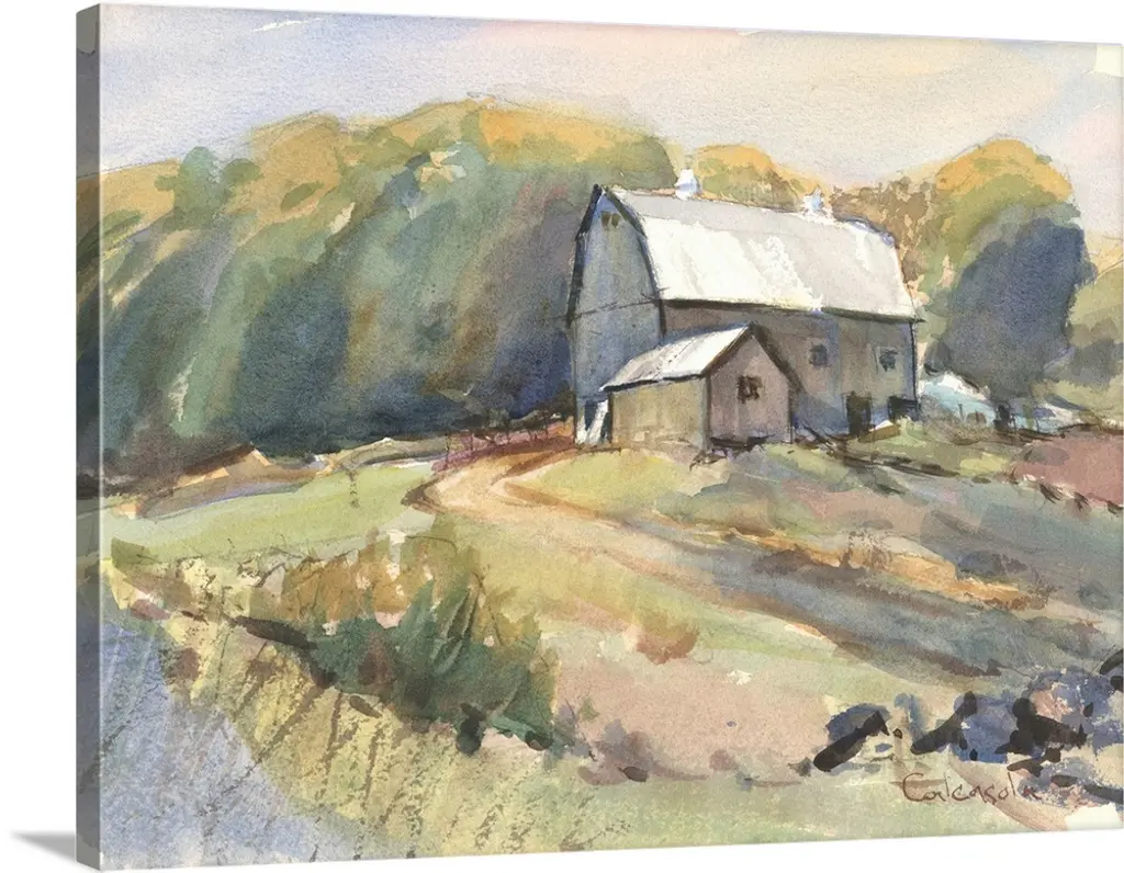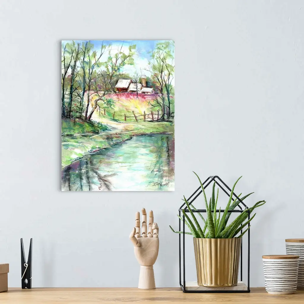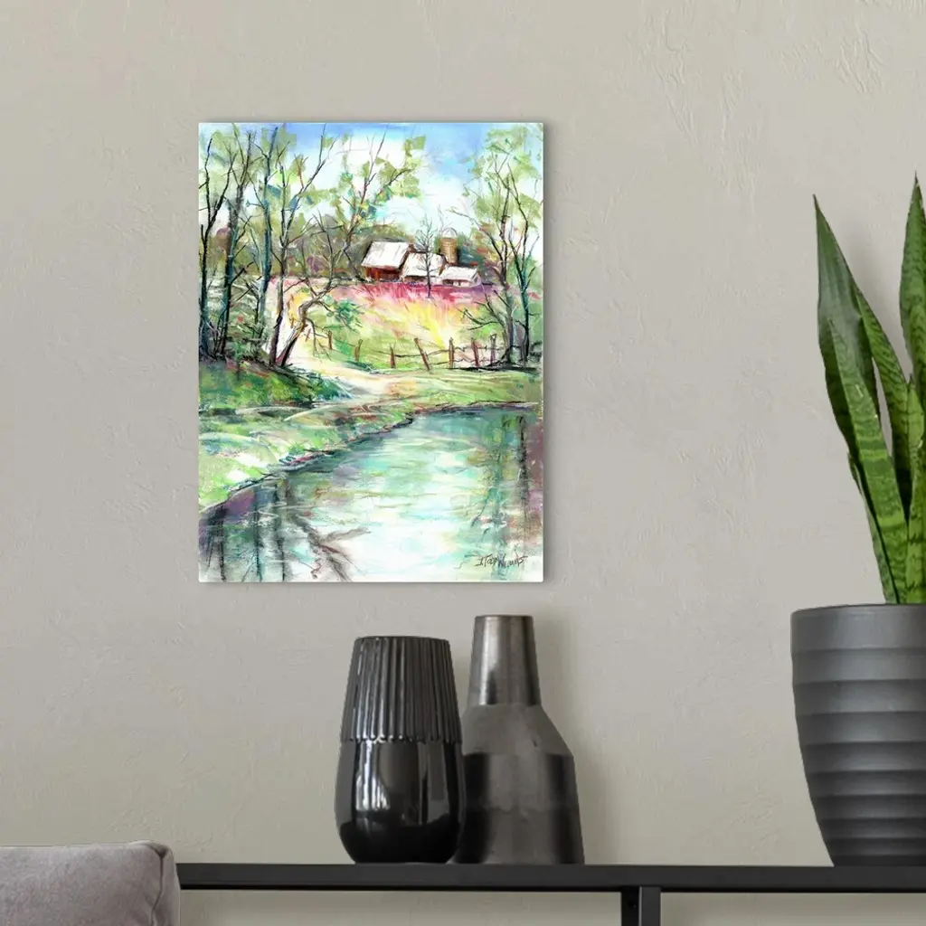 Colorful landscape painting of a pond with a path leading up to a large barn.