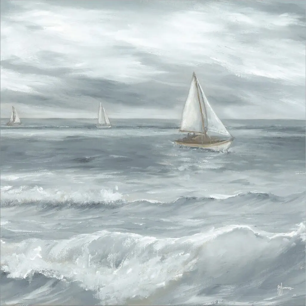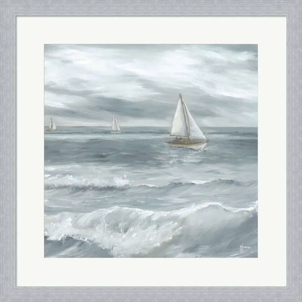Three Sailboats by Georgia Janisse is a high quality piece of framed artwork. The finished size of this piece is 19.5" X 19.5". It has a Slim Platinum Silver frame, is single matted and finished with high quality Glass. 100% Satisfaction Guaranteed.