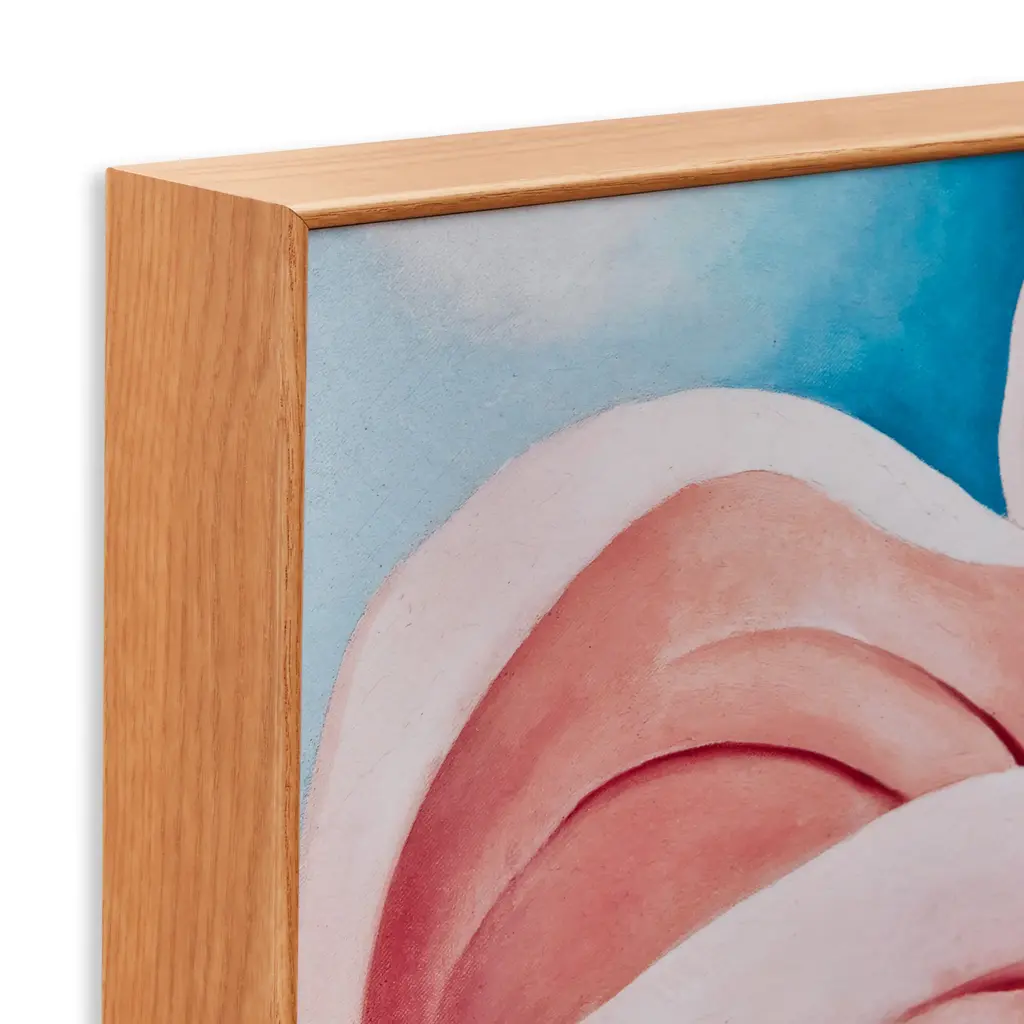 This print features a reproduction of Hibiscus with Plumeria (1939) by Georgia O'Keeffe, an artist with work in MoMA's collection. It’s mounted and laminated for protection from dust and UV rays, and floated in a hand-stained, natural, 2"-deep frame made from ash wood grown in sustainable forests. Hanging kit included. The Georgia O’Keeffe Hibiscus Framed Print measure 26h x 19w x 2”d.