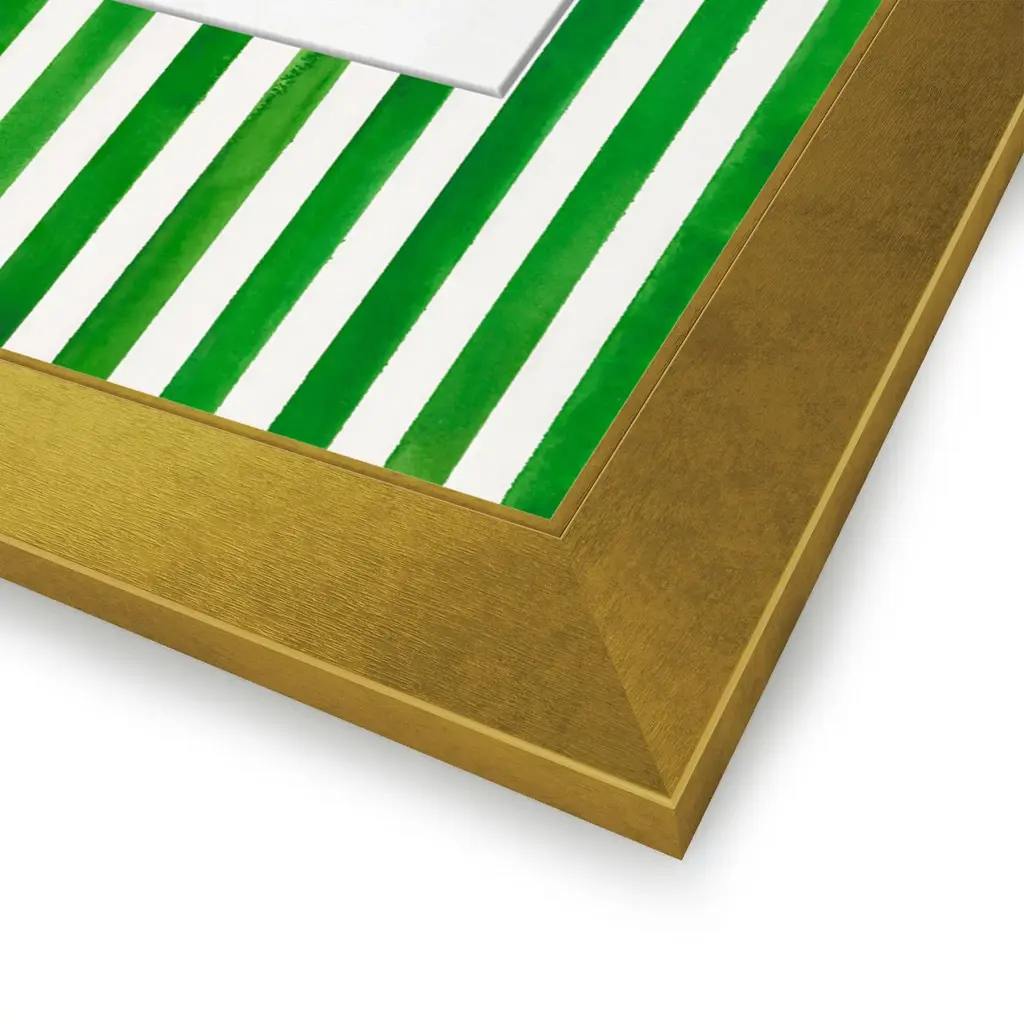 DESCRIPTION: Geranium with Green Stripe Diptych by Lia Burke Libaire in Gold Frame, Small Art Prints SPECIFICATIONS: Type: Giclée Art Print on Framed Paper. Overall Size (in): 19.5x24 (each). Image Size (in): 16.5x21 (each). Orientation: Vertical. Flush/Float/Matted: Flush. Frame Color: Gold. Hanging Hardware: Picture Perfect. 2 pieces are included with this purchase. FRAMING: Each art work arrives framed and ready to hang. We use handmade frames with a plexiglass glazing front, because it offers less glare than standard glass. At this time, we only offer framed prints. ARTIST BIO: Lia Burke Libaire is a Charleston based visual artist and designer. She began her career in New York City, translating her love of art and architecture into the world of interior design where she worked for 12 years. After relocating to Charleston, Libaire pursued her artistic craft full time and established her permanent studio. Since then she has worked on a broad range of commissions, collaborations and branding and packaging designs. Botanicals, the sea, astrological constellations and her signature ‘evil eye’ are common themes in her vibrant and often irreverent work. Libaire’s work has been featured in Vogue, Australian Vogue, and Garden & Gun among others. Her large scale portraits are displayed in national theater chain Showcase Cinemas.