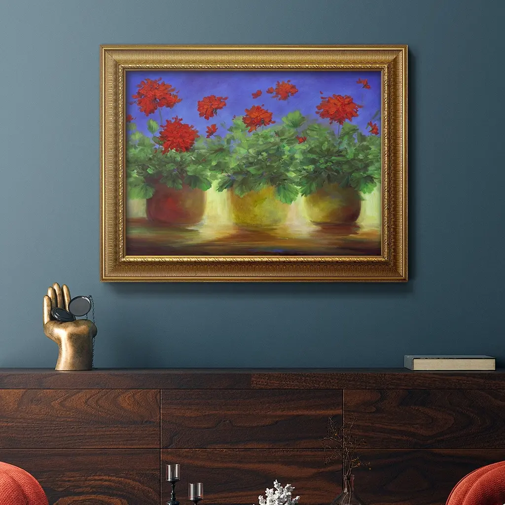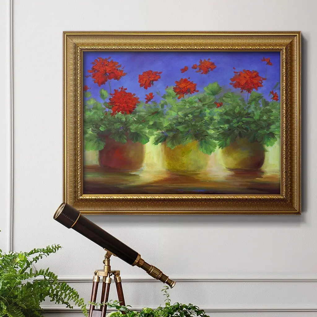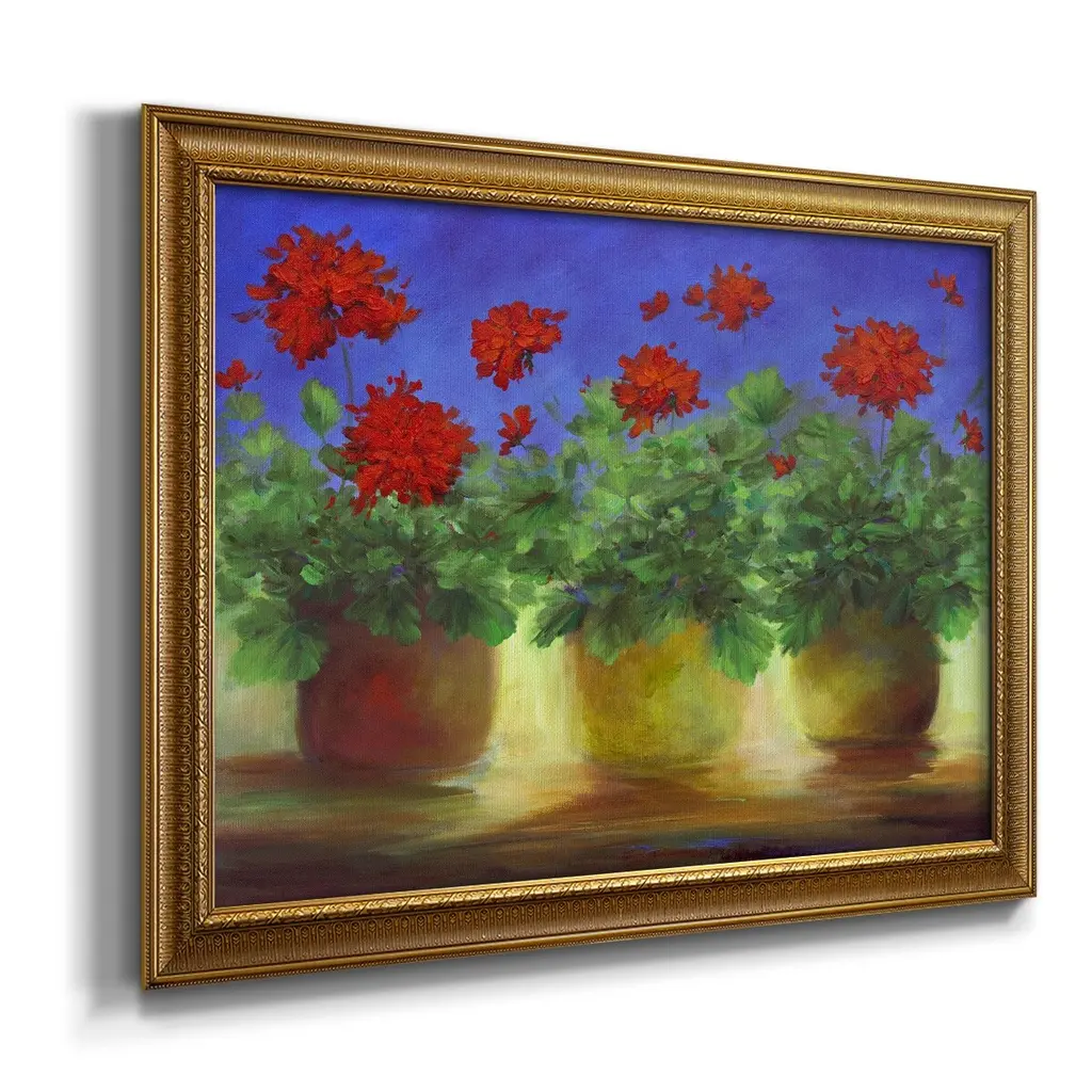 Geraniums II Premium Framed Canvas- Ready to Hang A Premium Framed Canvas created to last. Framed in distressed wood and available in an array of sizes and colors Featuring a beveled a solid wood stretcher bar, each piece comes ready to hand 3 SIZES AVAILABLE 16''X20'' - Overall Size 18'X27'' - Overall Size 24''x36'' - Overall Size Each piece is made to order. Each piece comes with hanging hardware. Made in the USA Ready to Hang Giclee Paper Print Acrylic Glass Beveled Matt Board
