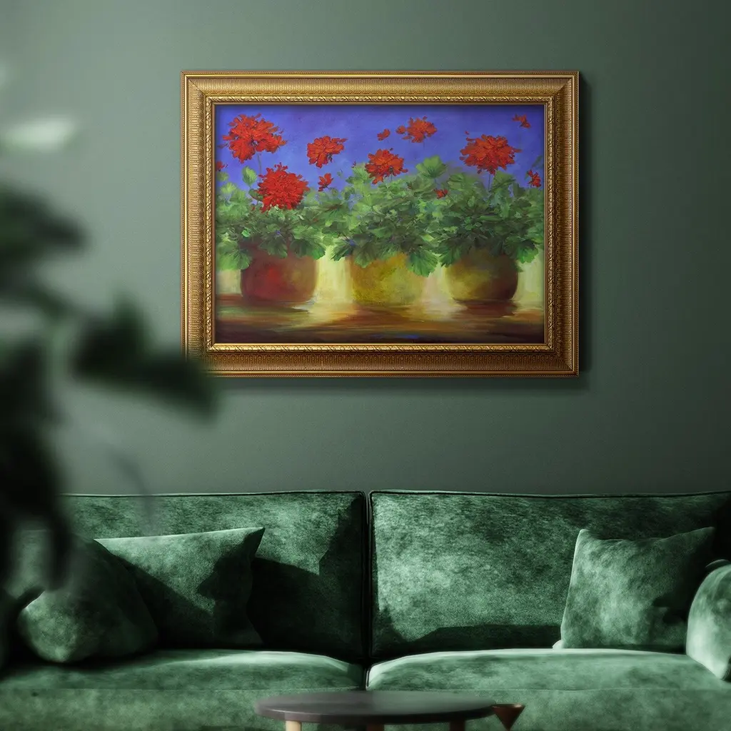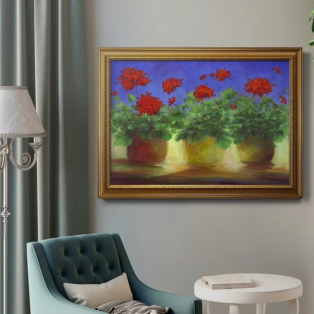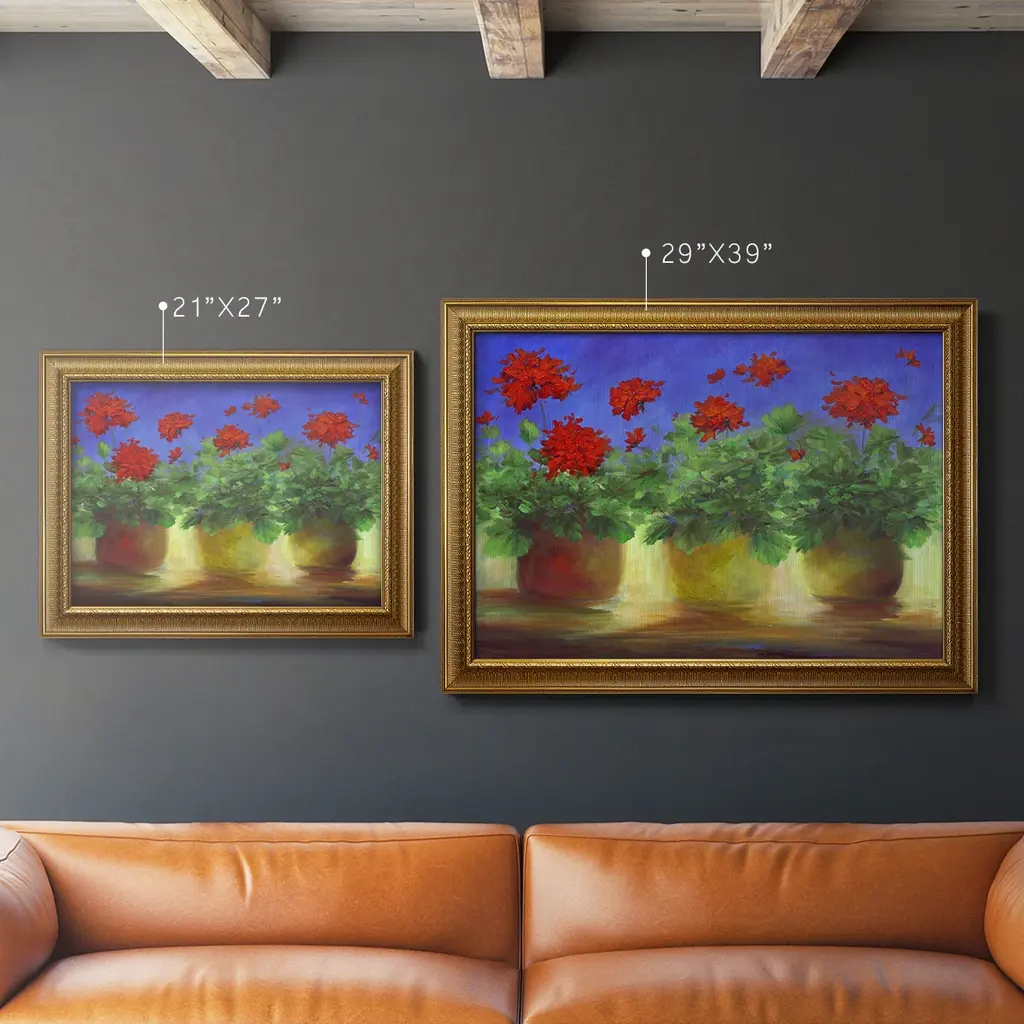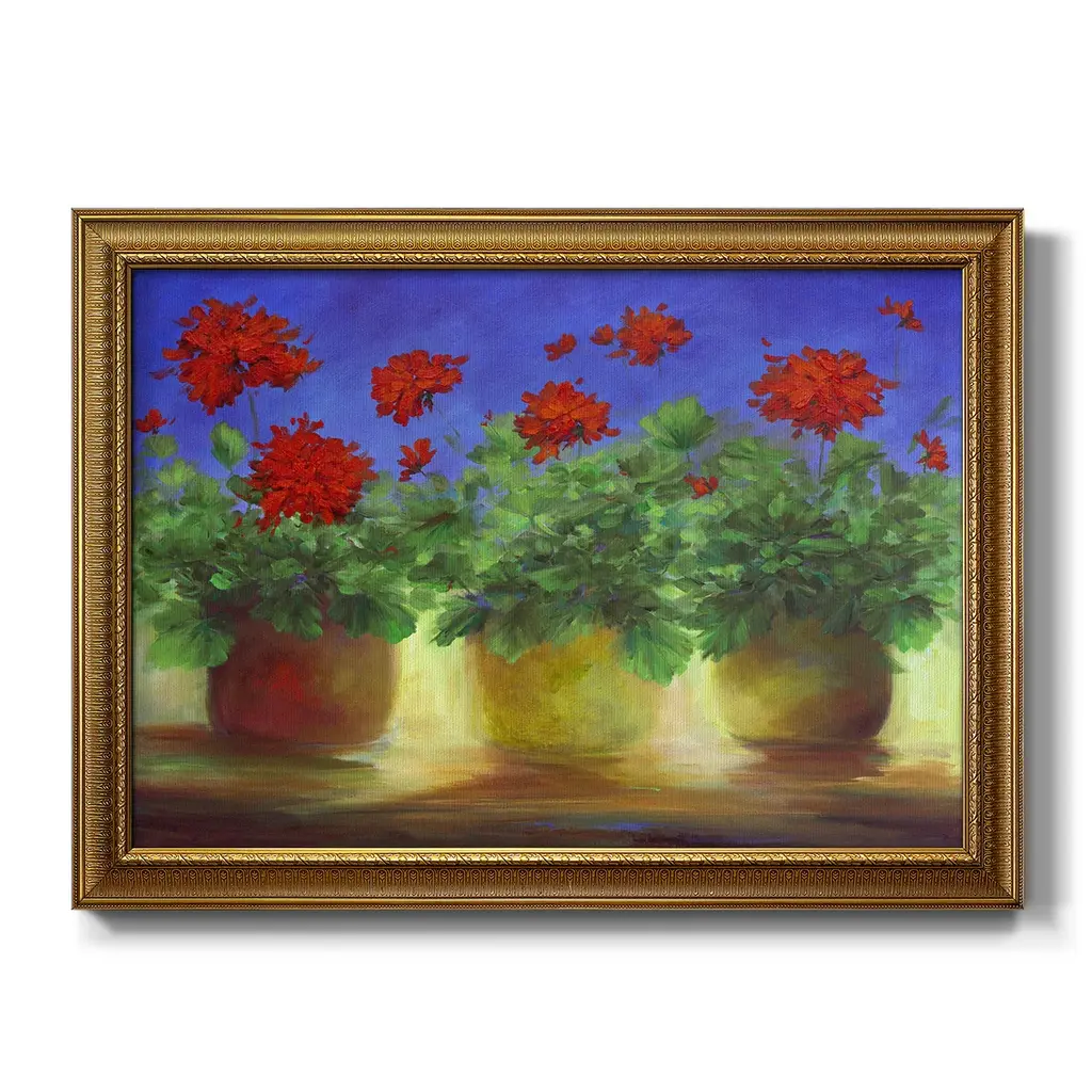 Geraniums II Premium Framed Canvas- Ready to Hang A Premium Framed Canvas created to last. Framed in distressed wood and available in an array of sizes and colors Featuring a beveled a solid wood stretcher bar, each piece comes ready to hand 3 SIZES AVAILABLE 16''X20'' - Overall Size 18'X27'' - Overall Size 24''x36'' - Overall Size Each piece is made to order. Each piece comes with hanging hardware. Made in the USA Ready to Hang Giclee Paper Print Acrylic Glass Beveled Matt Board