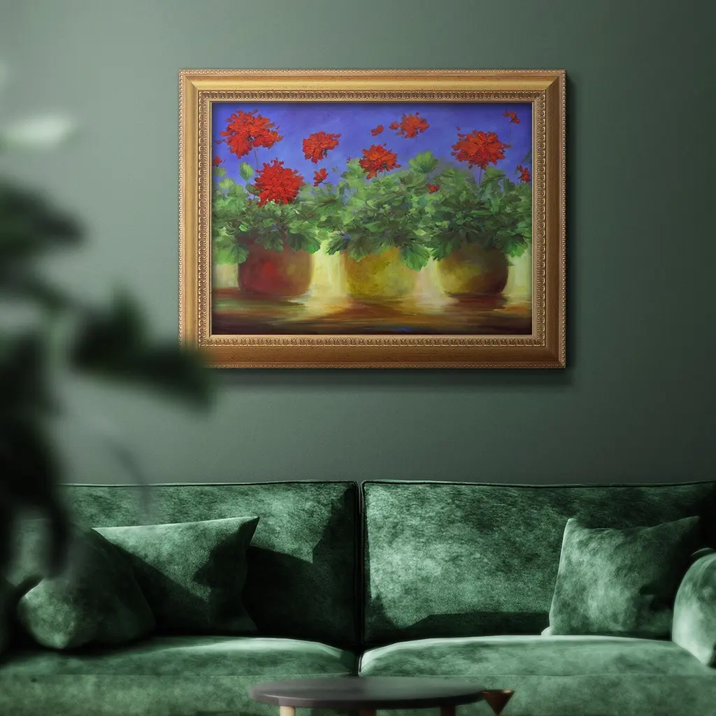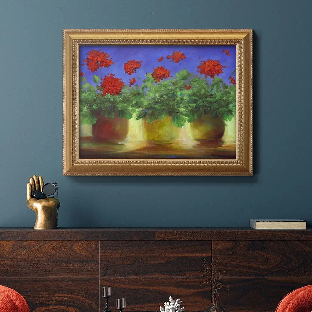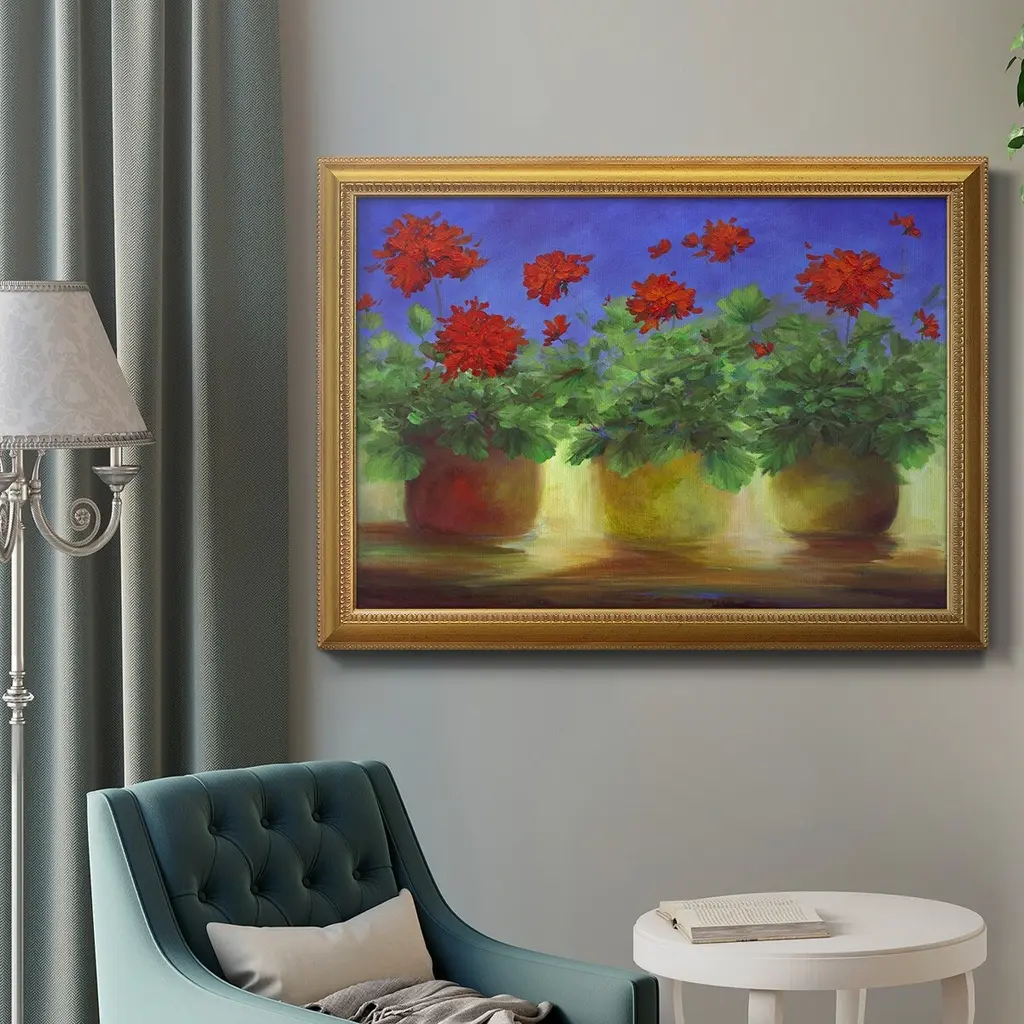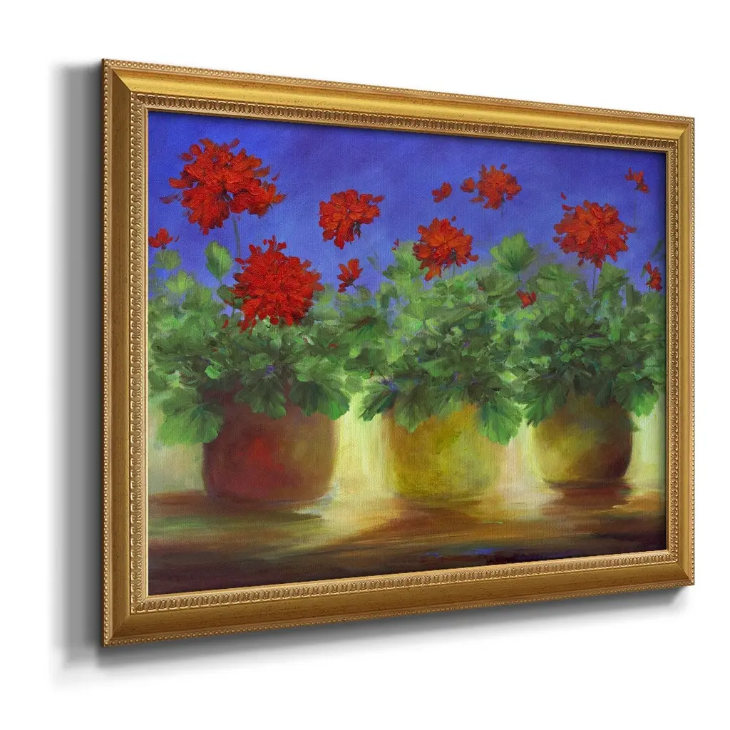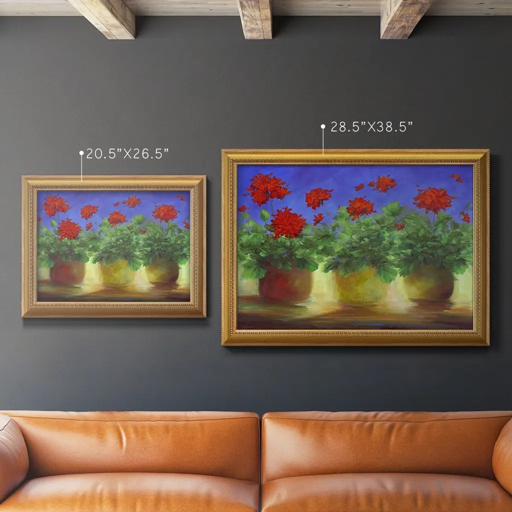 Geraniums II Premium Framed Canvas- Ready to Hang A Premium Framed Canvas created to last. Framed in distressed wood and available in an array of sizes and colors Featuring a beveled a solid wood stretcher bar, each piece comes ready to hand 3 SIZES AVAILABLE 16''X20'' - Overall Size 18'X27'' - Overall Size 24''x36'' - Overall Size Each piece is made to order. Each piece comes with hanging hardware. Made in the USA Ready to Hang Giclee Paper Print Acrylic Glass Beveled Matt Board