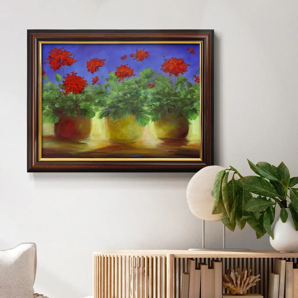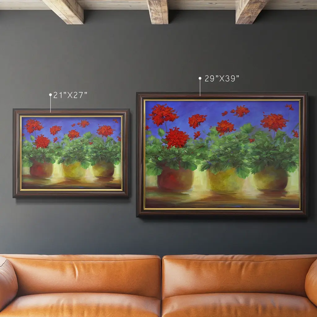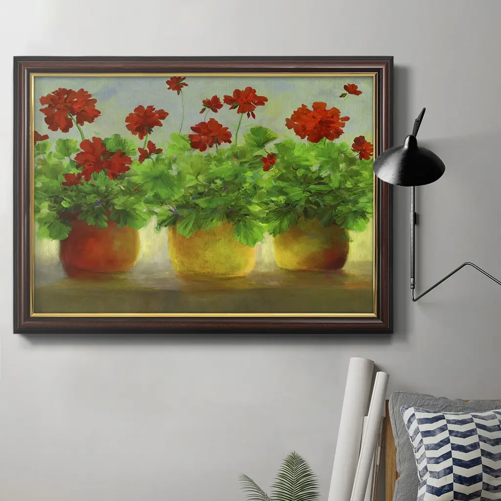 Geraniums II Premium Framed Canvas- Ready to Hang A Premium Framed Canvas created to last. Framed in distressed wood and available in an array of sizes and colors Featuring a beveled a solid wood stretcher bar, each piece comes ready to hand 3 SIZES AVAILABLE 16''X20'' - Overall Size 18'X27'' - Overall Size 24''x36'' - Overall Size Each piece is made to order. Each piece comes with hanging hardware. Made in the USA Ready to Hang Giclee Paper Print Acrylic Glass Beveled Matt Board