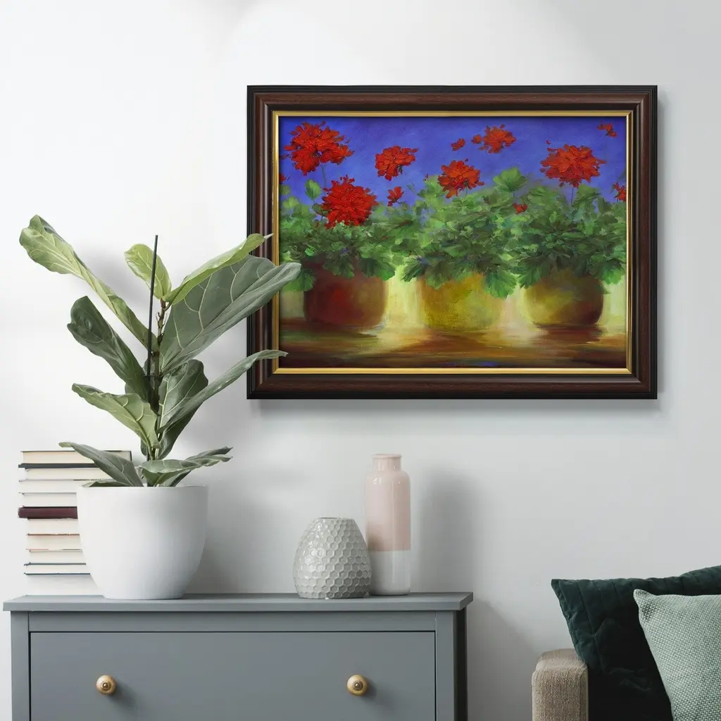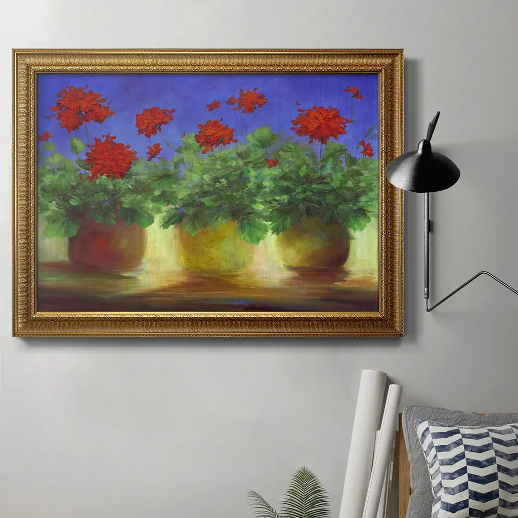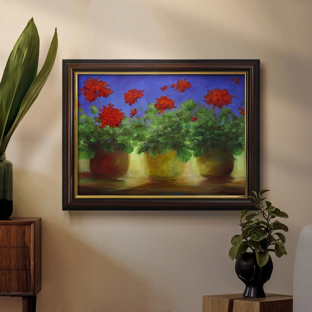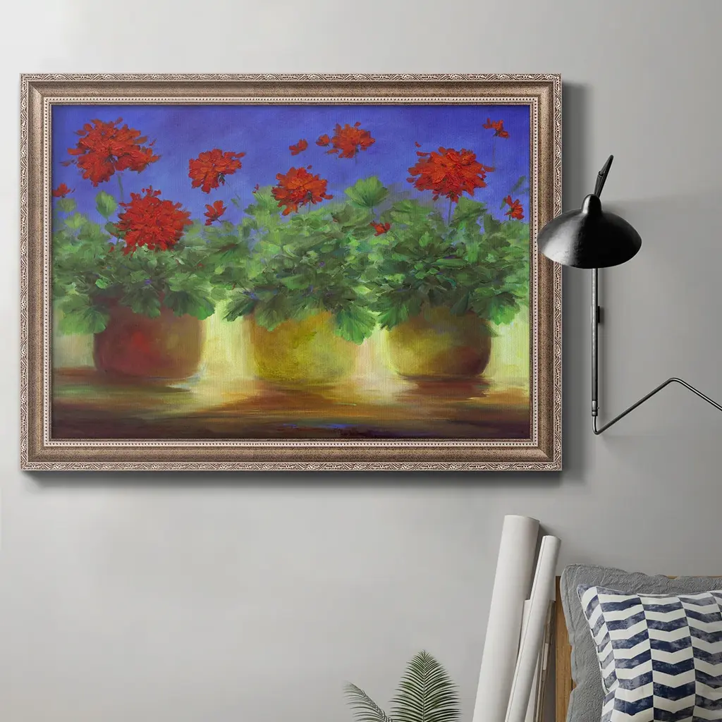 Geraniums II Premium Framed Canvas- Ready to Hang A Premium Framed Canvas created to last. Framed in distressed wood and available in an array of sizes and colors Featuring a beveled a solid wood stretcher bar, each piece comes ready to hand 3 SIZES AVAILABLE 16''X20'' - Overall Size 18'X27'' - Overall Size 24''x36'' - Overall Size Each piece is made to order. Each piece comes with hanging hardware. Made in the USA Ready to Hang Giclee Paper Print Acrylic Glass Beveled Matt Board