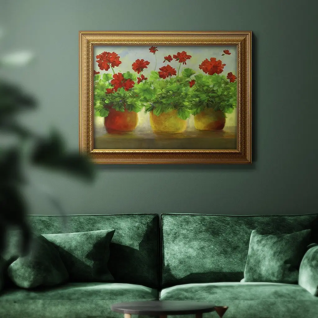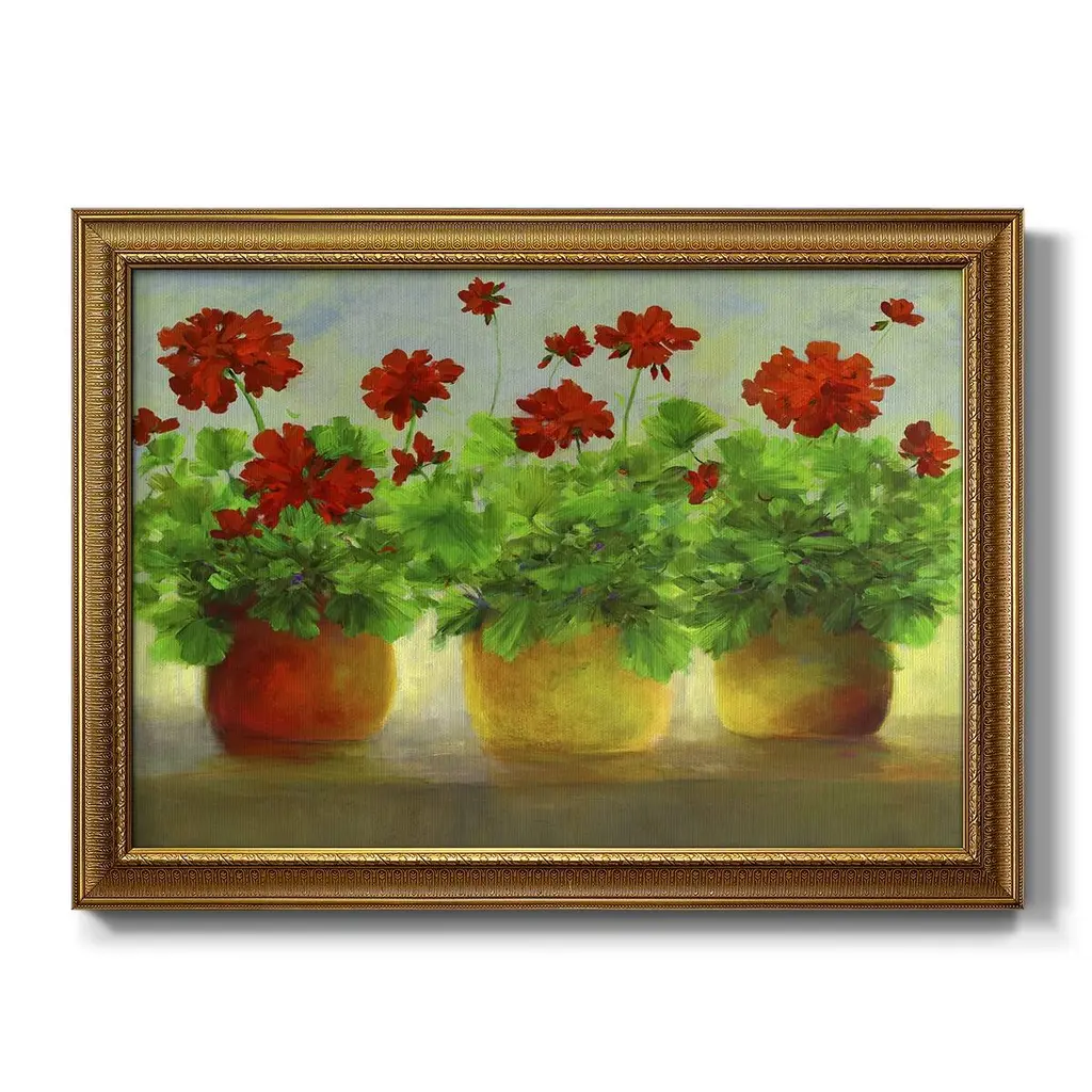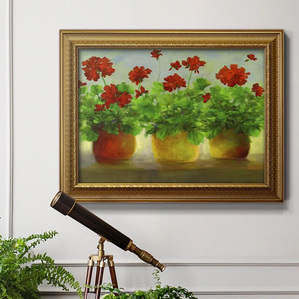 Geraniums III Premium Framed Canvas- Ready to Hang A Premium Framed Canvas created to last. Framed in distressed wood and available in an array of sizes and colors Featuring a beveled a solid wood stretcher bar, each piece comes ready to hand 3 SIZES AVAILABLE 16''X20'' - Overall Size 18'X27'' - Overall Size 24''x36'' - Overall Size Each piece is made to order. Each piece comes with hanging hardware. Made in the USA Ready to Hang Giclee Paper Print Acrylic Glass Beveled Matt Board
