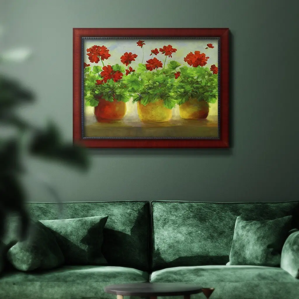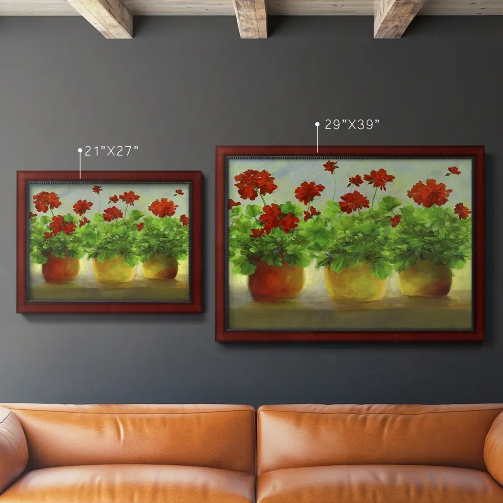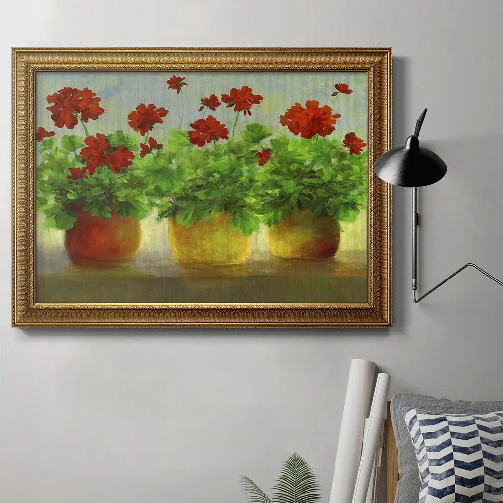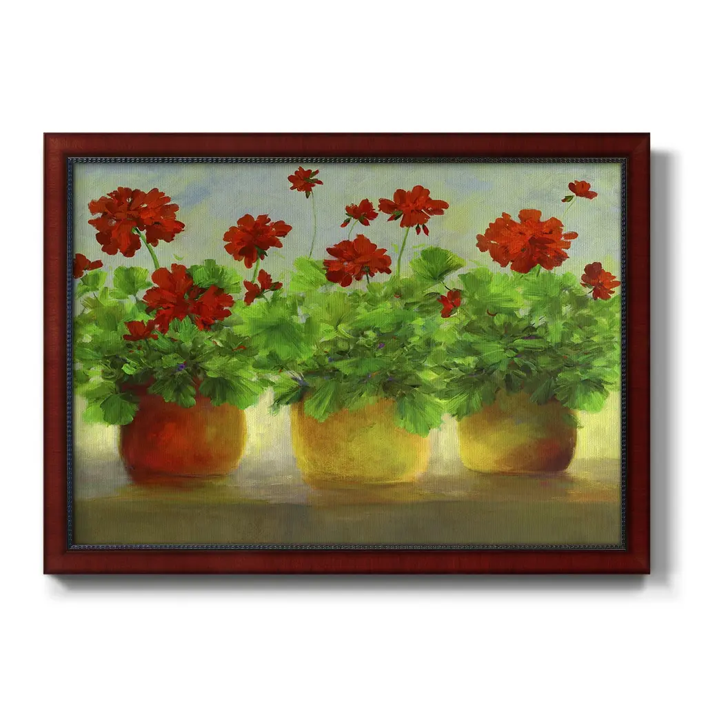 Geraniums III Premium Framed Canvas- Ready to Hang A Premium Framed Canvas created to last. Framed in distressed wood and available in an array of sizes and colors Featuring a beveled a solid wood stretcher bar, each piece comes ready to hand 3 SIZES AVAILABLE 16''X20'' - Overall Size 18'X27'' - Overall Size 24''x36'' - Overall Size Each piece is made to order. Each piece comes with hanging hardware. Made in the USA Ready to Hang Giclee Paper Print Acrylic Glass Beveled Matt Board
