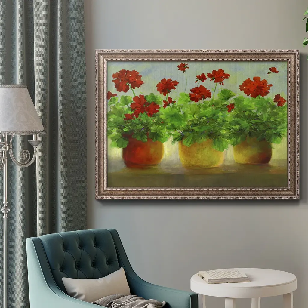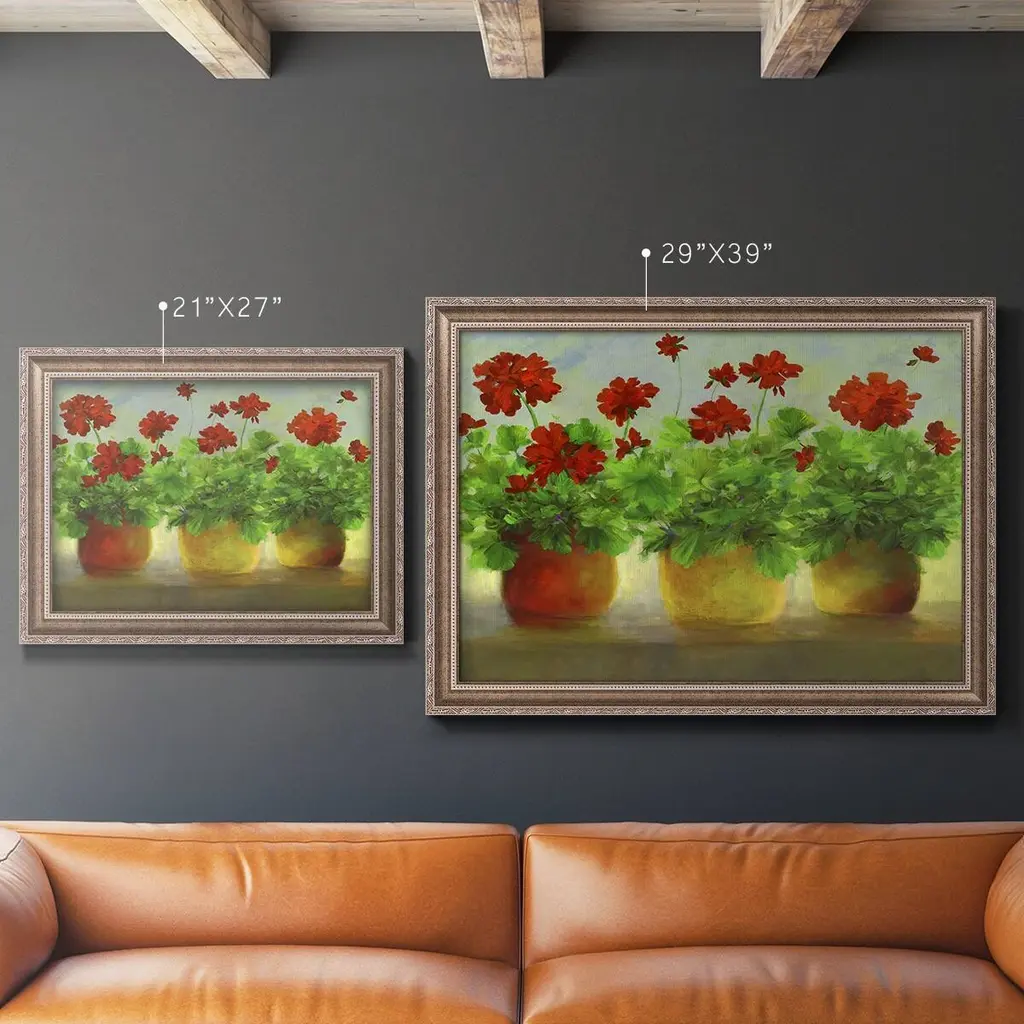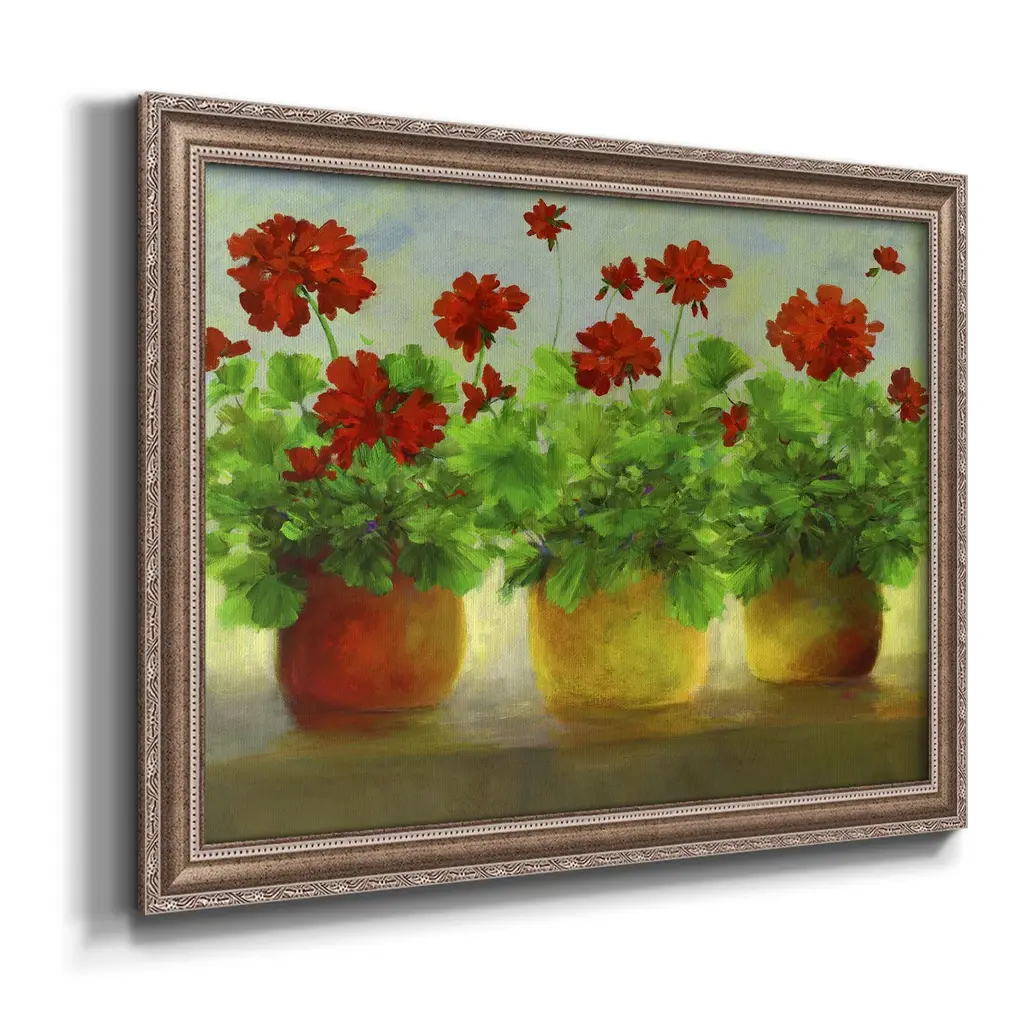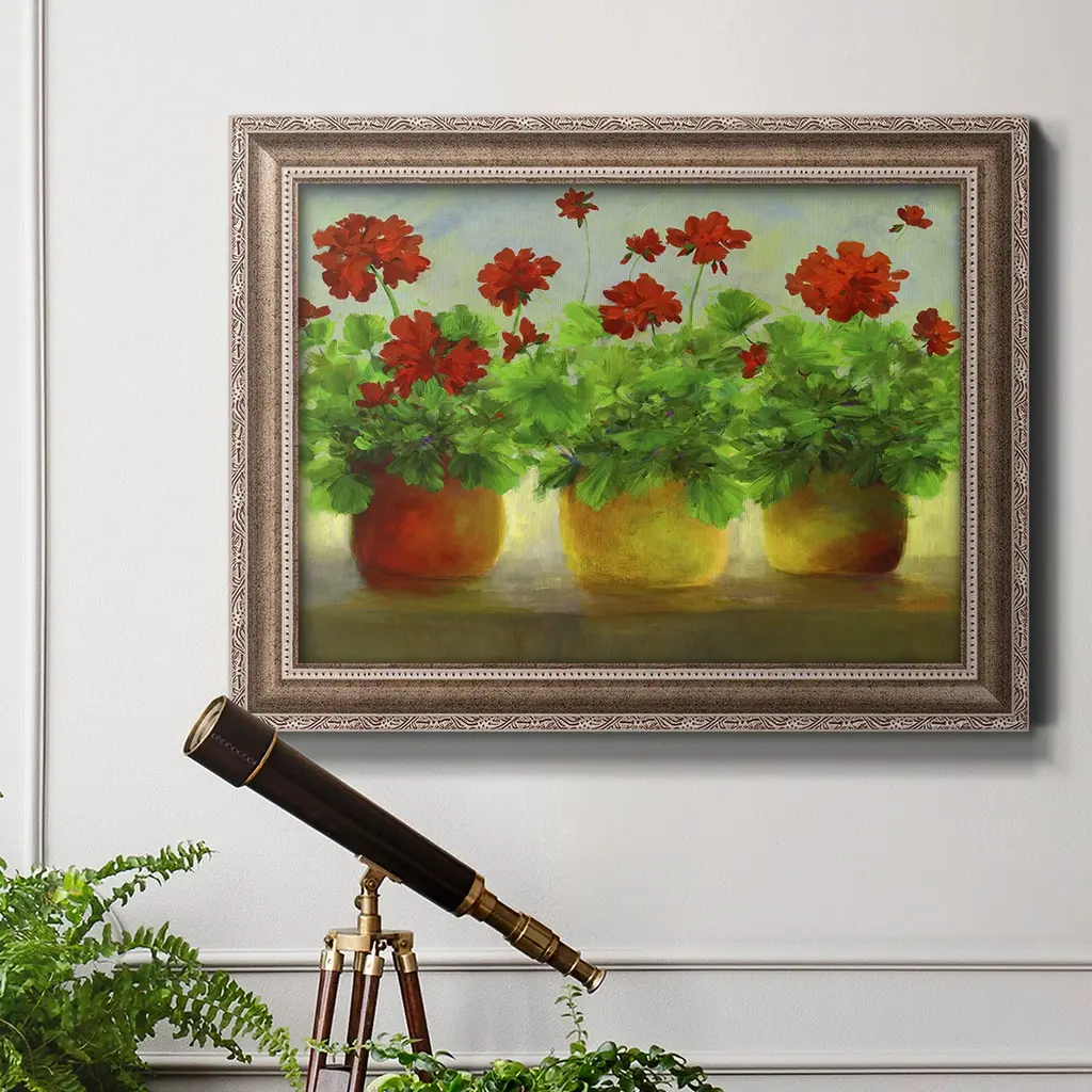 Geraniums III Premium Framed Canvas- Ready to Hang A Premium Framed Canvas created to last. Framed in distressed wood and available in an array of sizes and colors Featuring a beveled a solid wood stretcher bar, each piece comes ready to hand 3 SIZES AVAILABLE 16''X20'' - Overall Size 18'X27'' - Overall Size 24''x36'' - Overall Size Each piece is made to order. Each piece comes with hanging hardware. Made in the USA Ready to Hang Giclee Paper Print Acrylic Glass Beveled Matt Board