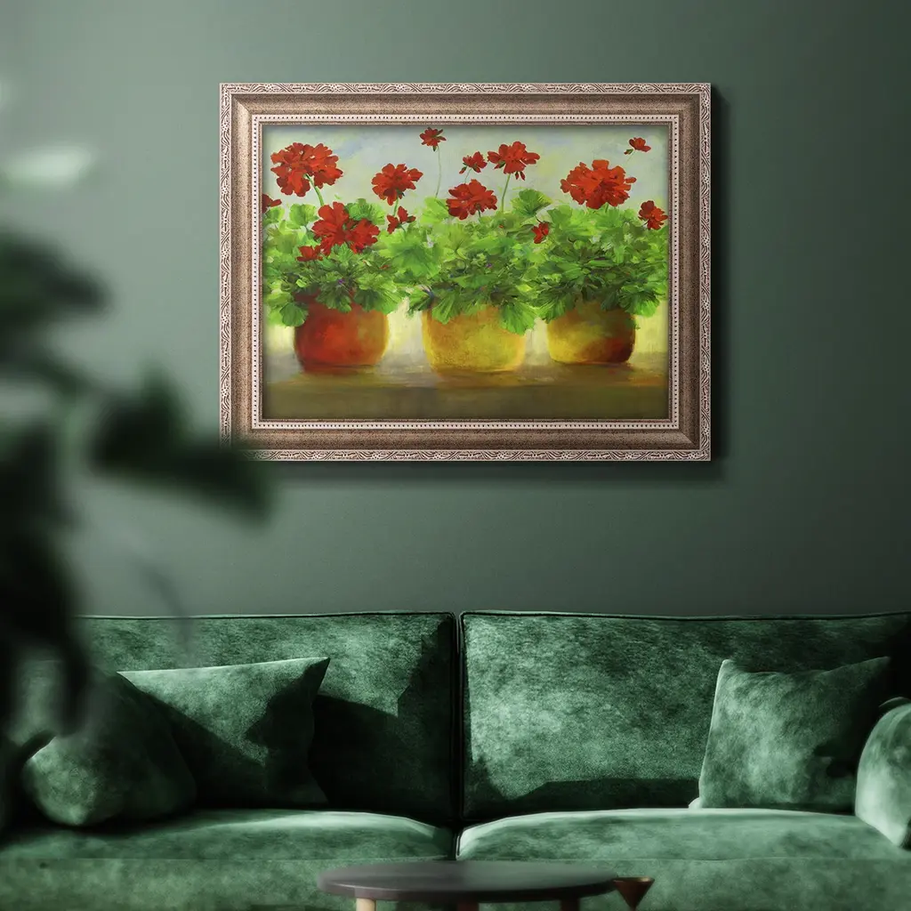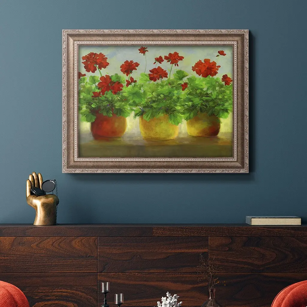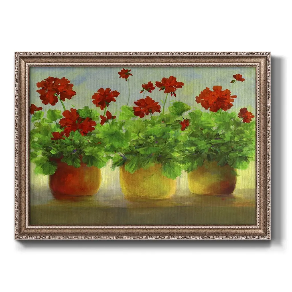 Geraniums III Premium Framed Canvas- Ready to Hang A Premium Framed Canvas created to last. Framed in distressed wood and available in an array of sizes and colors Featuring a beveled a solid wood stretcher bar, each piece comes ready to hand 3 SIZES AVAILABLE 16''X20'' - Overall Size 18'X27'' - Overall Size 24''x36'' - Overall Size Each piece is made to order. Each piece comes with hanging hardware. Made in the USA Ready to Hang Giclee Paper Print Acrylic Glass Beveled Matt Board