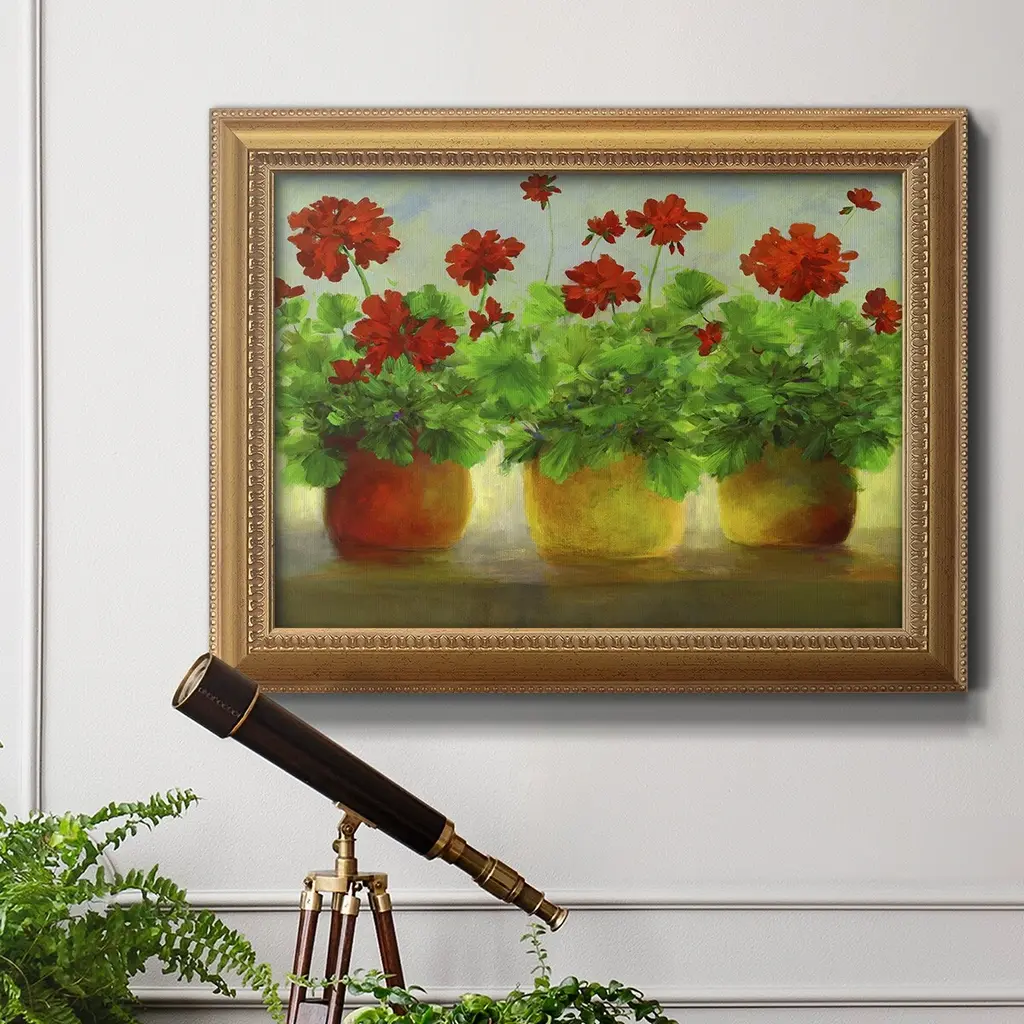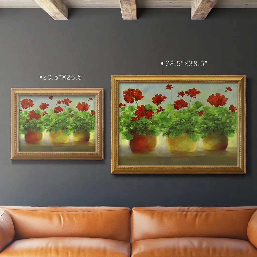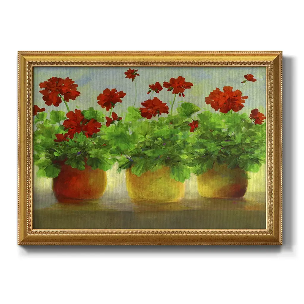 Geraniums III Premium Framed Canvas- Ready to Hang A Premium Framed Canvas created to last. Framed in distressed wood and available in an array of sizes and colors Featuring a beveled a solid wood stretcher bar, each piece comes ready to hand 3 SIZES AVAILABLE 16''X20'' - Overall Size 18'X27'' - Overall Size 24''x36'' - Overall Size Each piece is made to order. Each piece comes with hanging hardware. Made in the USA Ready to Hang Giclee Paper Print Acrylic Glass Beveled Matt Board