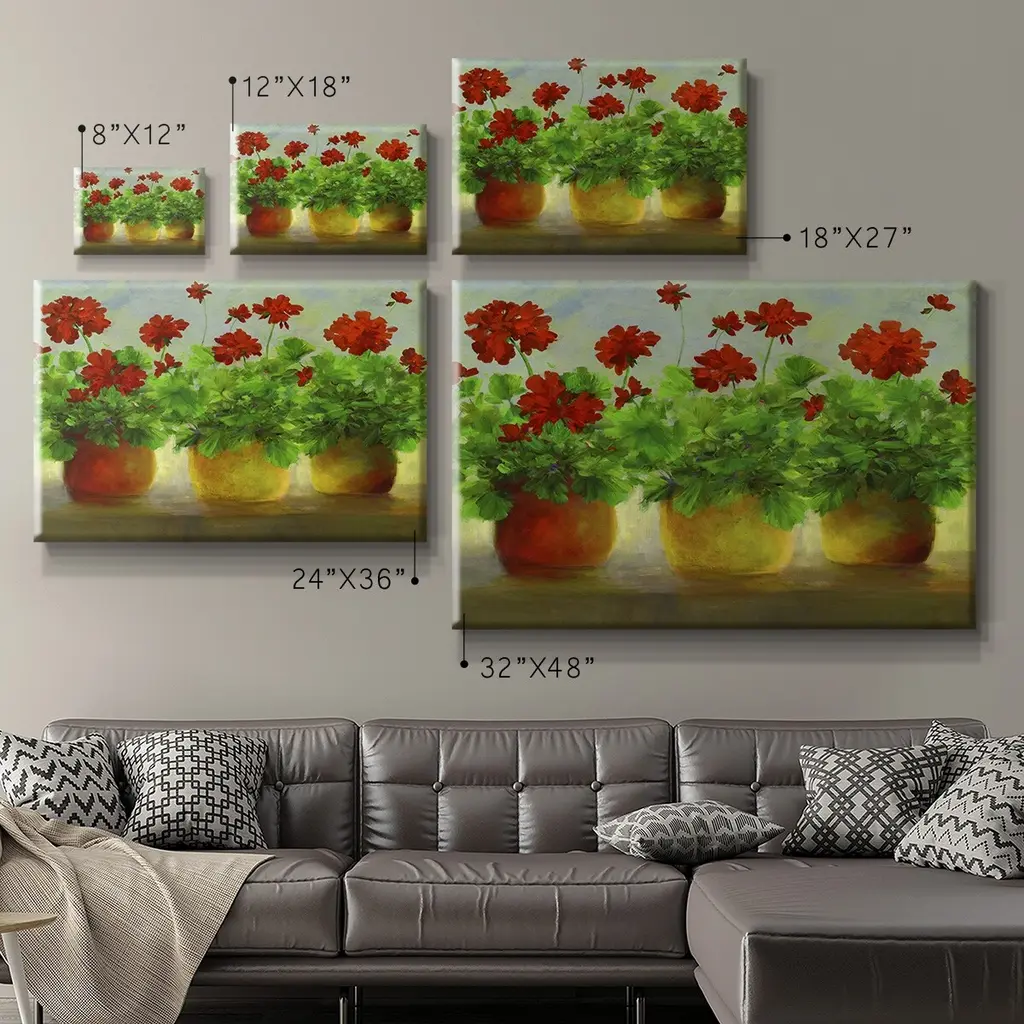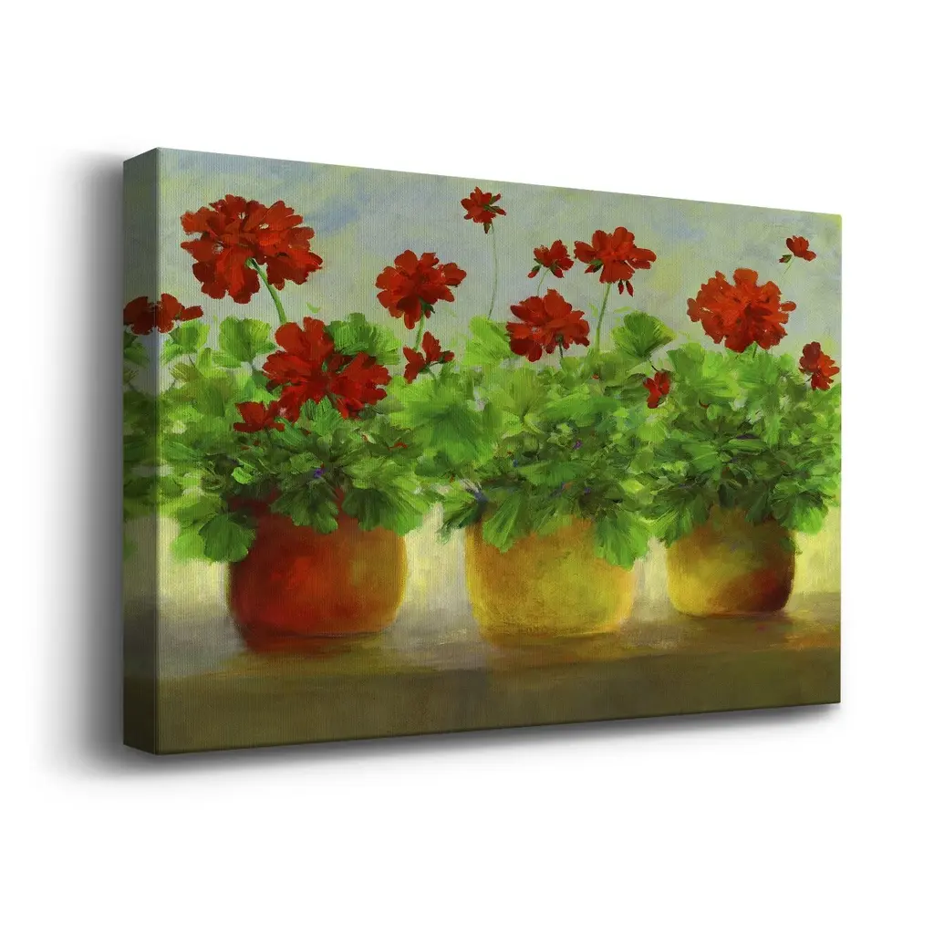 Geraniums III Premium Gallery Wrapped Canvas - Ready to Hang A premium hand stretched gallery wrapped canvas print created to last. Featuring a beveled a solid wood stretcher bar, each piece comes ready to hand 6 SIZES AVAILABLE 8''X12'' - Overall Size 12''X18'' - Overall Size 18''X27'' - Overall Size 24''x36'' - Overall Size 32''x48'' - Overall Size 40''x60'' - Overall Size Each piece is made to order. Built to Last Each piece comes ready to hang Solid wood stretcher Fade and Water resistant Made domestically