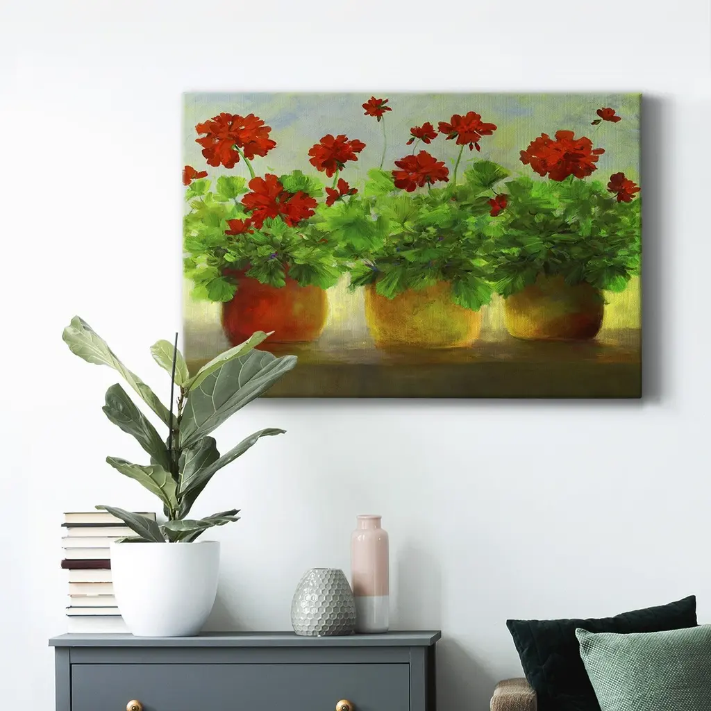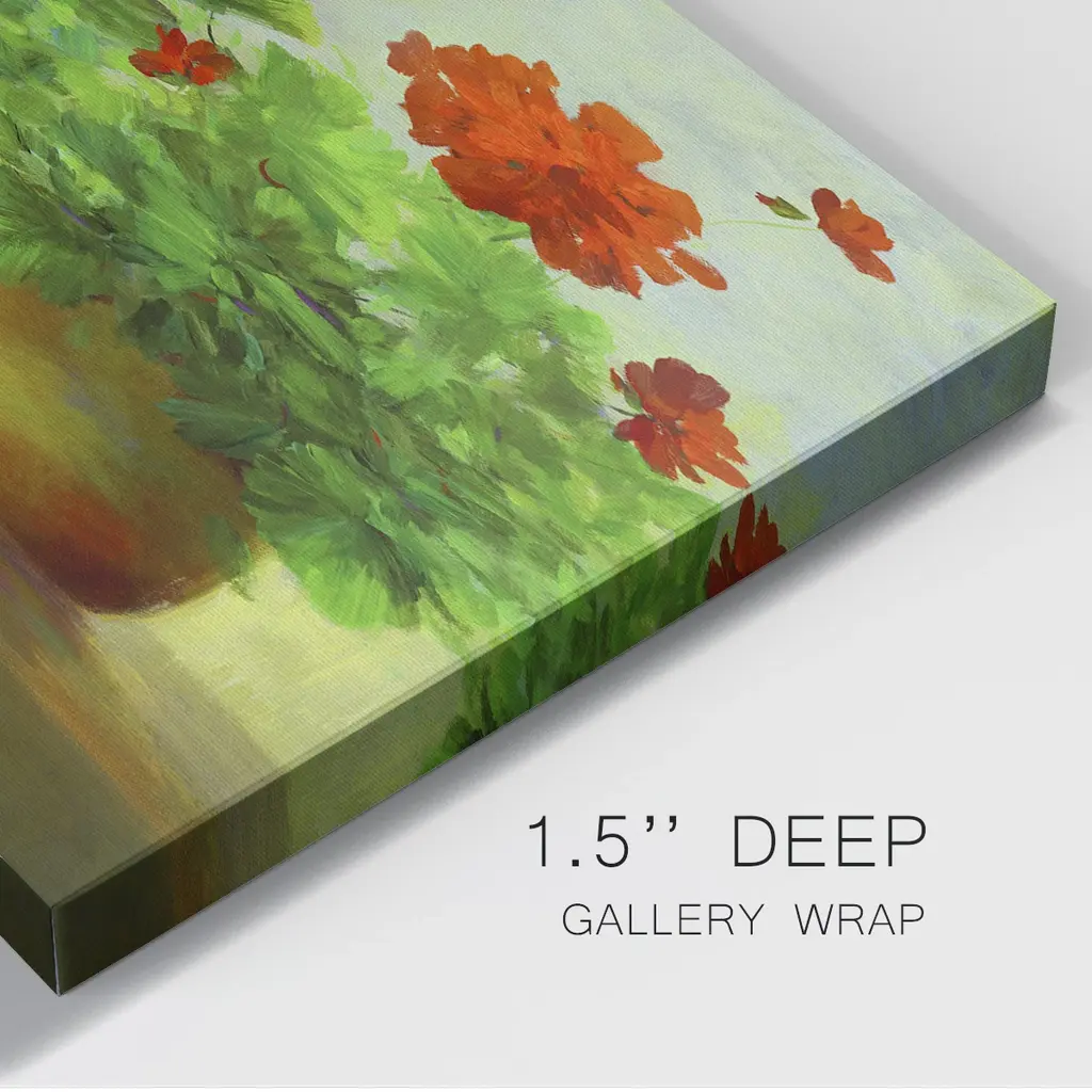 Geraniums III Premium Gallery Wrapped Canvas - Ready to Hang A premium hand stretched gallery wrapped canvas print created to last. Featuring a beveled a solid wood stretcher bar, each piece comes ready to hand 6 SIZES AVAILABLE 8''X12'' - Overall Size 12''X18'' - Overall Size 18''X27'' - Overall Size 24''x36'' - Overall Size 32''x48'' - Overall Size 40''x60'' - Overall Size Each piece is made to order. Built to Last Each piece comes ready to hang Solid wood stretcher Fade and Water resistant Made domestically