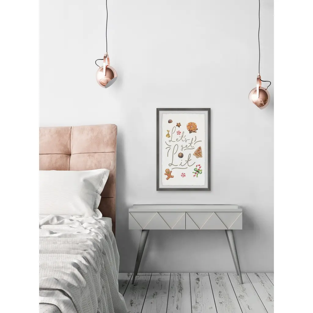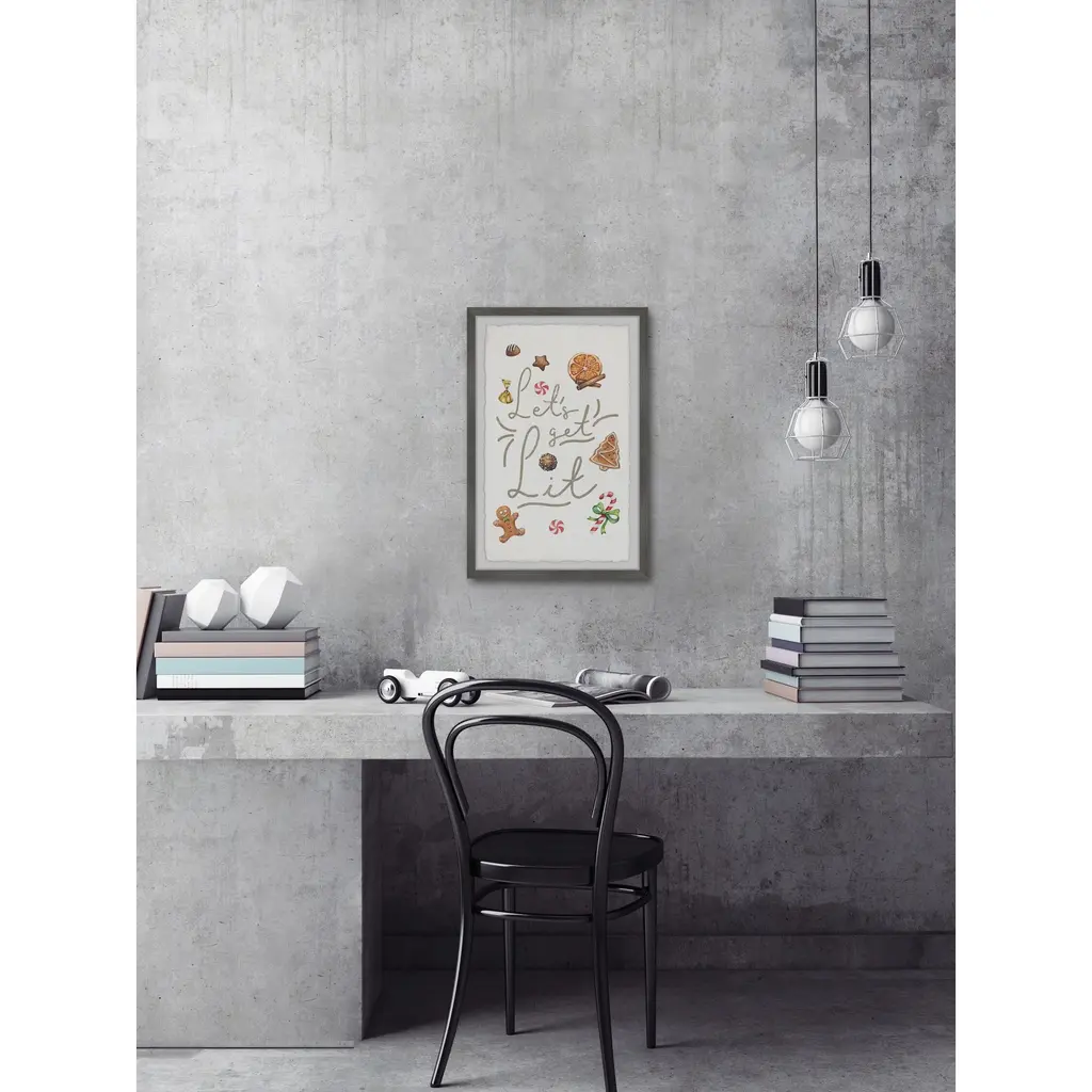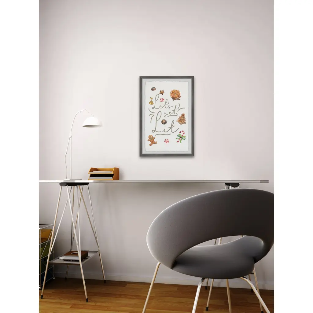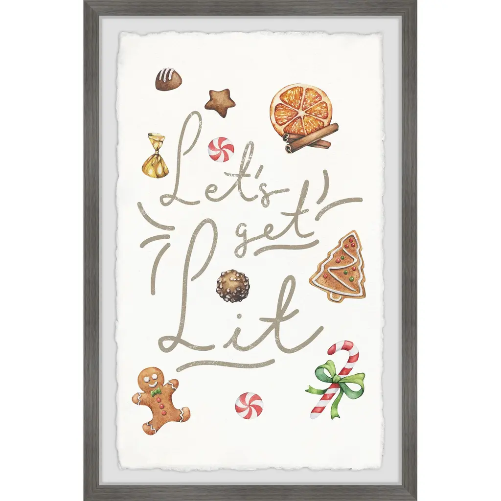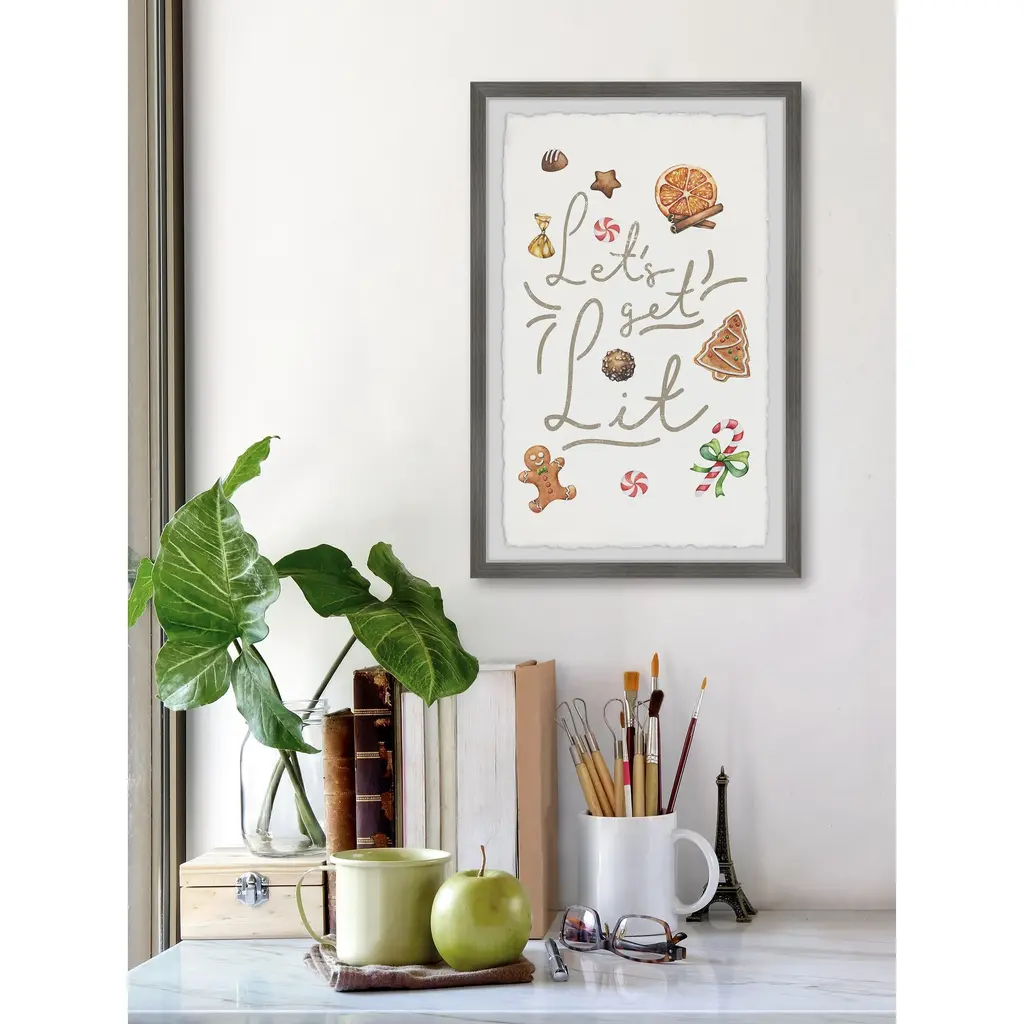 Perfect for both fall and winter, this watercolor painting print features various Christmas treats and cursive text that says, "Let's get lit." Proudly printed in the USA, this piece is printed on high quality archive paper and professionally hand-framed. With wall-mounting hooks included, this artful accent is ready to hang up as soon as it reaches your front door. • Top quality Giclee print on high resolution Archive Paper • Hand cut deckled edges • High quality durable non-warping frame • Finished under shatter resistant plexiglass • Arrives ready to hang • Includes a certificate of authenticity • Printed in the USA