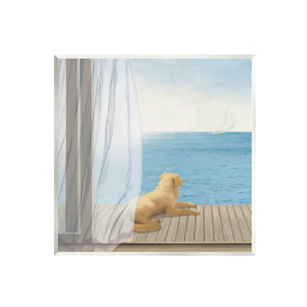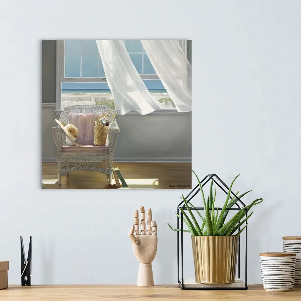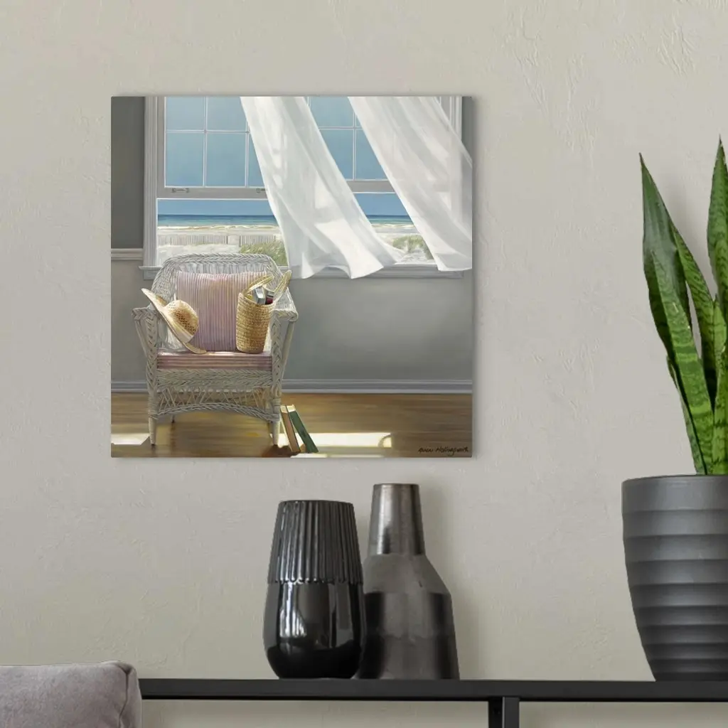 Contemporary painting of a chair sitting in a sunlit room, with an open window and drapes being blown in the wind.