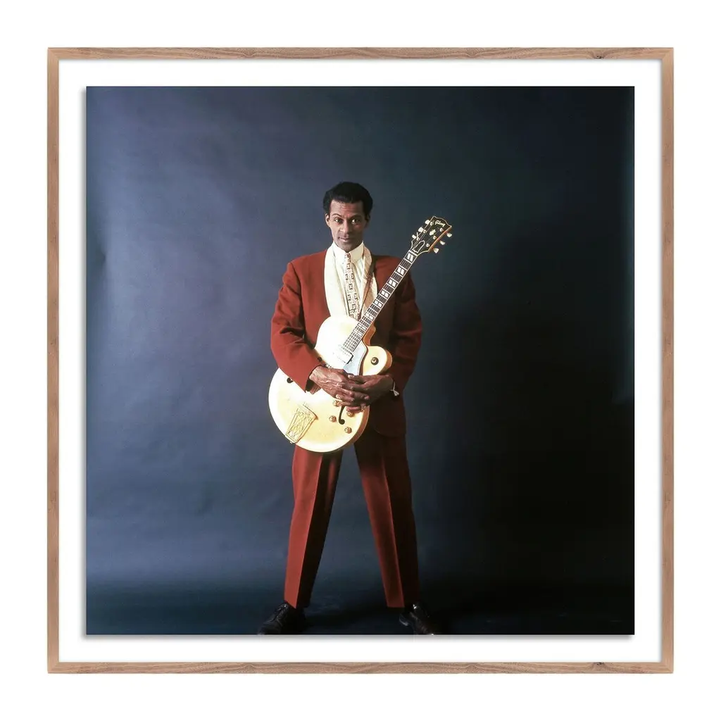 Rock and roll icon Chuck Berry poses for his portrait in 1958 in Chicago, Illinois. Courtesy of Getty Images. Printed on premium photo paper and float-mounted within a high-quality frame. Handmade in Austin, Texas, each print includes a certificate of authenticity commemorating the exclusive partnership between Getty Images and Four Hands Art Studio.
